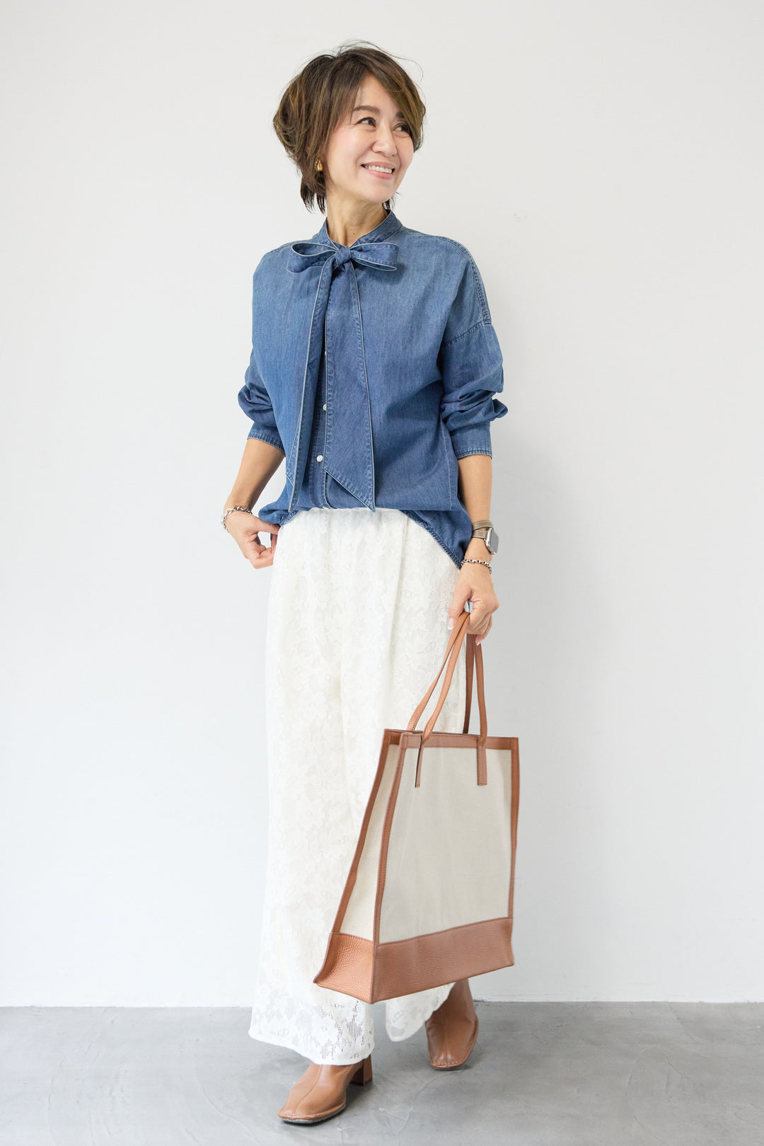 [SET]ボウタイデニムシャツ+フラワーエンブロイダリーワイドパンツ(2set)