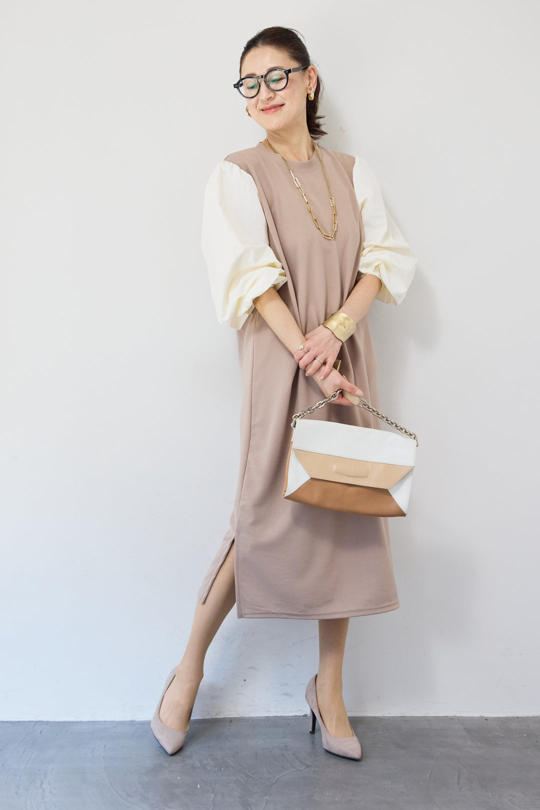 バルーンスリーブ配色ワンピース