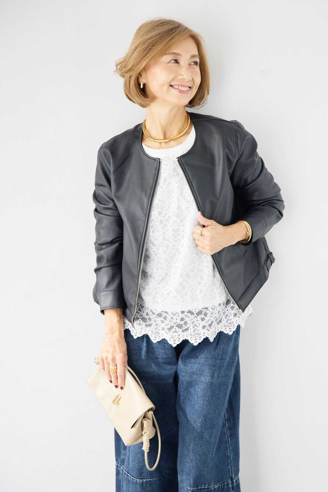 [SET]フェイクレザーノーカラージャケット+スカラップヘム レースシアーブラウス(2set)