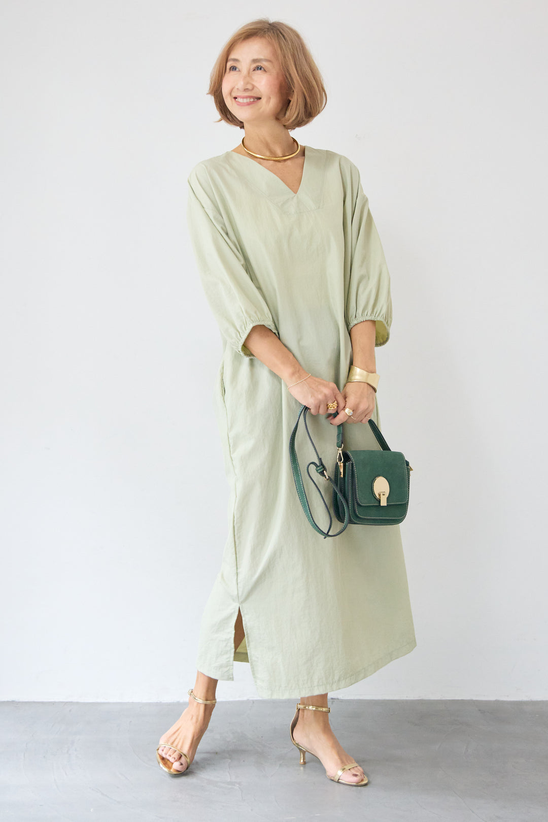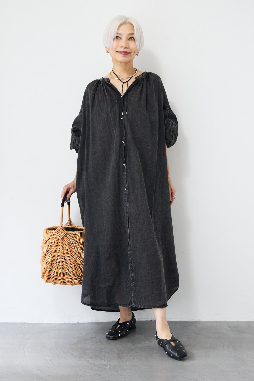 ワッシャー加工 Vネック パフスリーブ ロングワンピース