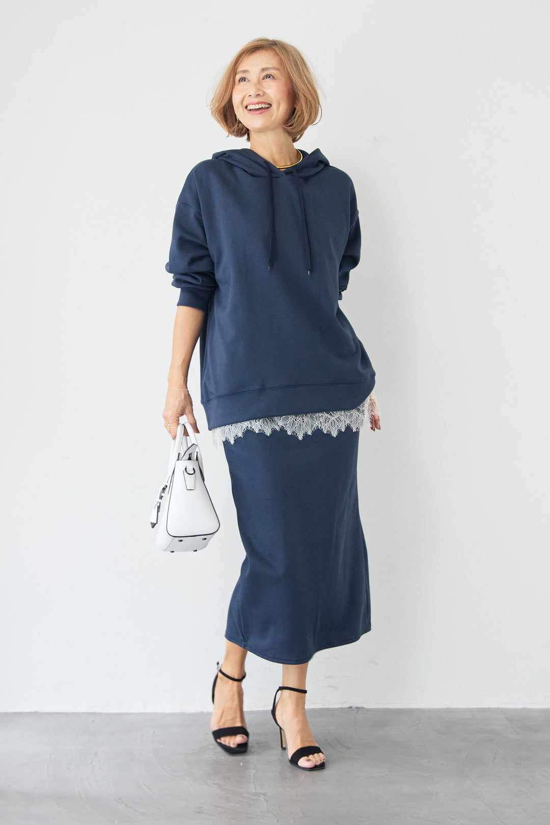 [SET]フーディパーカー&タイトスカート セットアップ+シルキーエリュール レースキャミソール(2set)