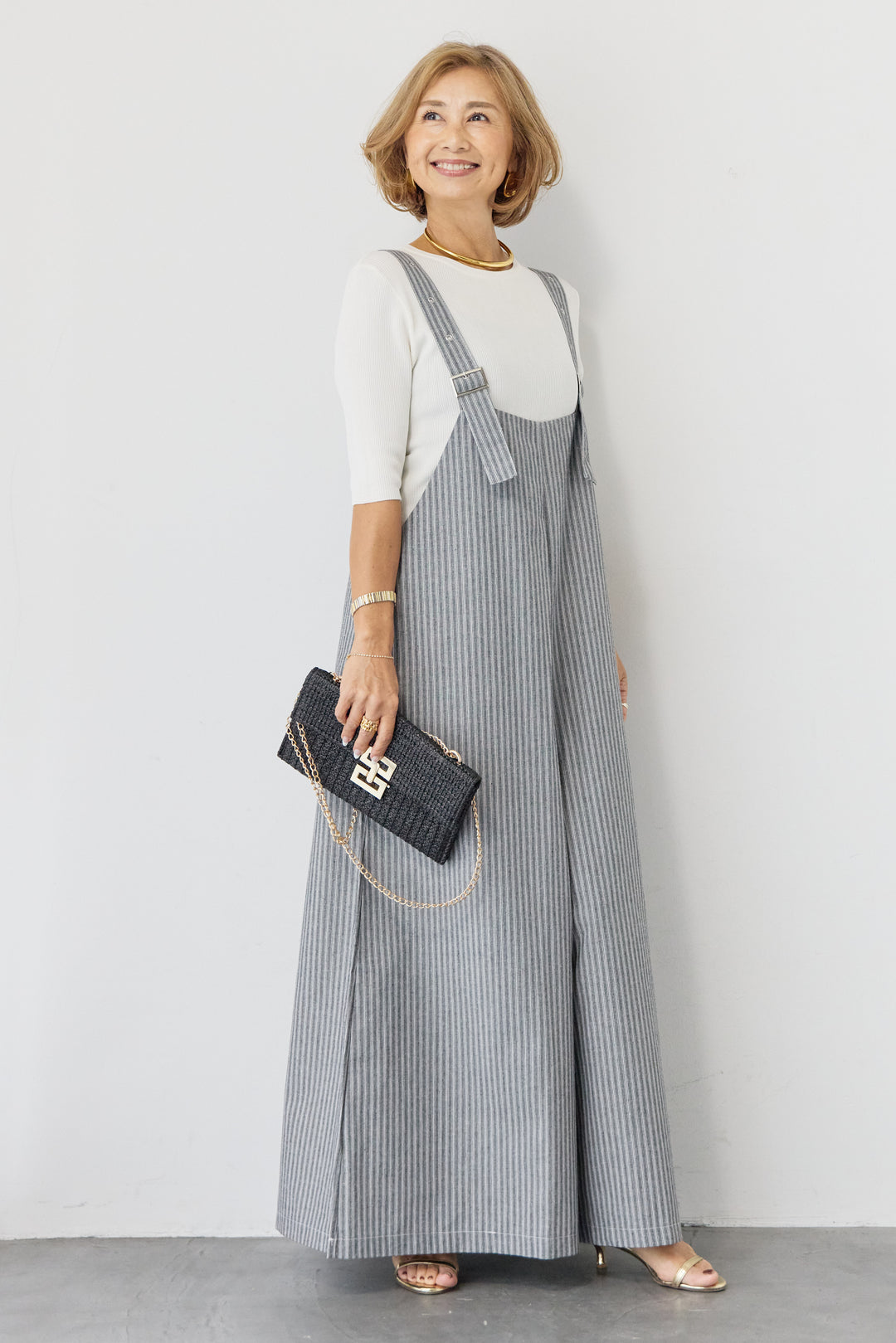 ストライプ ワイドサロペットワンピース