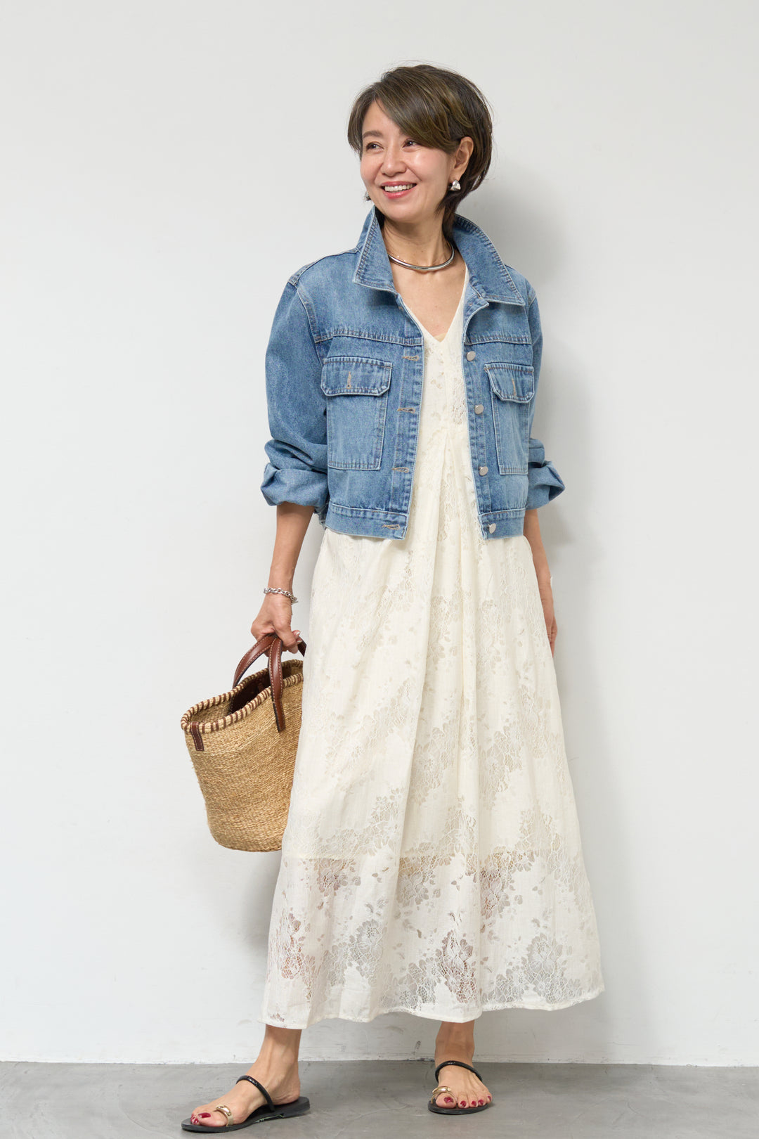 [SET]スカラップヘム レースシアーブラウス+ワークテイストデニムオールインワン(2set)