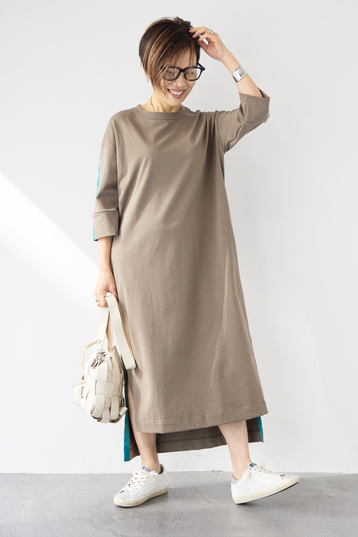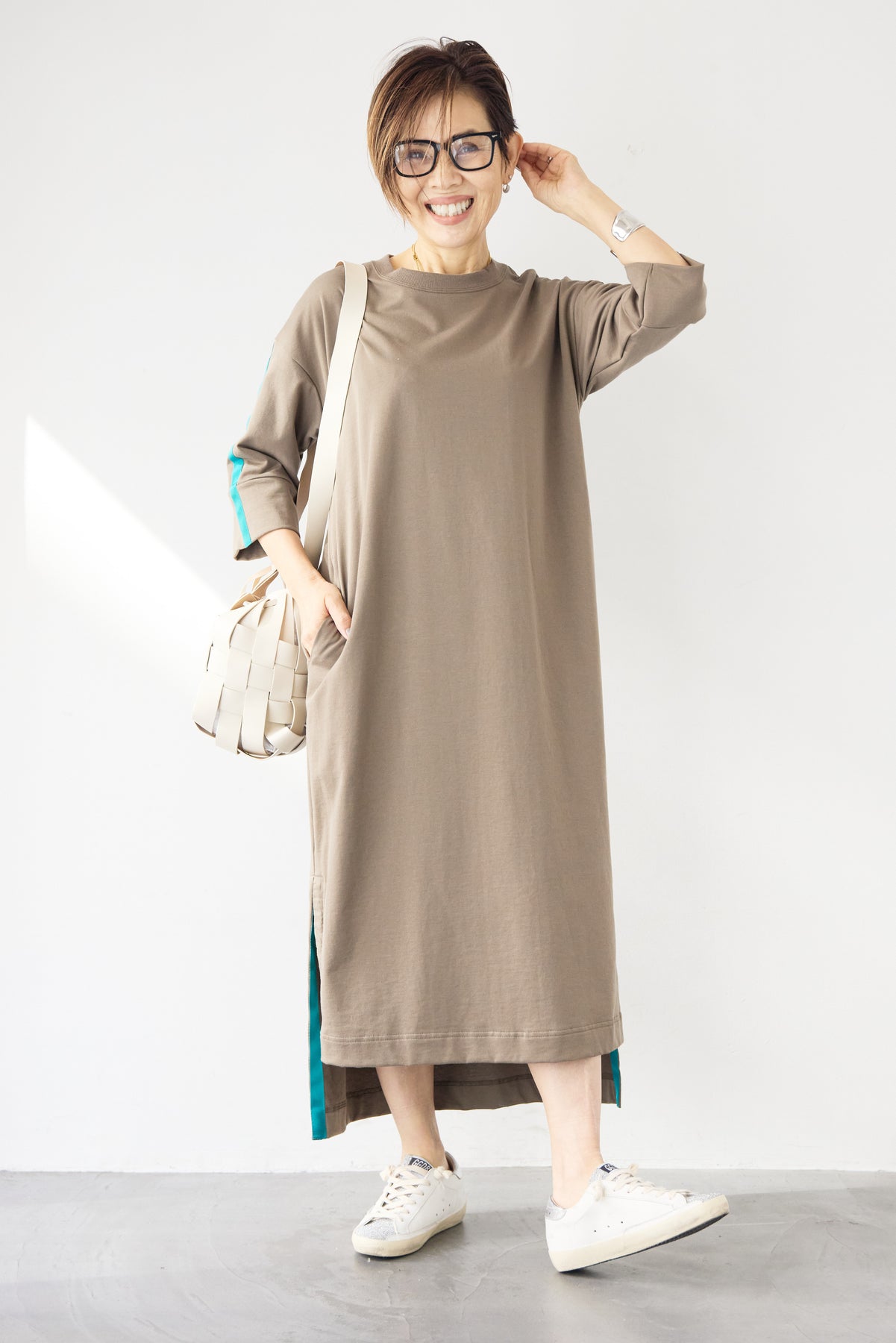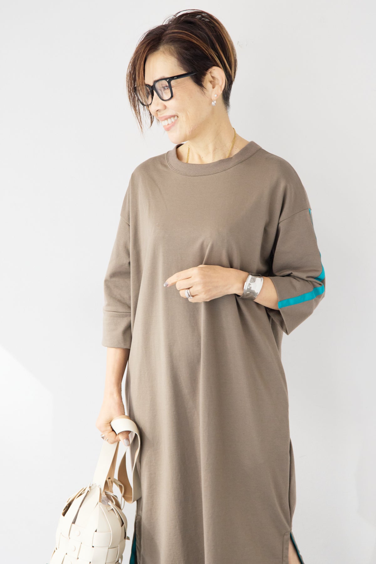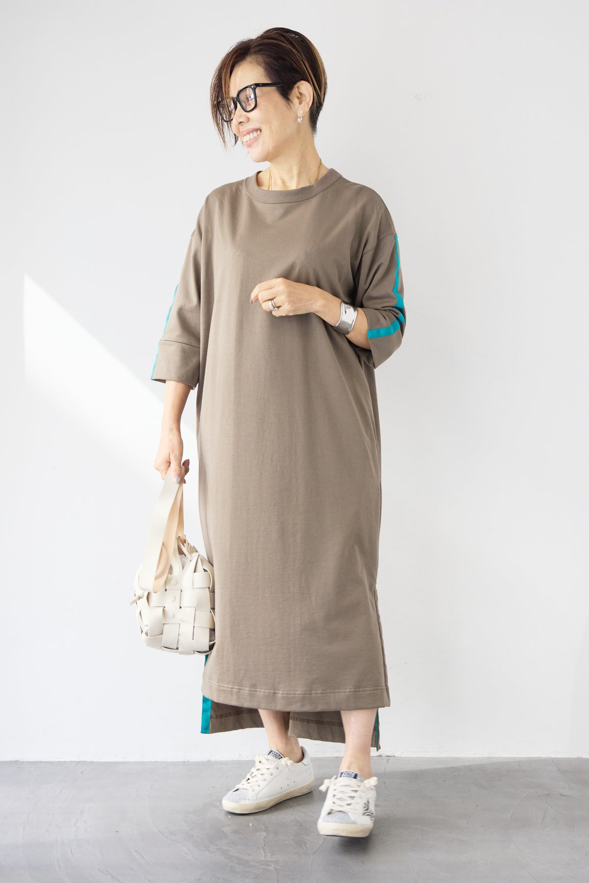 シンプルな中にアクセントを効かせた、大人のカジュアルワンピース。程よいハリと柔らかさを兼ね備えたカットソー素材で、ストレスフリーな着心地を実現しました。袖から裾スリットへと続く配色テープラインが縦のラインを強調し、すっきりとした印象に。ゆとりのあるシルエットながら、Iラインでスタイルアップ効果も期待できます。両サイドには実用的なポケット付き。深めのスリットが足さばきを良くし、パンツやレギンスとのレイヤードも楽しめます。1枚でさらっと着るだけでコーデが完成する、デイリーに活躍するアイテムです。