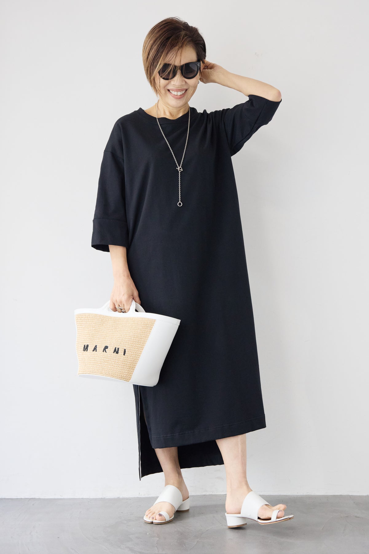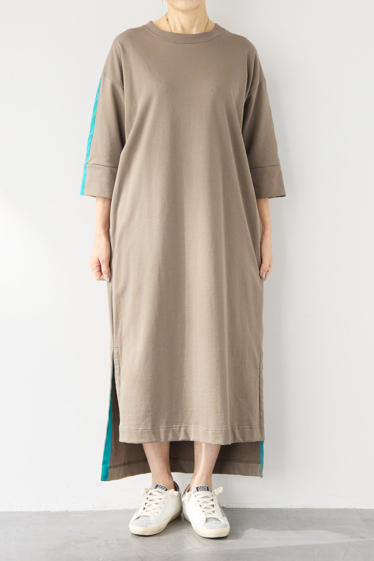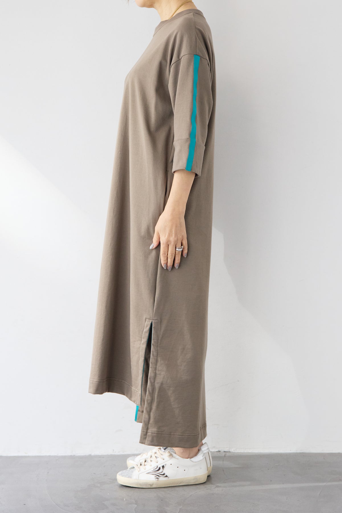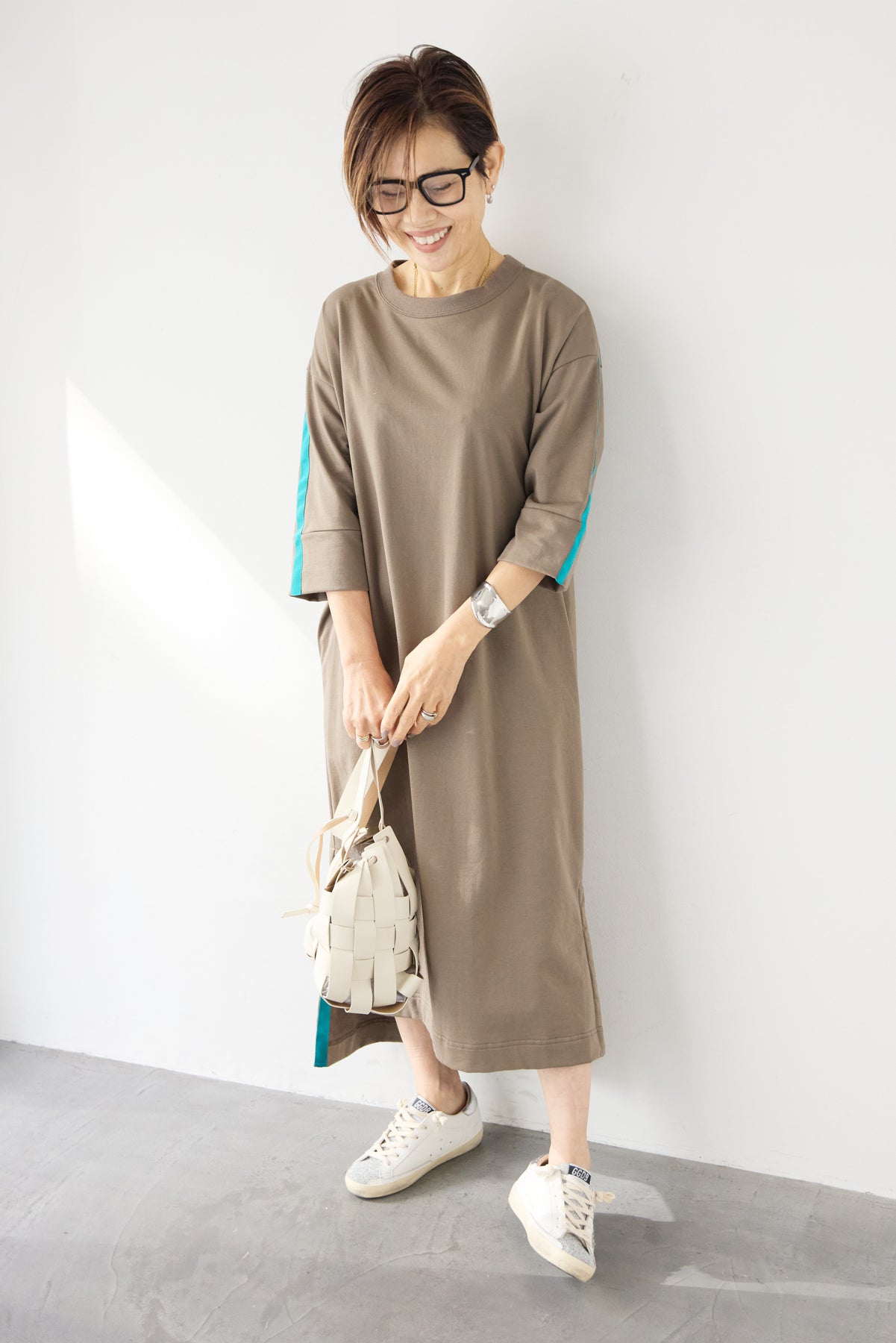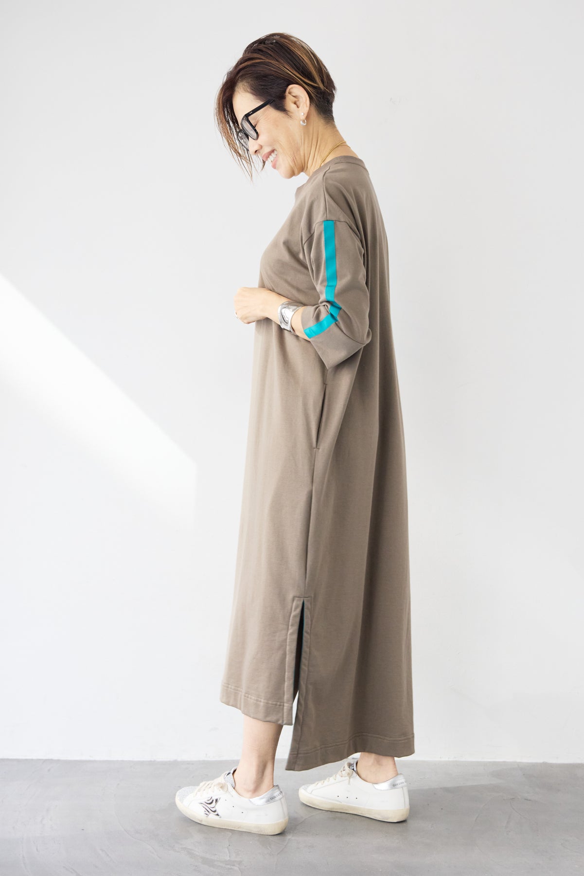 シンプルな中にアクセントを効かせた、大人のカジュアルワンピース。程よいハリと柔らかさを兼ね備えたカットソー素材で、ストレスフリーな着心地を実現しました。袖から裾スリットへと続く配色テープラインが縦のラインを強調し、すっきりとした印象に。ゆとりのあるシルエットながら、Iラインでスタイルアップ効果も期待できます。両サイドには実用的なポケット付き。深めのスリットが足さばきを良くし、パンツやレギンスとのレイヤードも楽しめます。1枚でさらっと着るだけでコーデが完成する、デイリーに活躍するアイテムです。