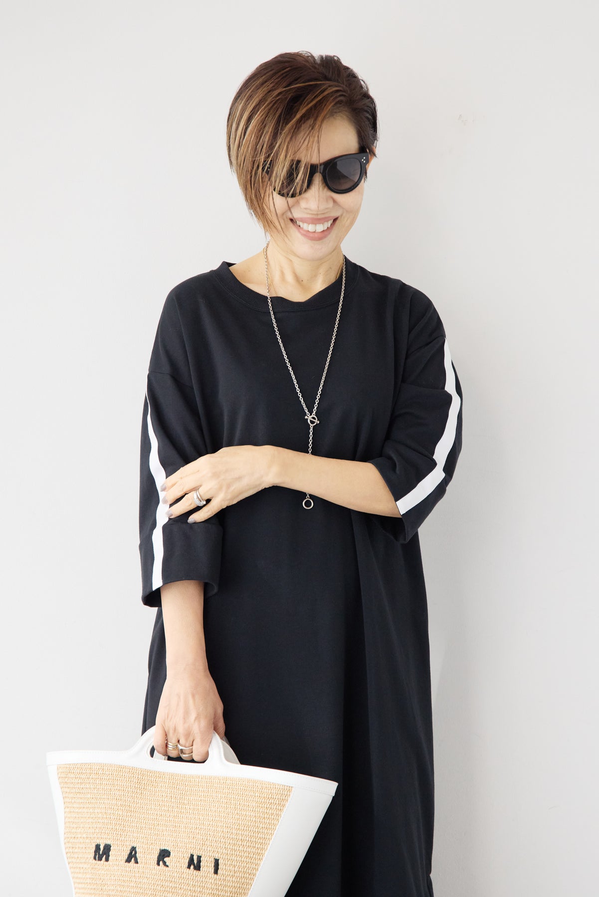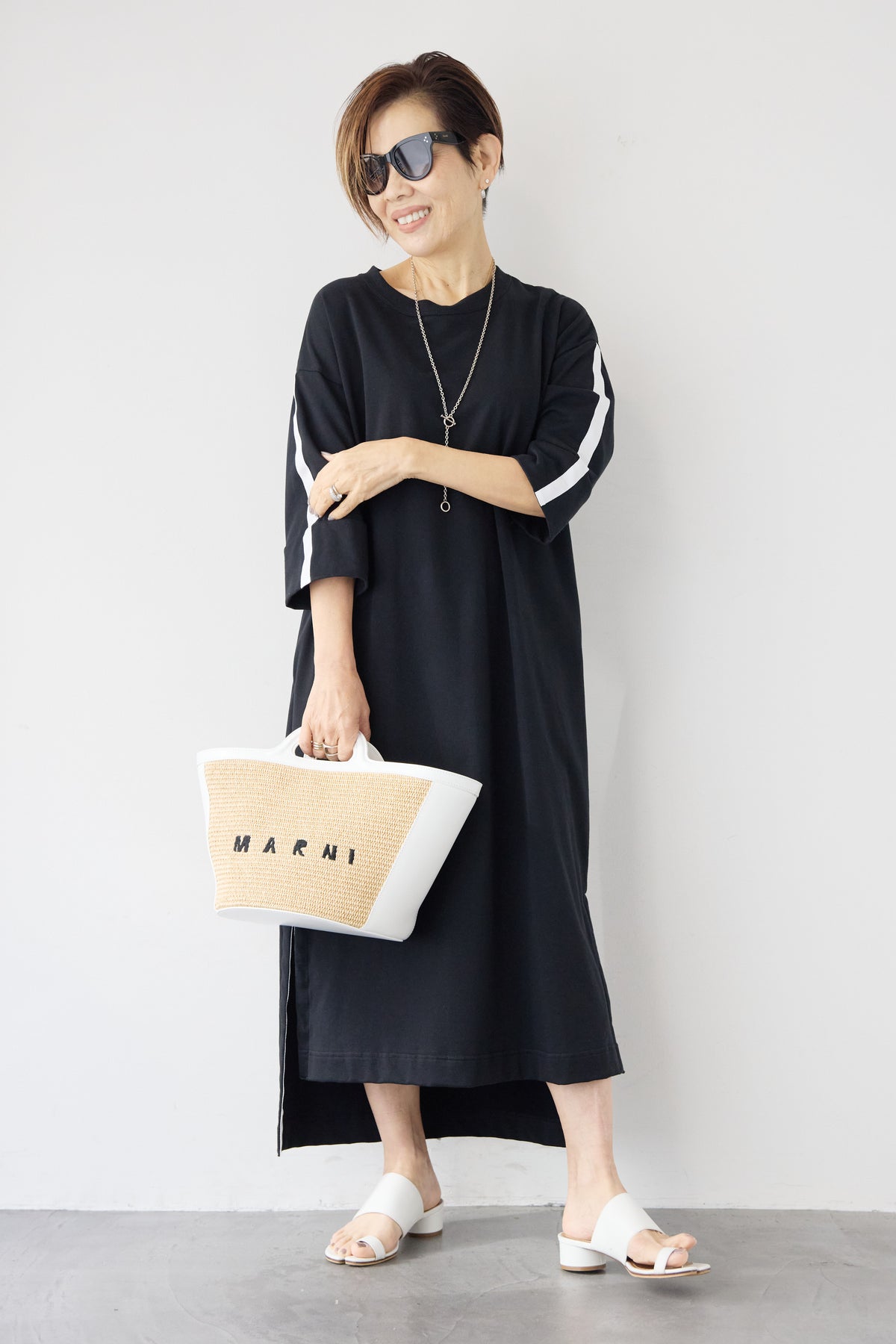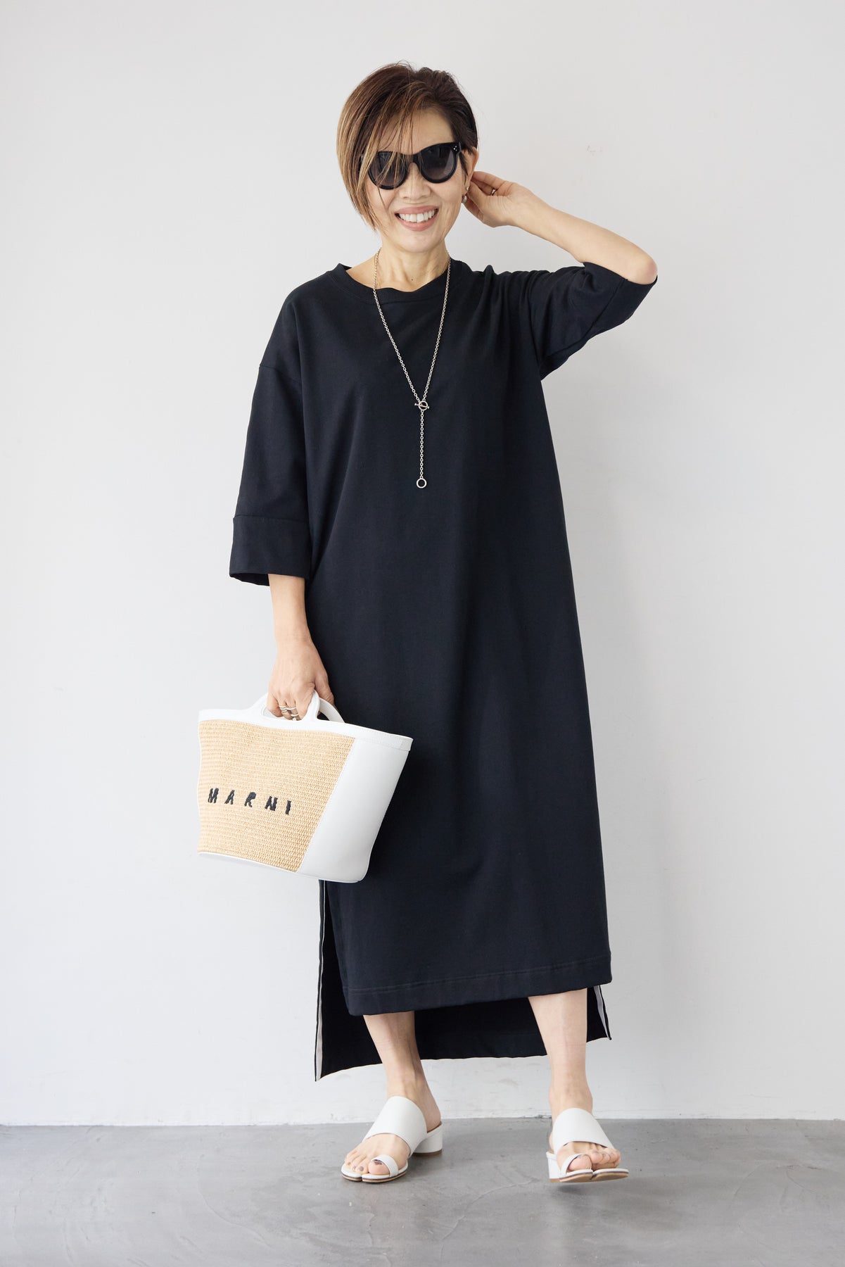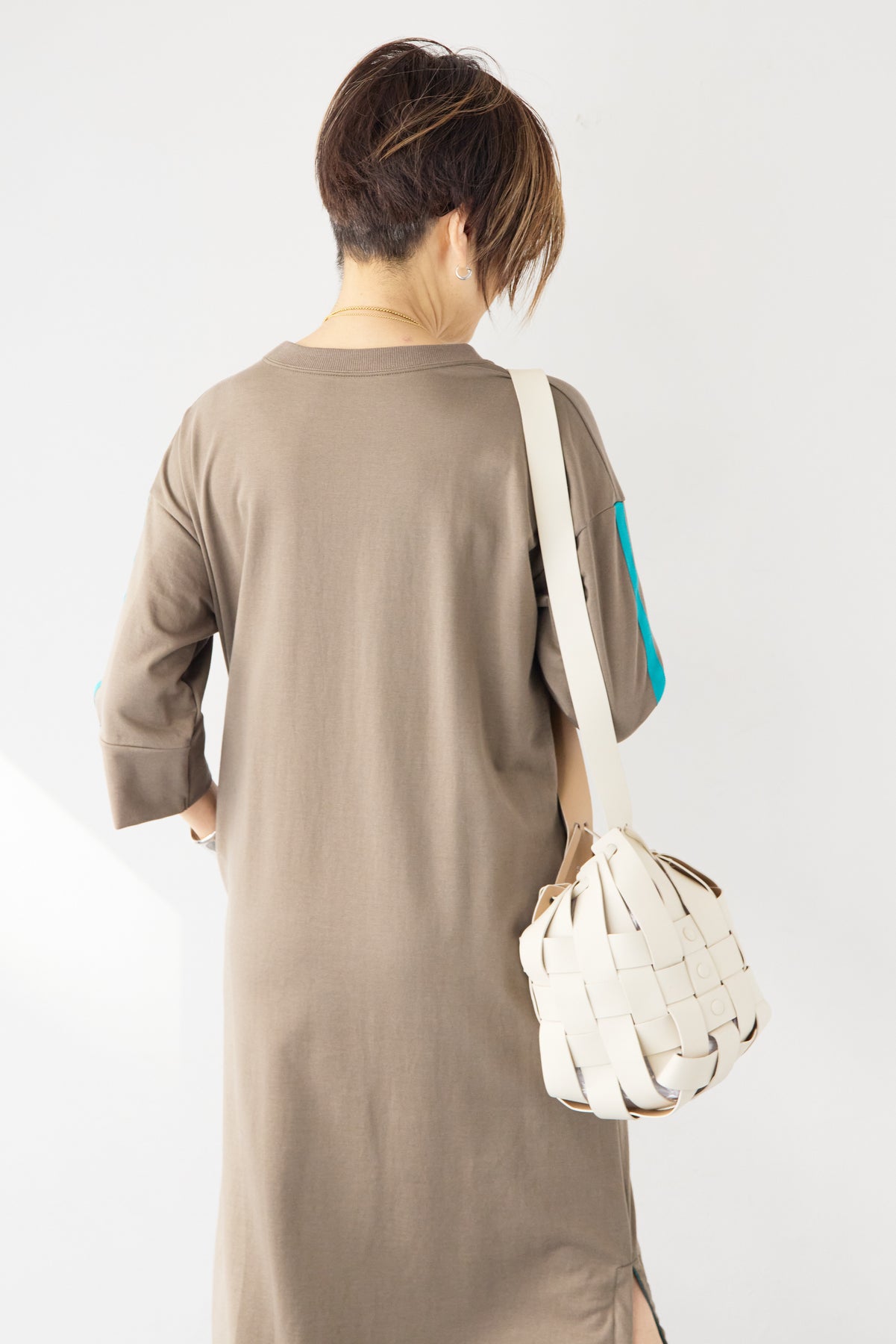 シンプルな中にアクセントを効かせた、大人のカジュアルワンピース。程よいハリと柔らかさを兼ね備えたカットソー素材で、ストレスフリーな着心地を実現しました。袖から裾スリットへと続く配色テープラインが縦のラインを強調し、すっきりとした印象に。ゆとりのあるシルエットながら、Iラインでスタイルアップ効果も期待できます。両サイドには実用的なポケット付き。深めのスリットが足さばきを良くし、パンツやレギンスとのレイヤードも楽しめます。1枚でさらっと着るだけでコーデが完成する、デイリーに活躍するアイテムです。