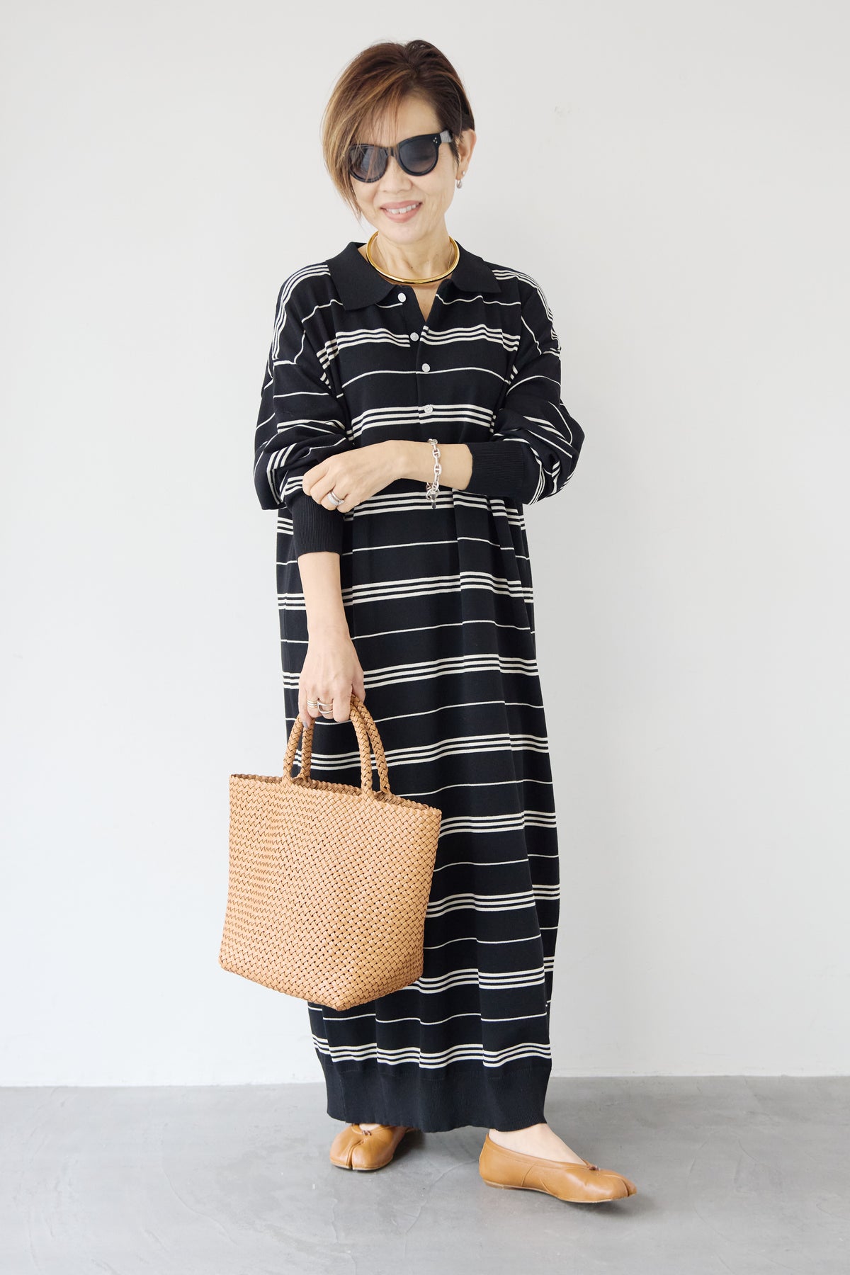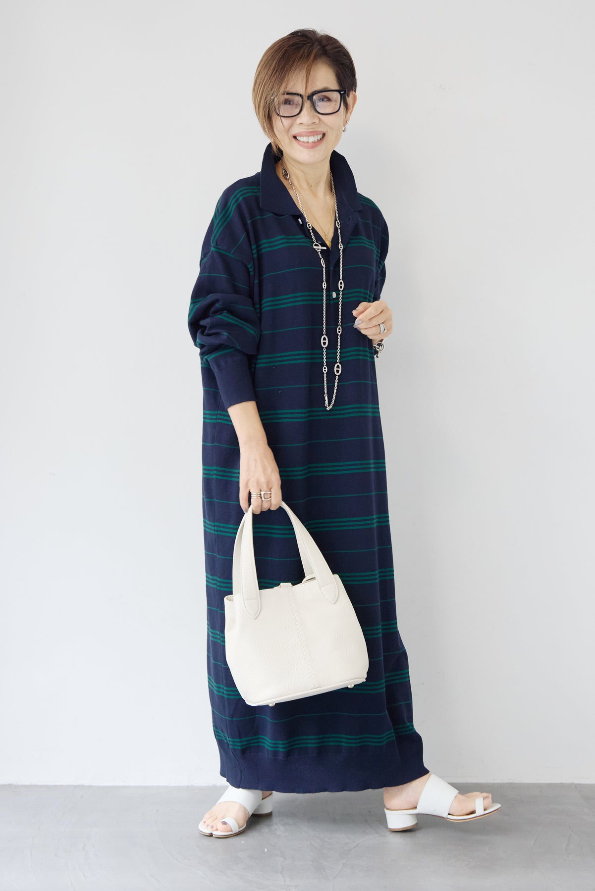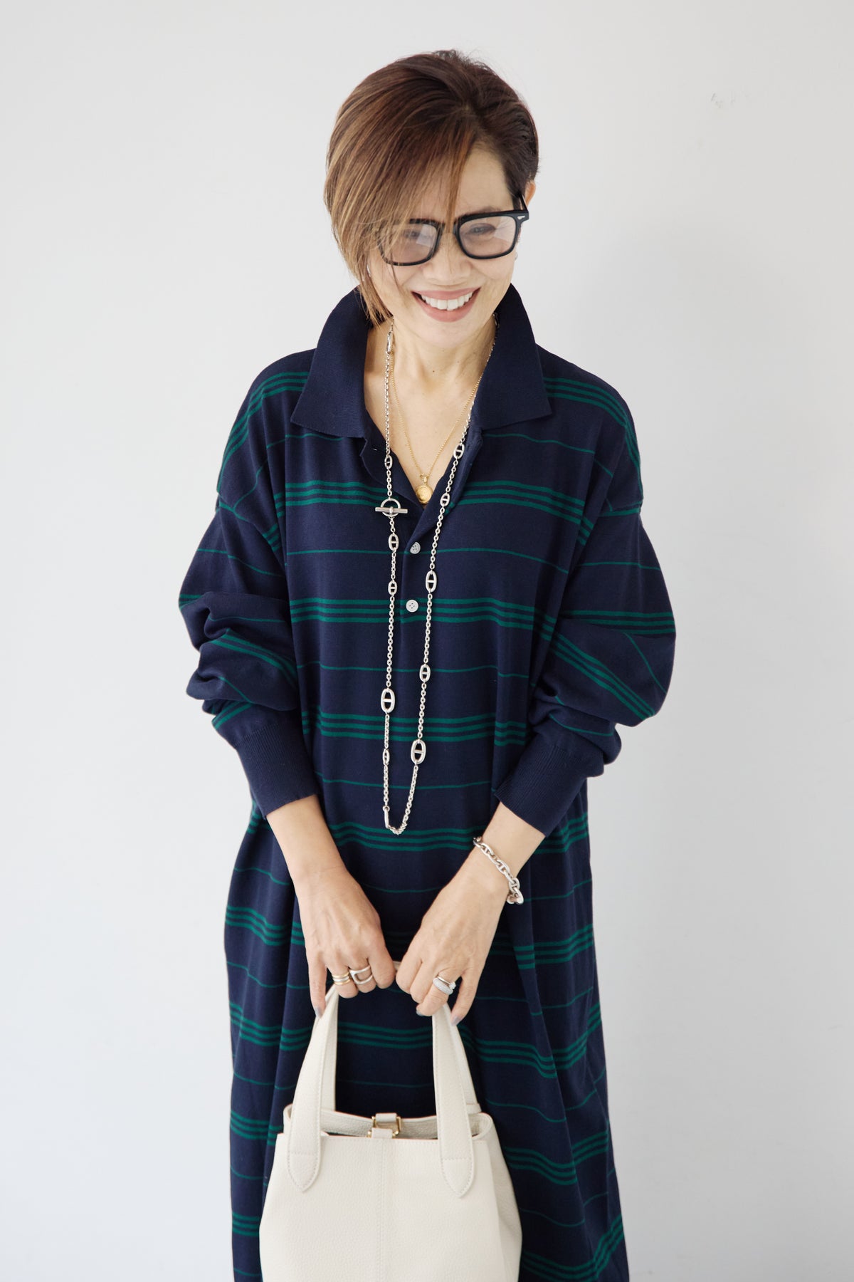 マルチボーダーが映える、リラックス感たっぷりのポロニットワンピース。ポロシャツディテールの襟と前立てが程よいきちんと感を添え、1枚でコーディネートが完成します。ゆったりとしたシルエットとドロップショルダーで身体のラインを拾わず、ストレスフリーな着心地。ロング丈ながら軽やかなニット素材で、シーズンを通して活躍します。袖口と裾のリブ切替が全体を引き締め、メリハリのある印象に。カジュアルなサンダル合わせはもちろん、スニーカーやローファーでトラッドに寄せたスタイリングもおすすめ。デイリーからお出かけまで幅広く活躍する一着です。