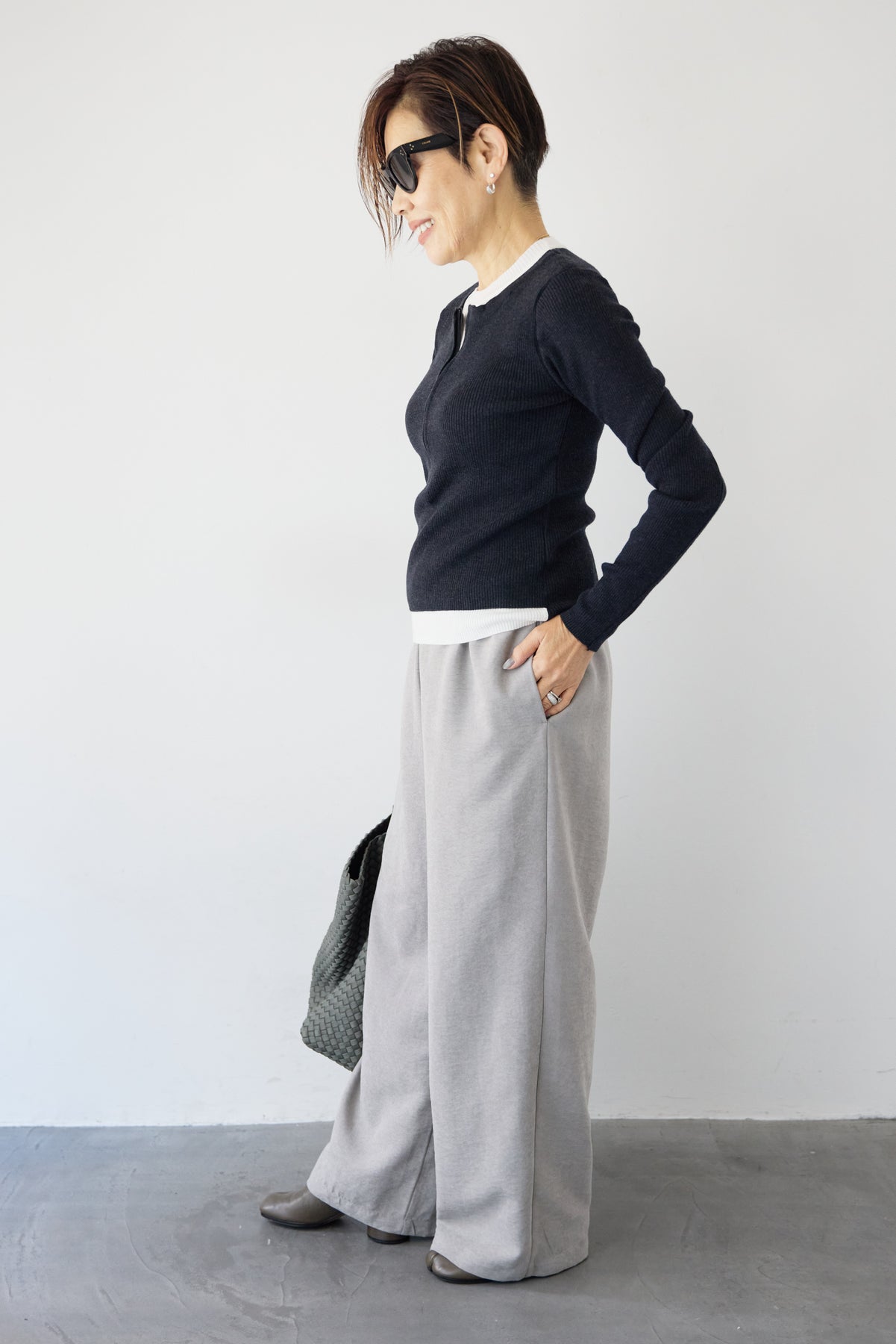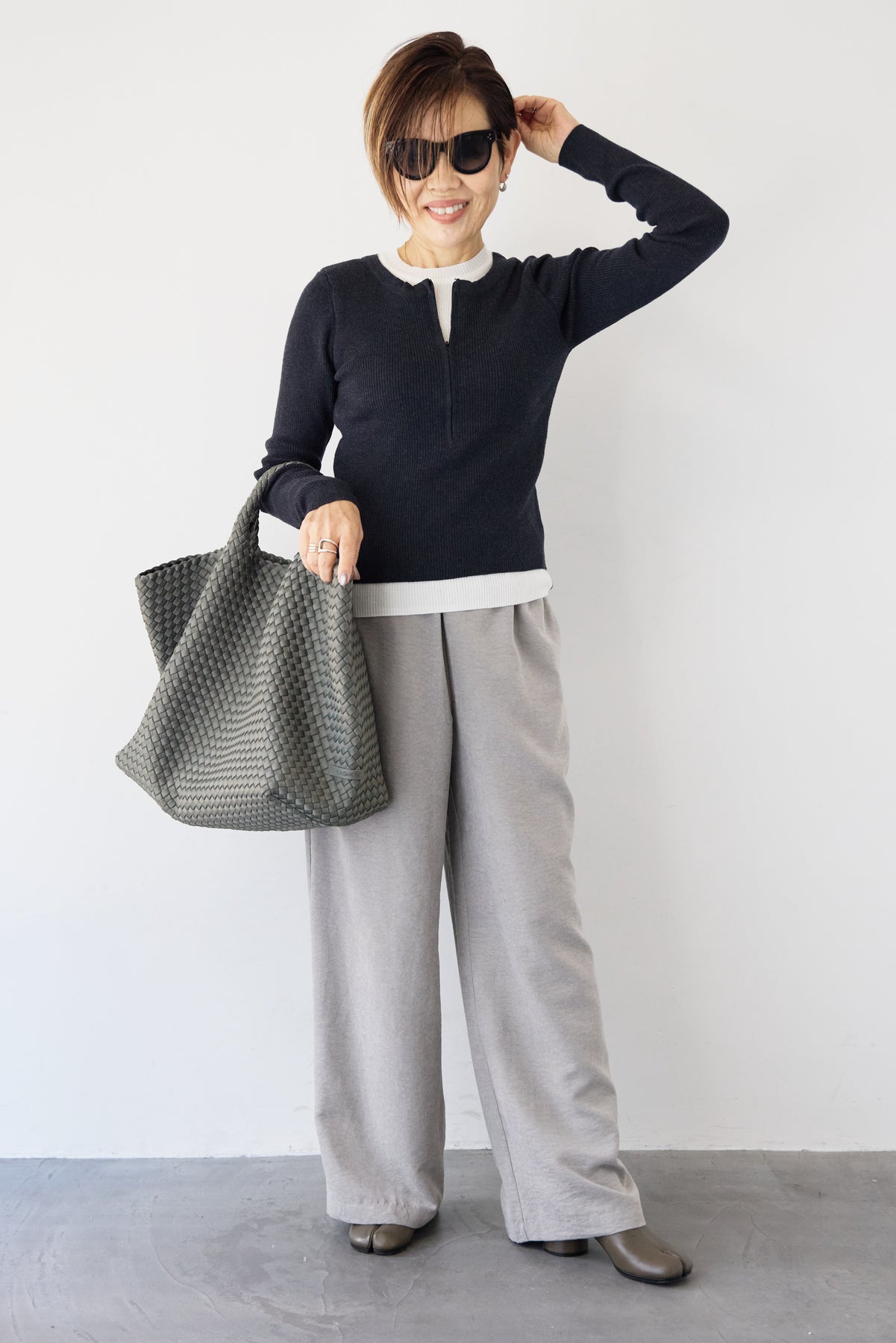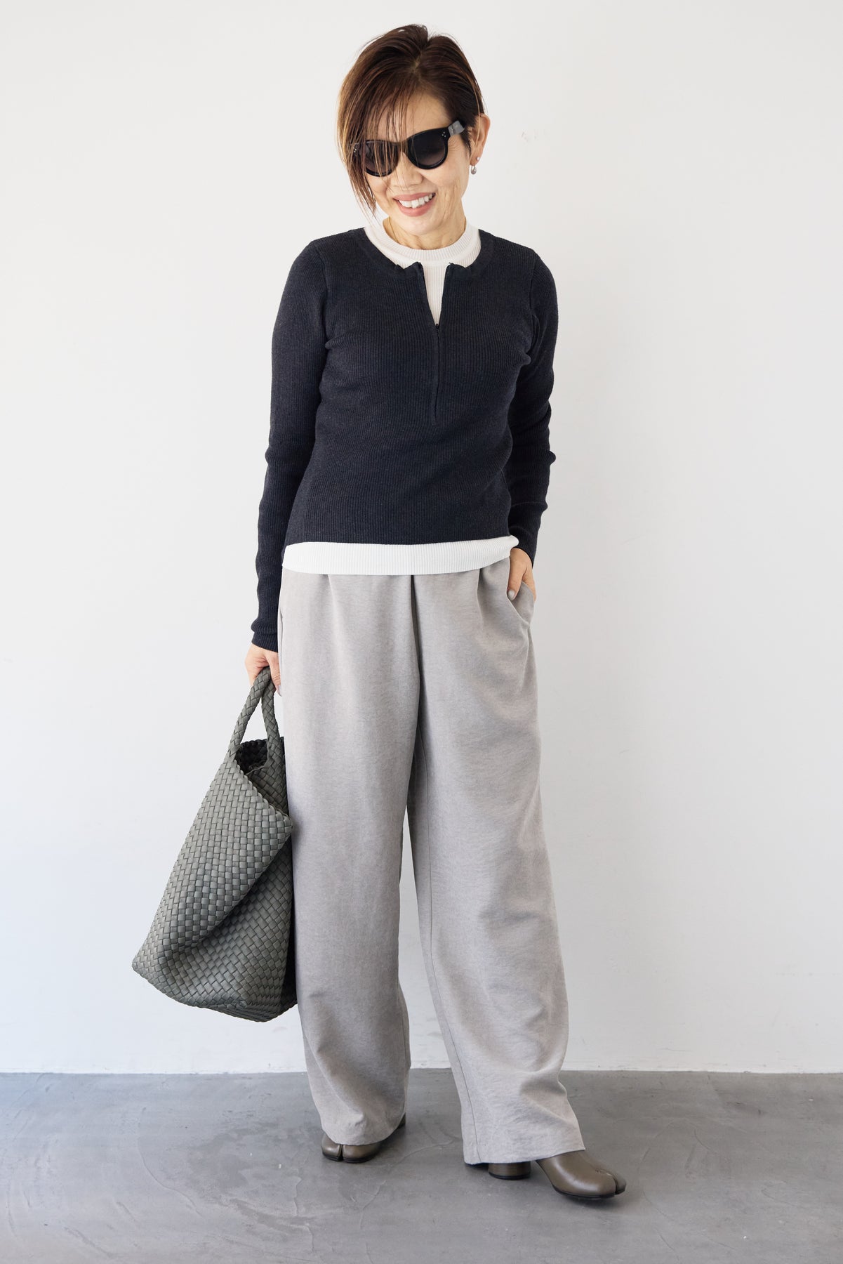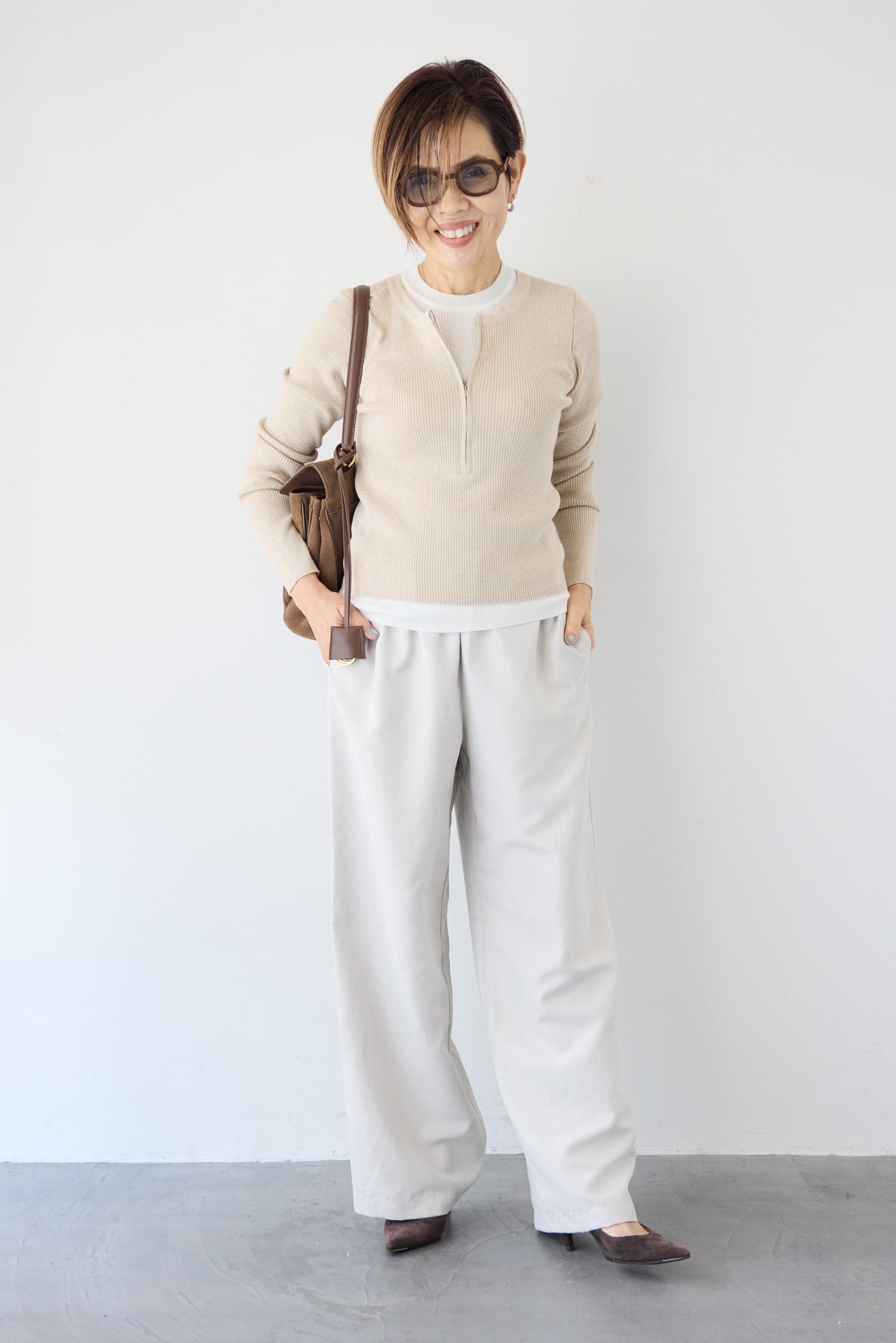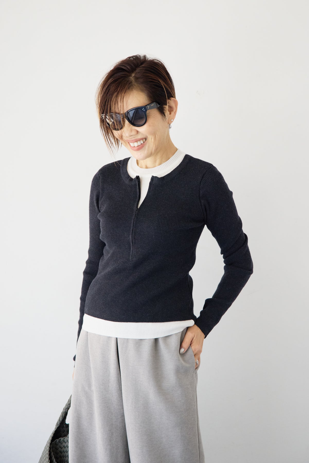 上品な配色レイヤードが目を惹く、大人のためのハーフジップリブニット。首元と裾に配した配色リブがインナーを重ねたような奥行きを生み、シンプルながら洗練された印象に仕上げました。縦ラインを強調する細リブ編みはすっきり見えと程よいフィット感を両立し、女性らしいシルエットを演出します。 フロントのハーフジップは開閉で表情を変えられ、首元の抜け感アレンジも自在。ジャケットやコートのインにも収まりやすい厚みで、きれいめにもカジュアルにも着回せる万能アイテムです。