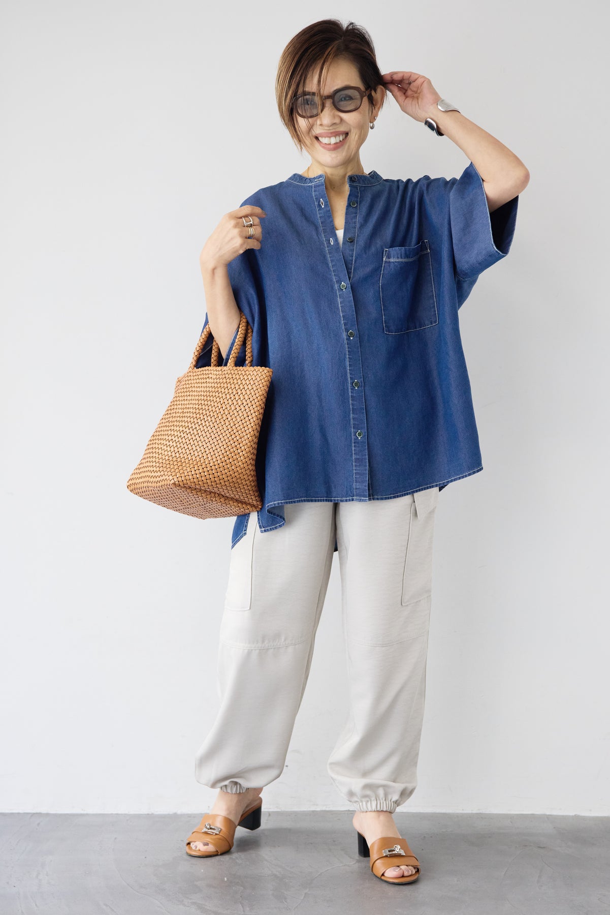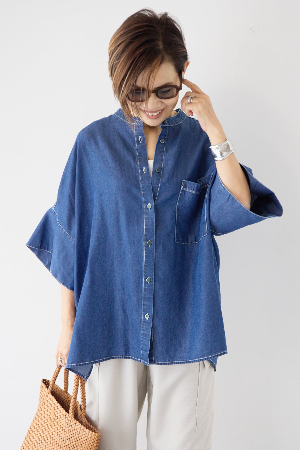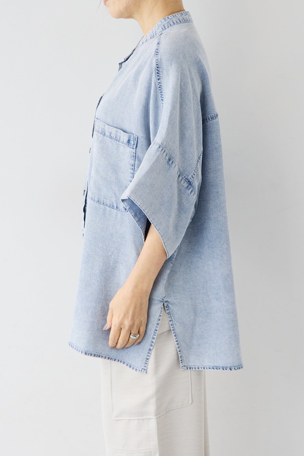 やわらかな落ち感と軽やかな着心地が魅力の「シルクライクデニムオーバーシャツ」。シルクのようにしなやかなタッチの薄手デニム素材を使用し、カジュアルながら上品な印象に仕上げました。ゆったりとしたオーバーシルエットとドルマン風の袖が体のラインを拾わず、リラックス感のある着用感。バンドカラーのすっきりした首元が大人らしい抜け感を演出します。サイドスリット入りで動きやすく、前開き仕様なので羽織りとしても活躍する万能アイテムです。パンツにもスカートにも合わせやすく、季節の変わり目から夏まで長く着回せる一枚です。