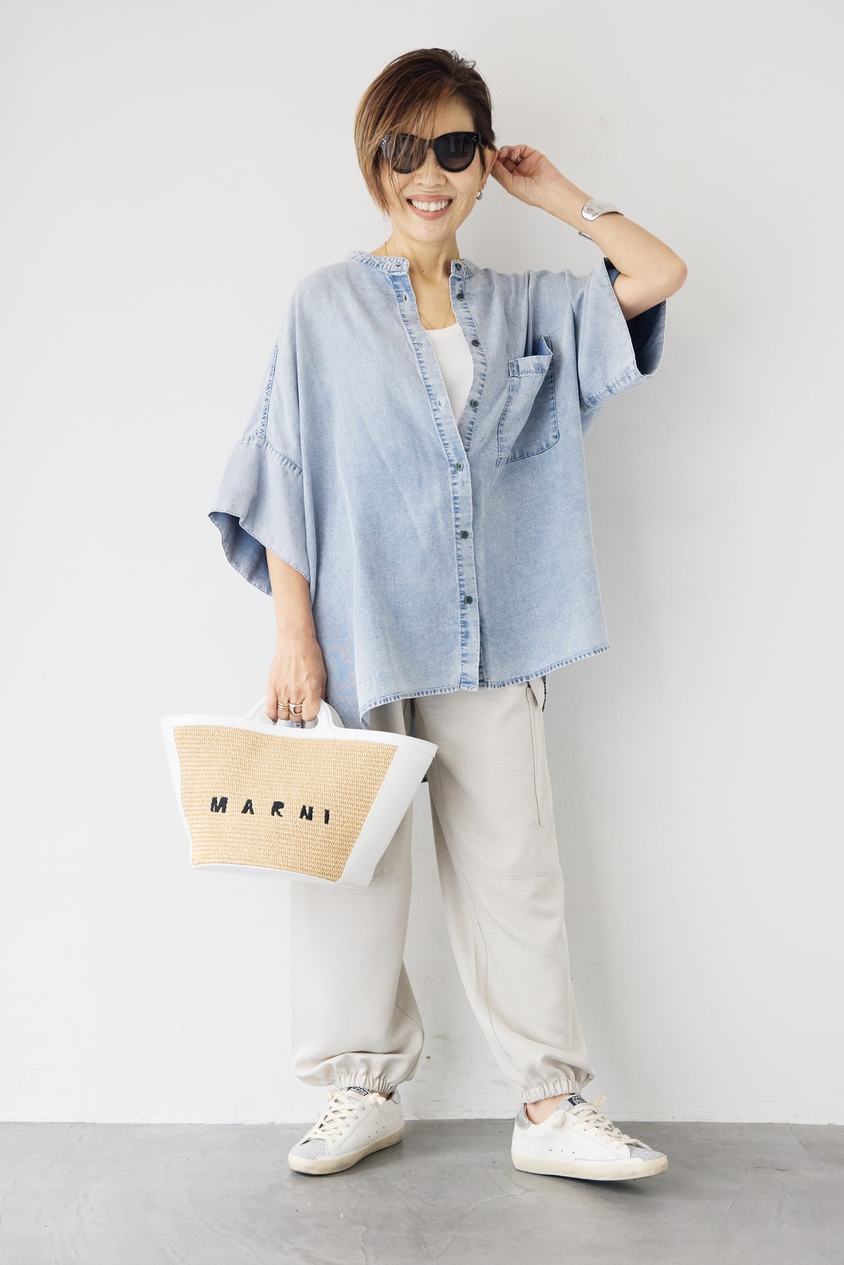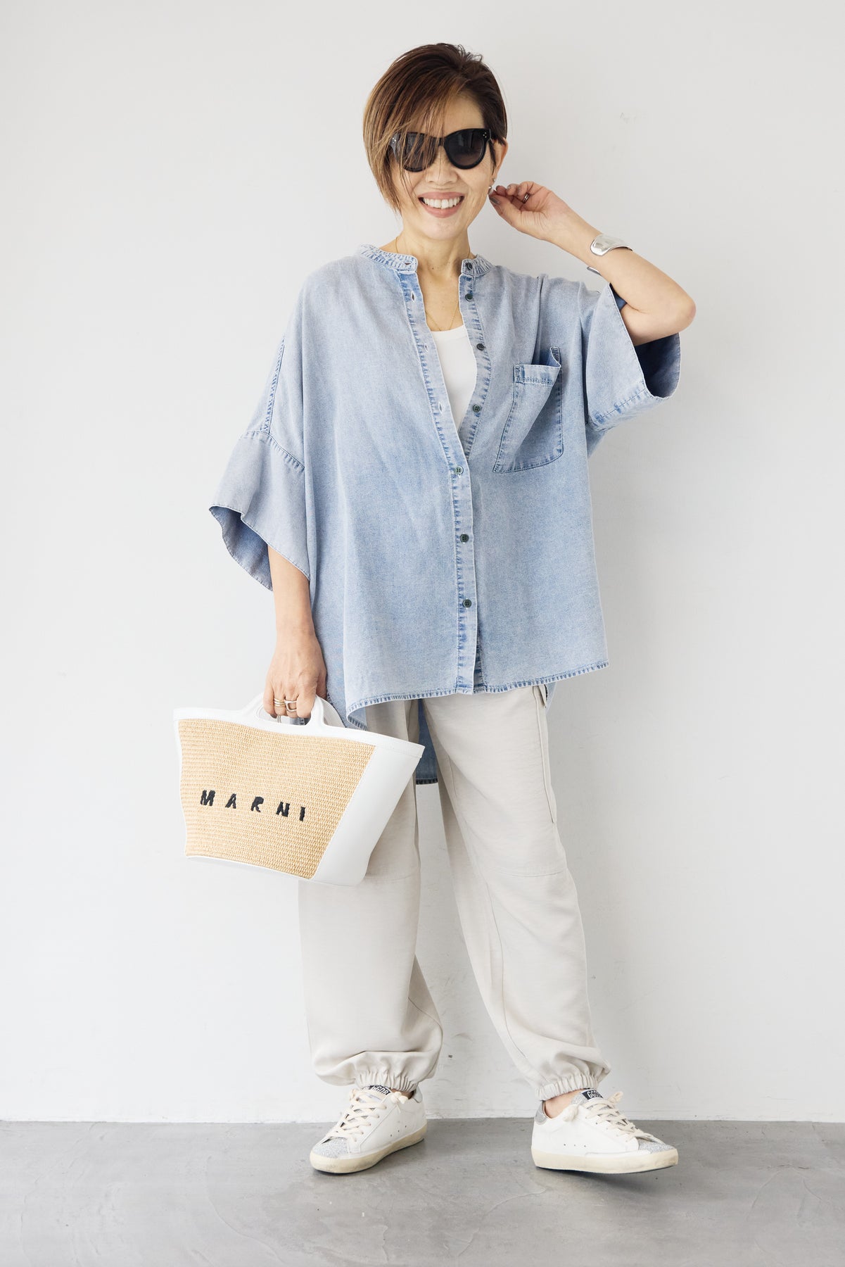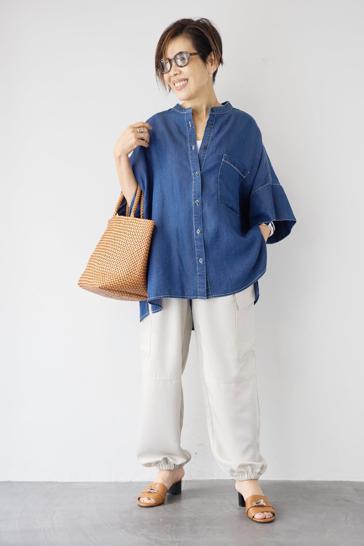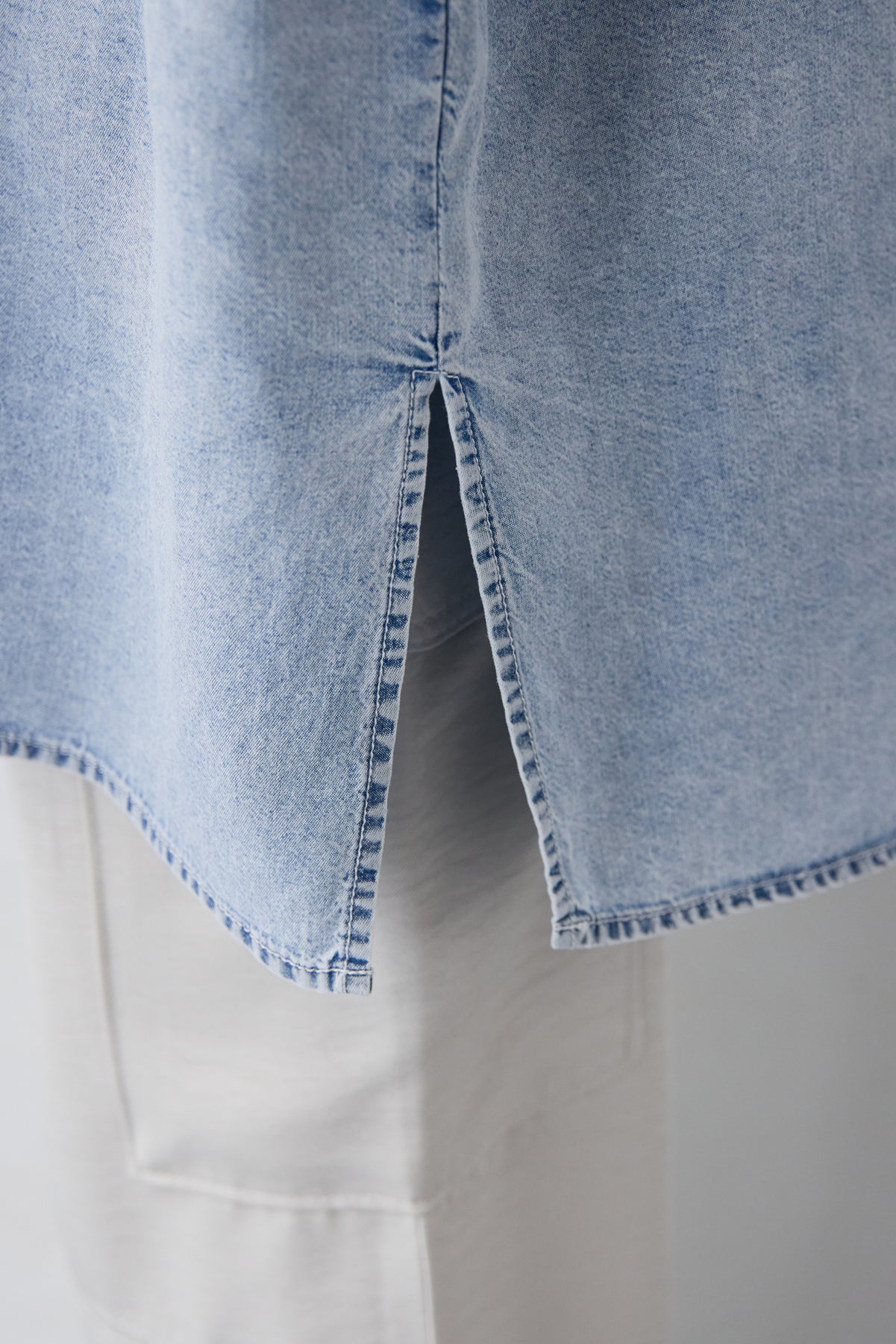 やわらかな落ち感と軽やかな着心地が魅力の「シルクライクデニムオーバーシャツ」。シルクのようにしなやかなタッチの薄手デニム素材を使用し、カジュアルながら上品な印象に仕上げました。ゆったりとしたオーバーシルエットとドルマン風の袖が体のラインを拾わず、リラックス感のある着用感。バンドカラーのすっきりした首元が大人らしい抜け感を演出します。サイドスリット入りで動きやすく、前開き仕様なので羽織りとしても活躍する万能アイテムです。パンツにもスカートにも合わせやすく、季節の変わり目から夏まで長く着回せる一枚です。
