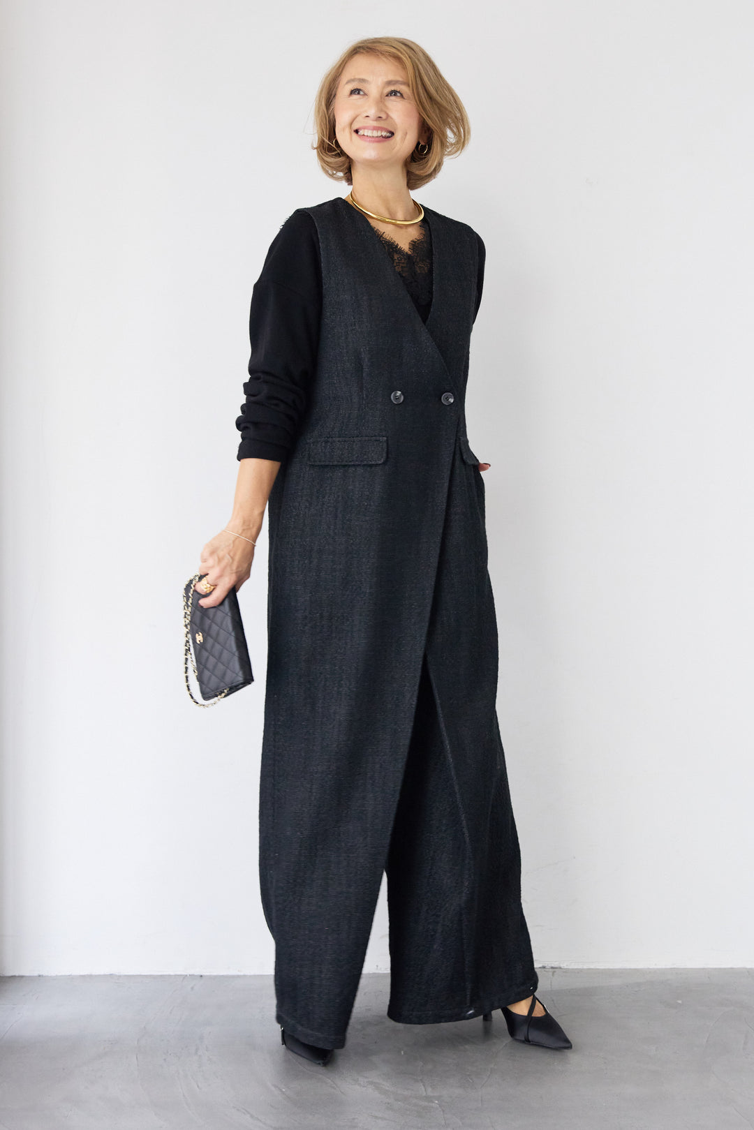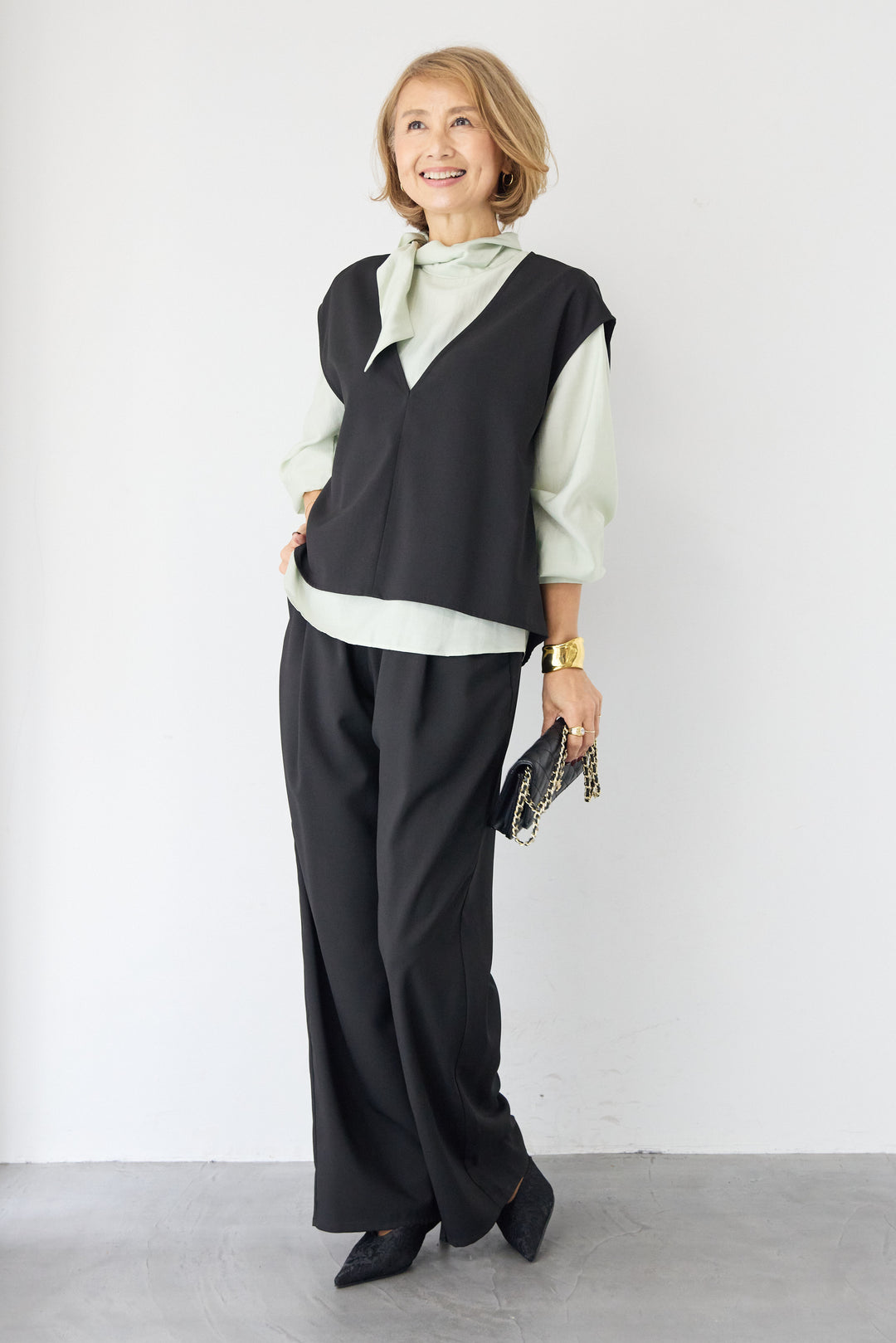 【2セットアップ】Vネックショートベスト × イージーワイドパンツ