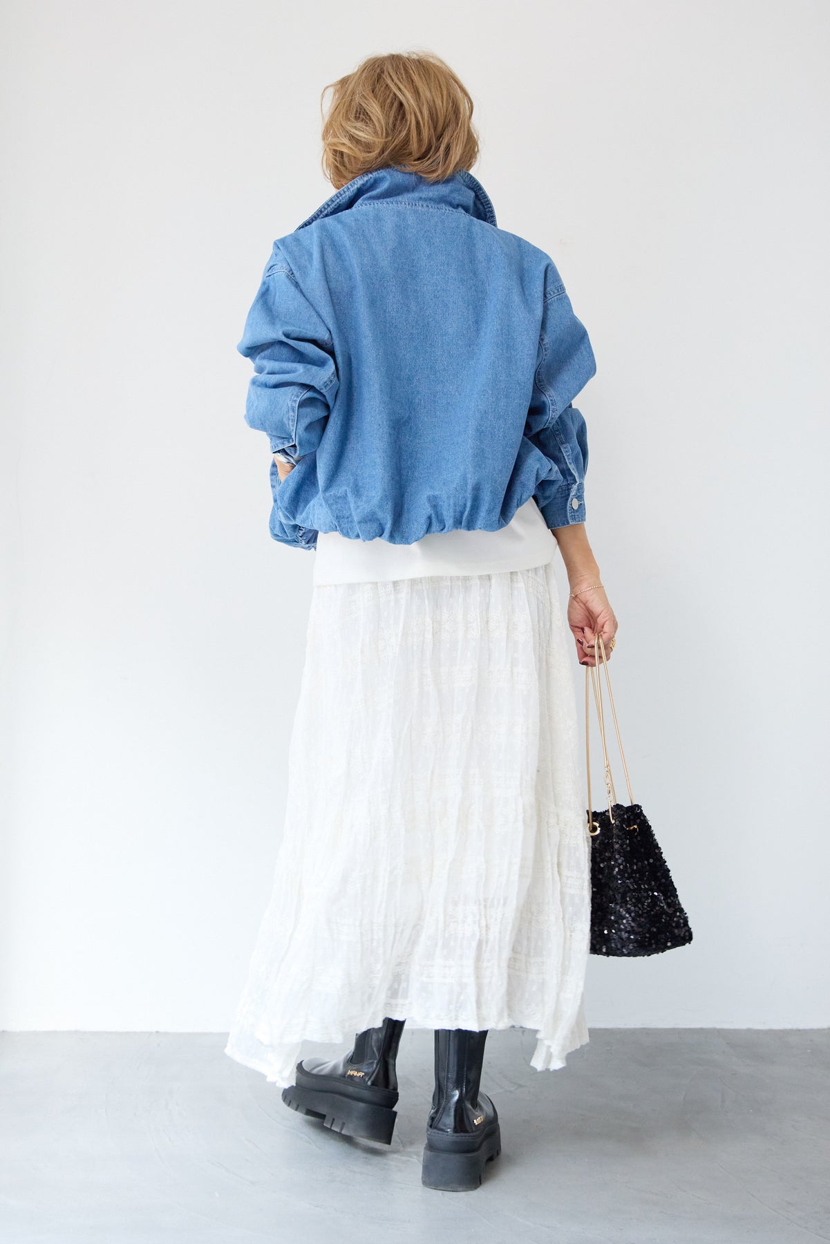 甘めのレーススカートやチュールスカートと合わせた「甘辛ミックス」なスタイルは特におすすめです。ショート丈なので、ハイウエストのボトムスやワンピースともバランスが取りやすく、スタイルアップを叶えてくれます。