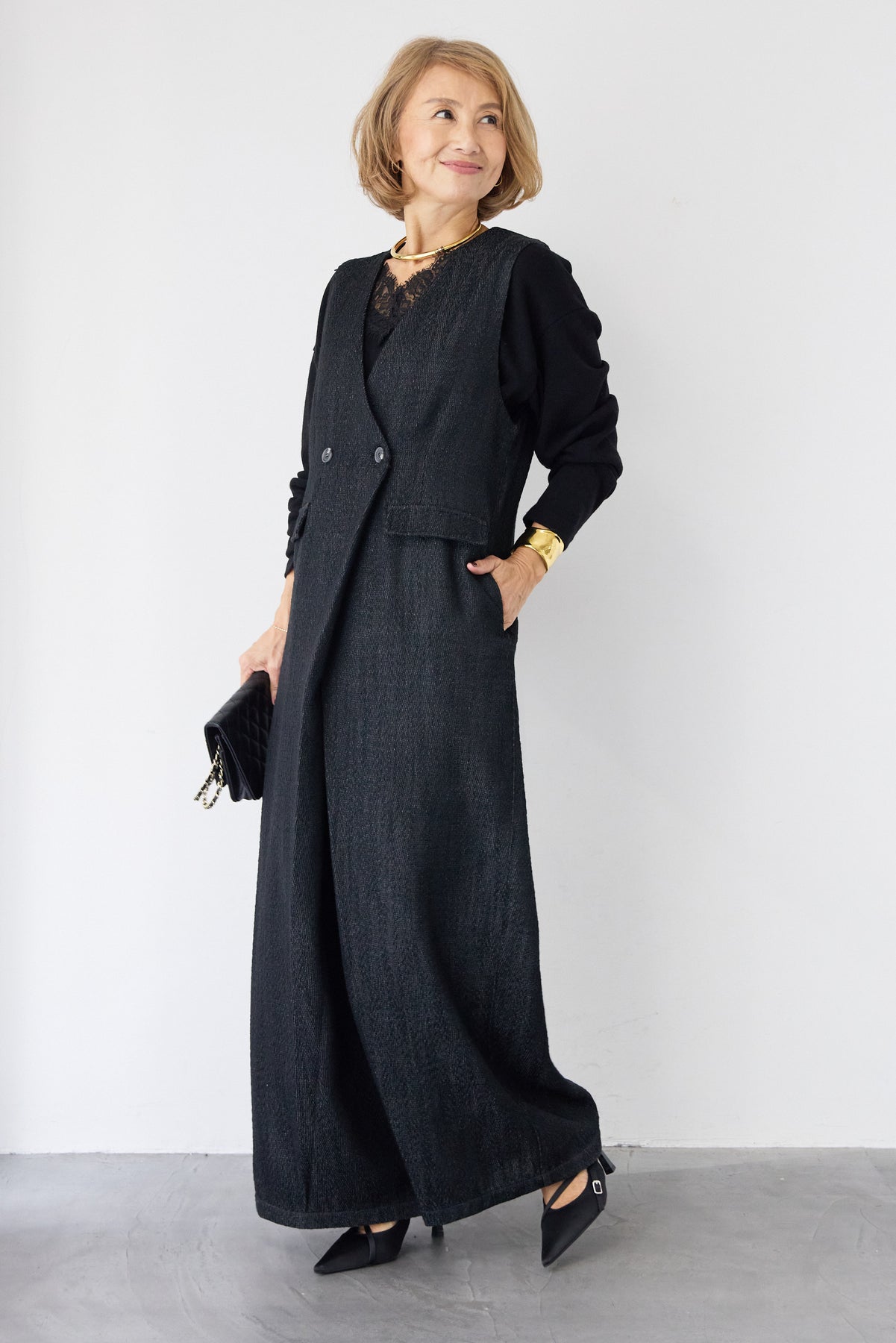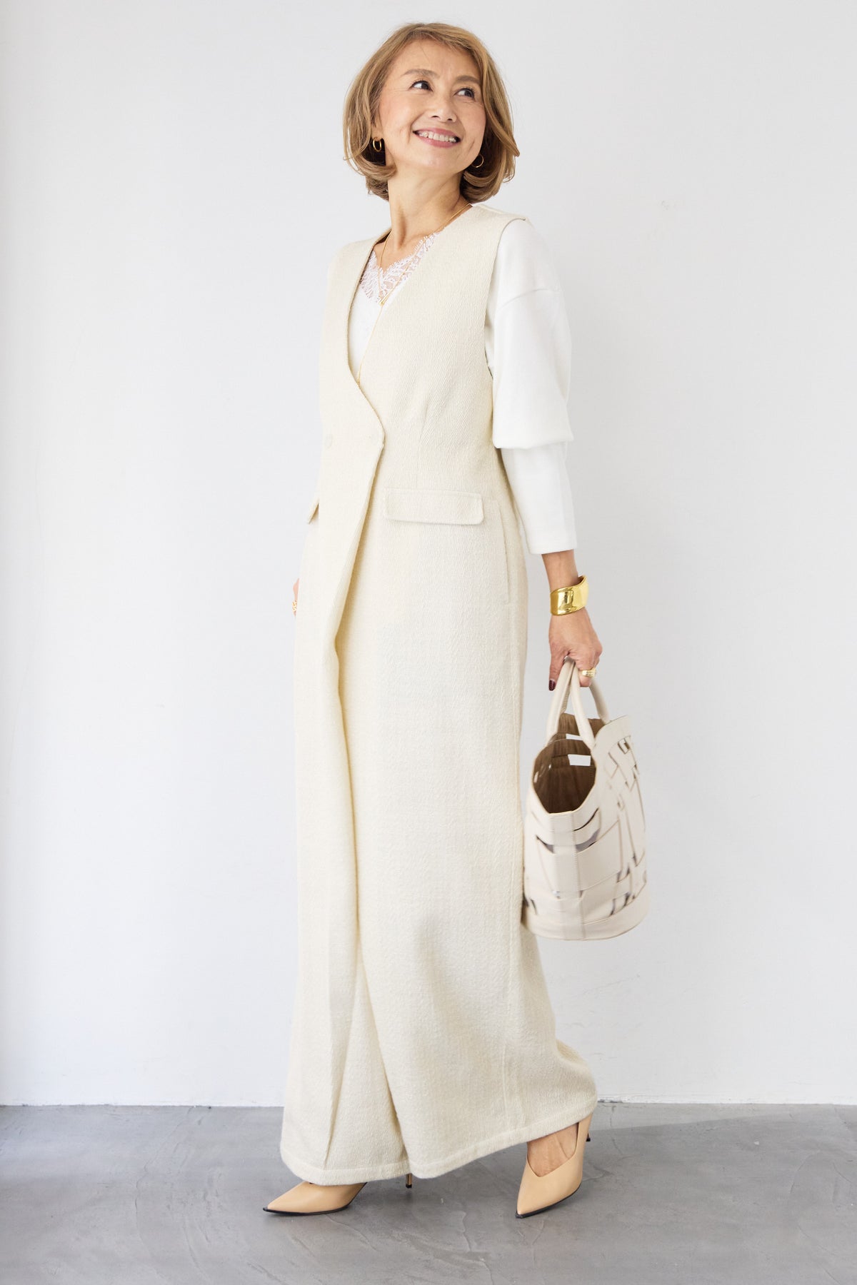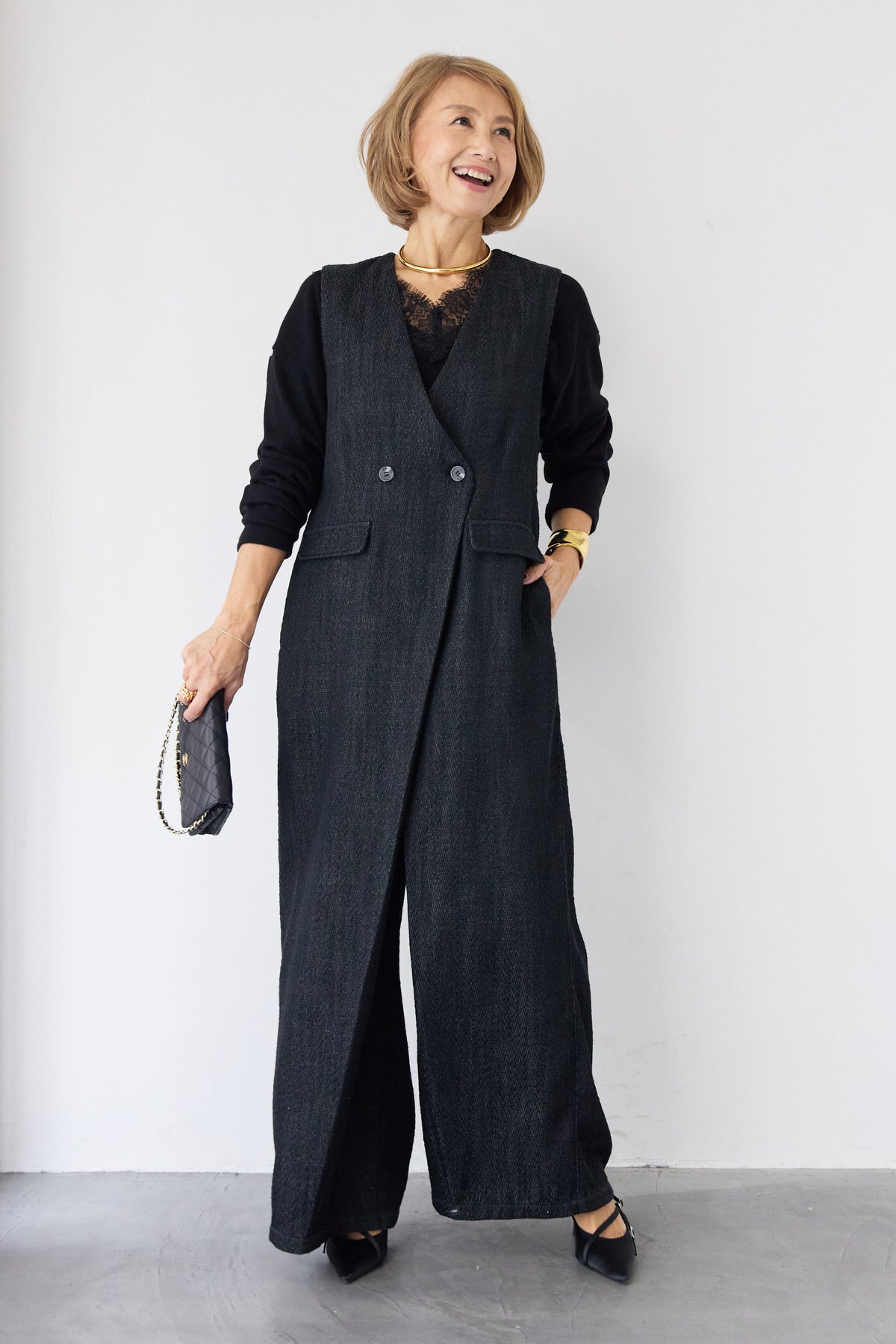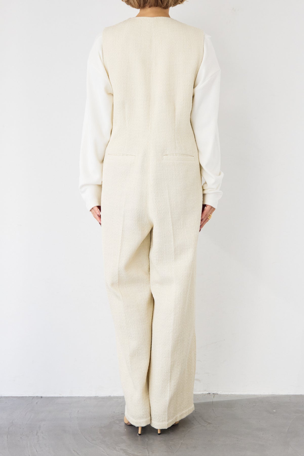 表情豊かなツイード調のテクスチャー生地を使用した、クラス感漂うサロペットです。 ワーク感のあるサロペットを、計算されたシルエットとディテールで、オケージョンシーンやオフィスでも映えるエレガントな一着に昇華させました。