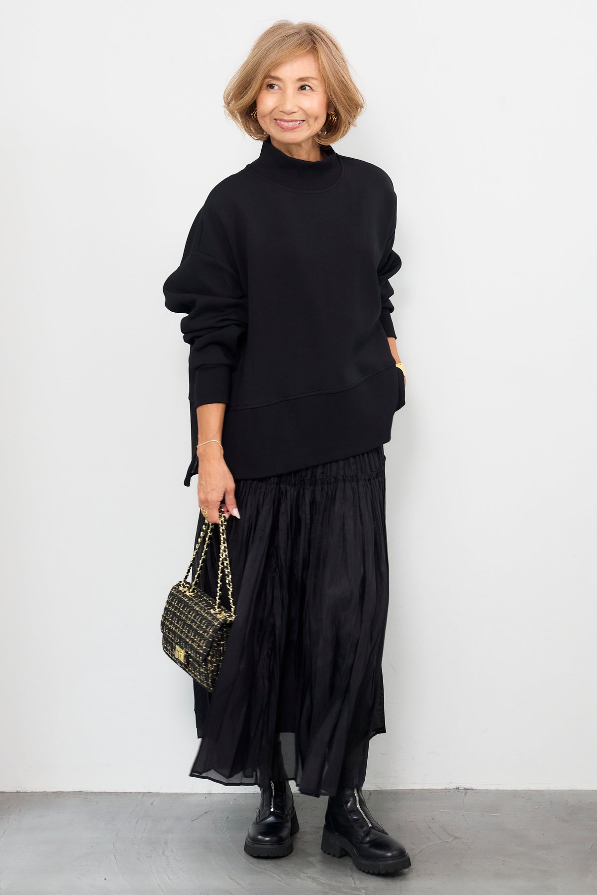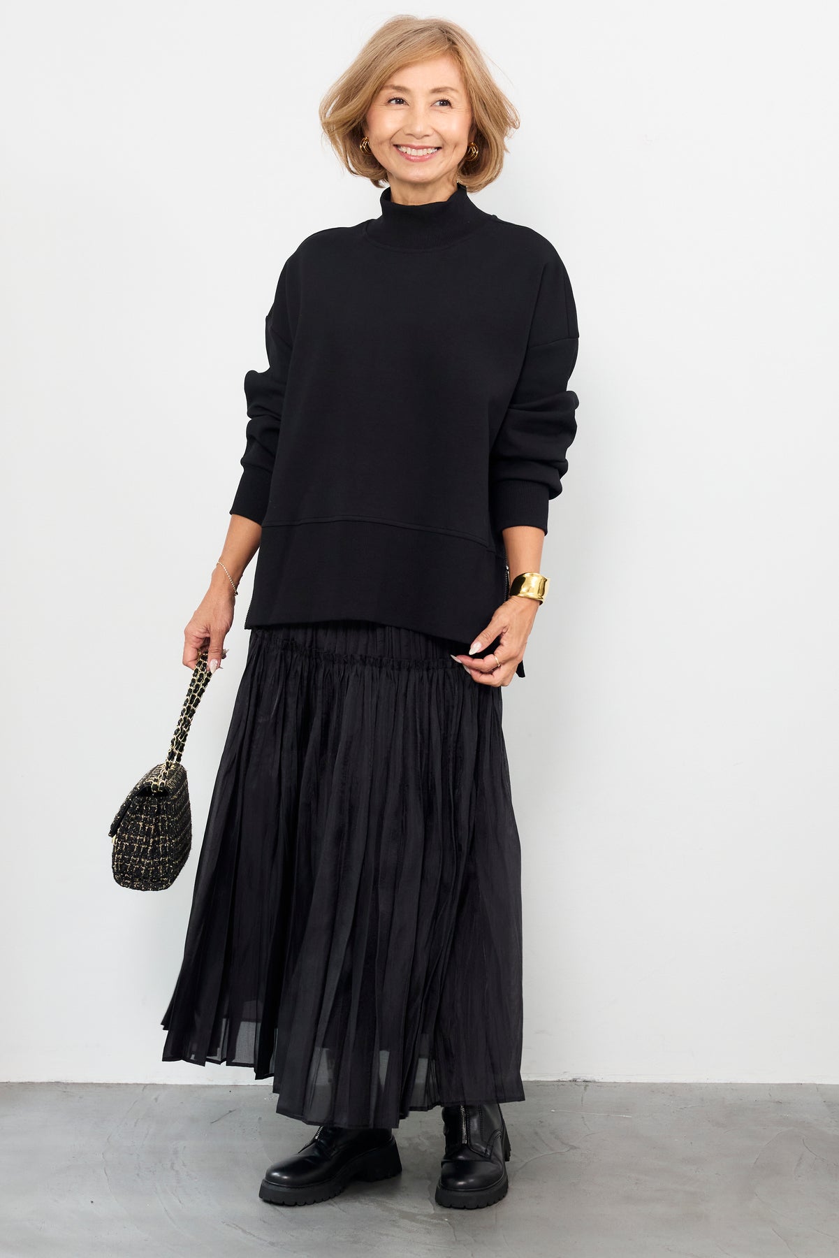 ウエストは総ゴム仕様で、ストレスフリーな履き心地。動くたびにふわりと広がるシルエットは、スタイルに上品な華やかさをプラスします。