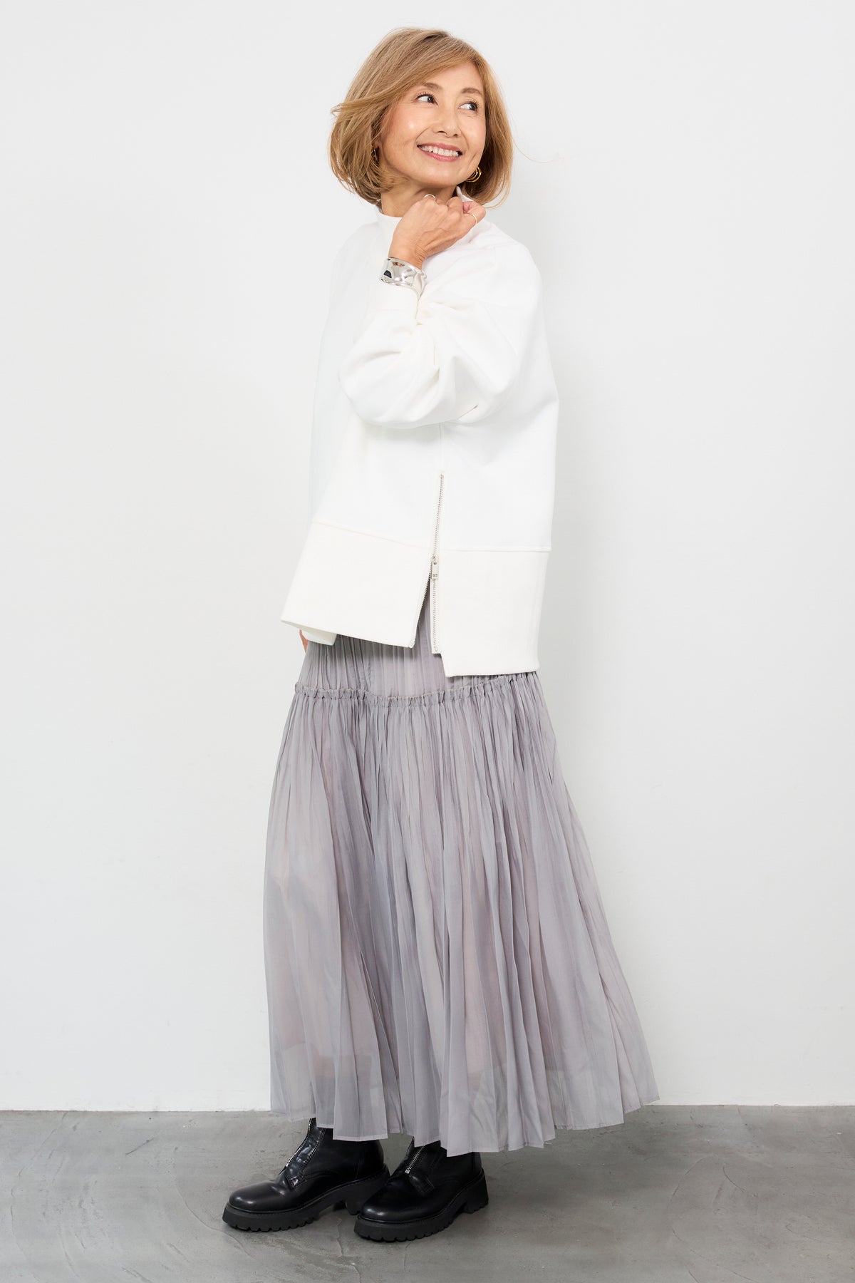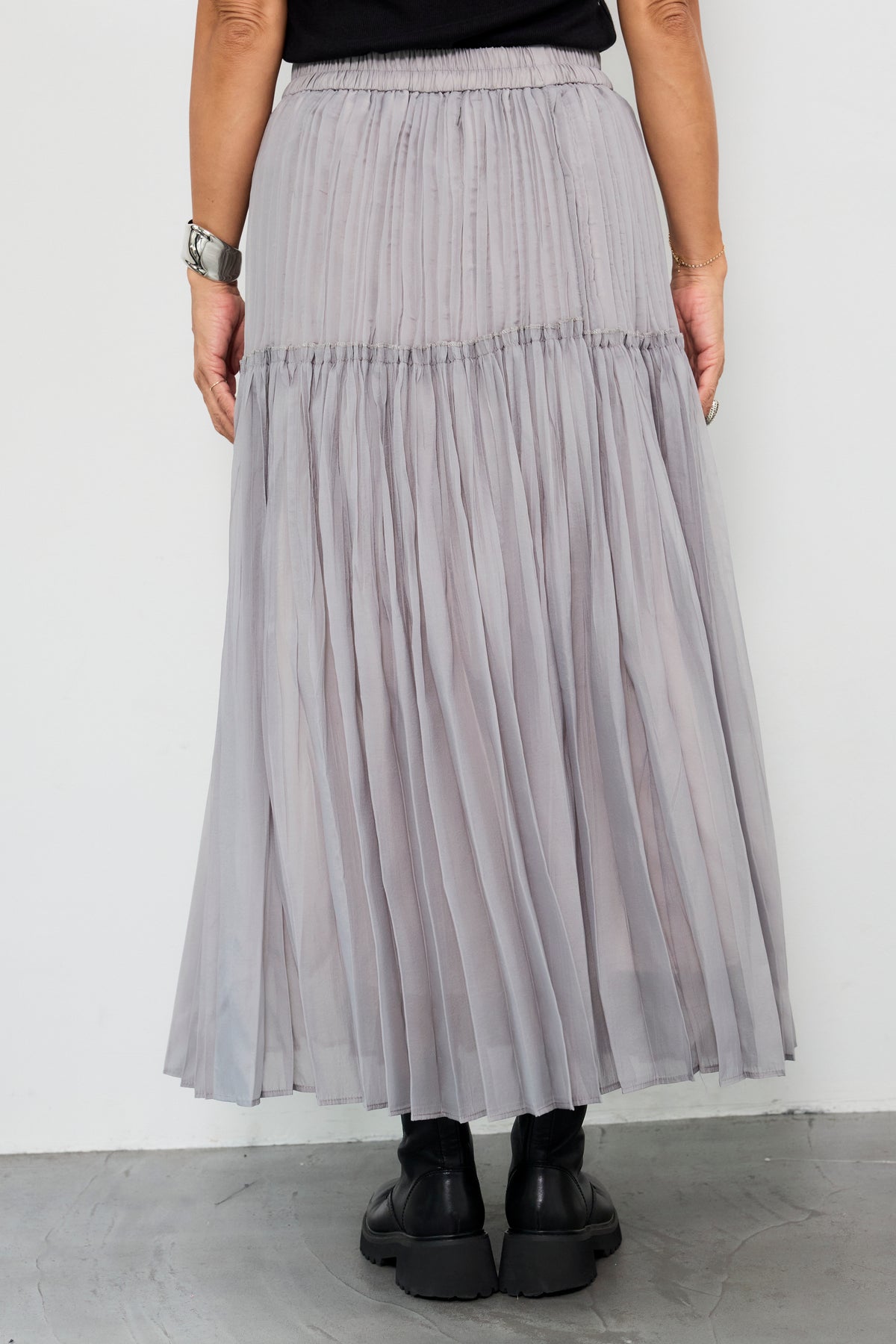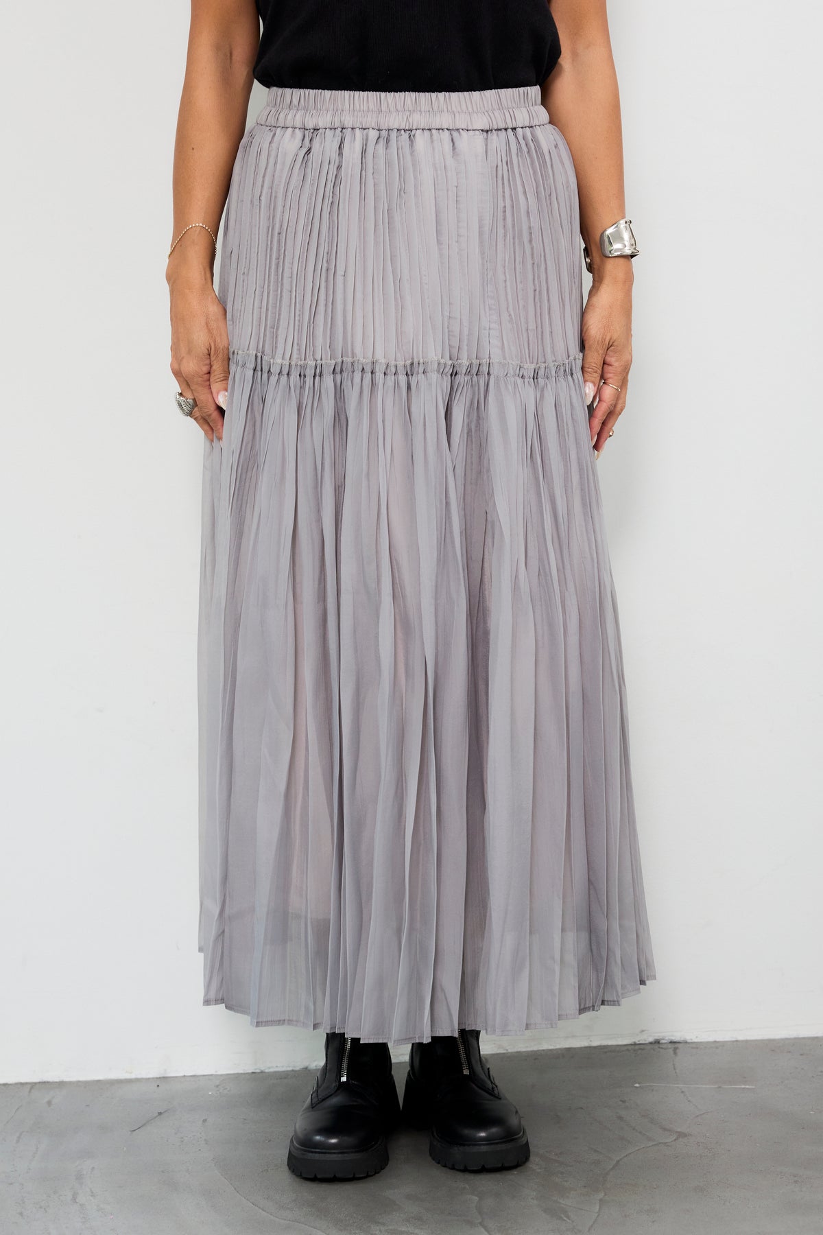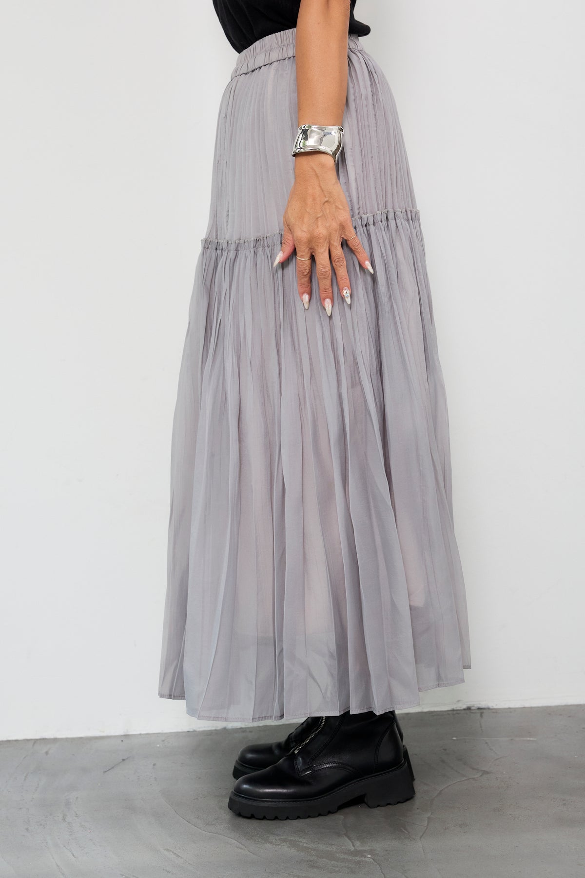 軽やかな揺れ感が魅力のティアードプリーツスカート。繊細に施された細プリーツが縦ラインを強調し、すっきりとした印象を演出します。