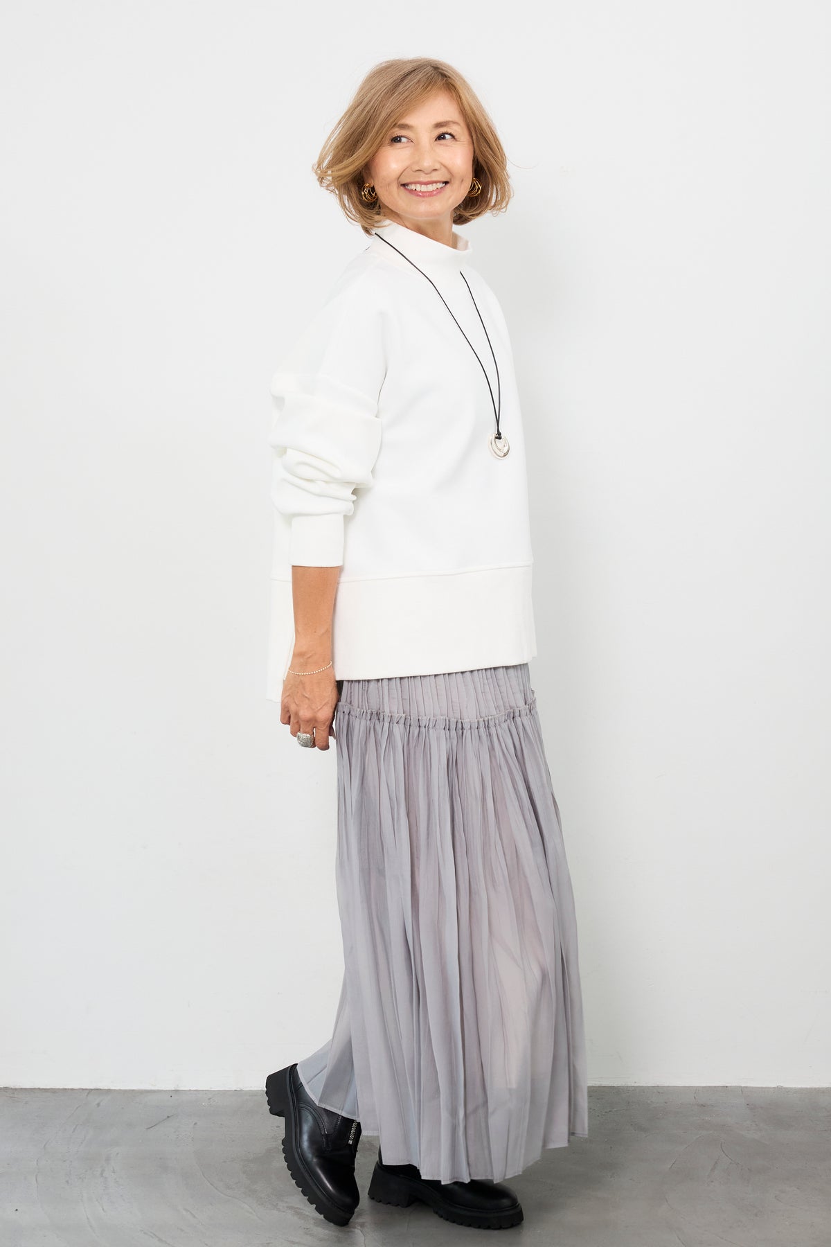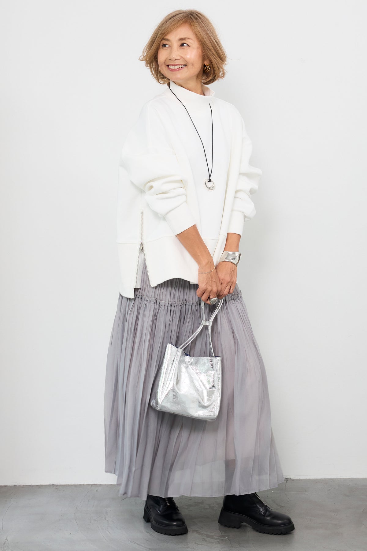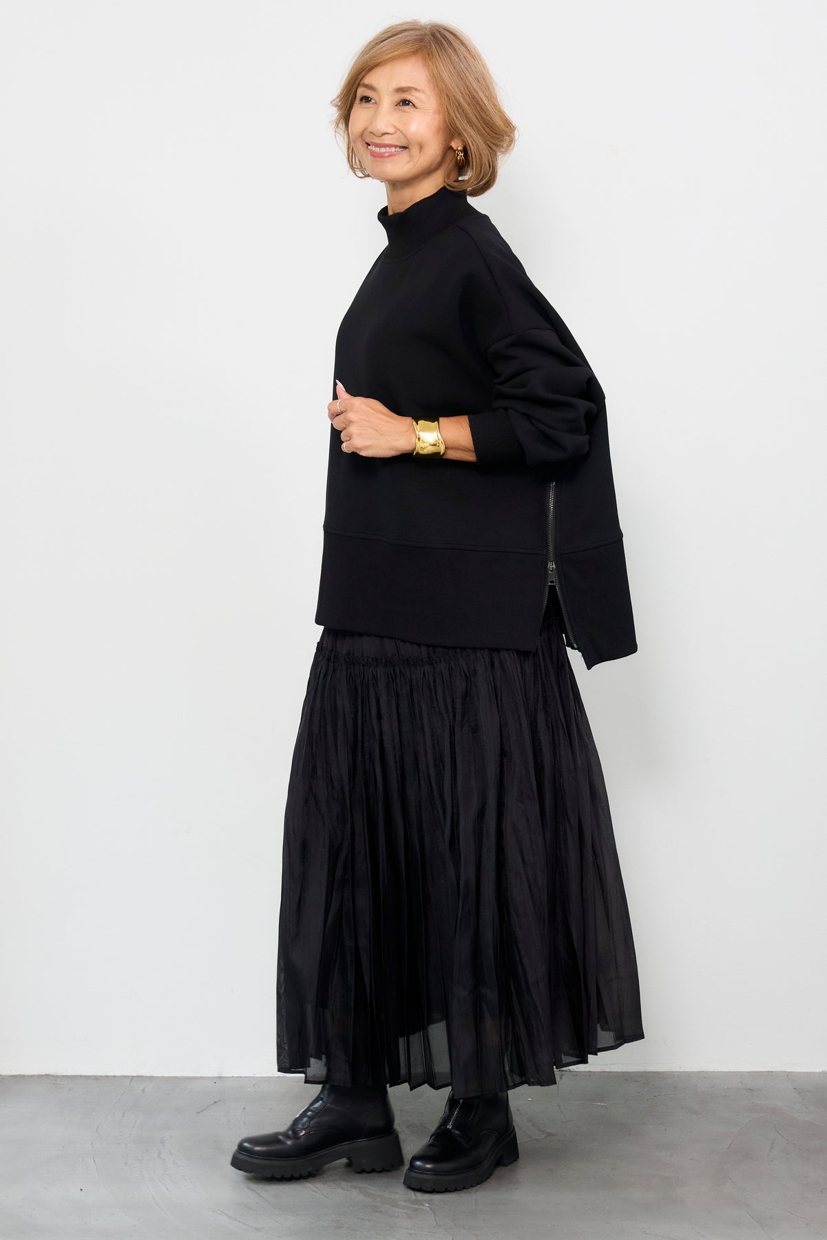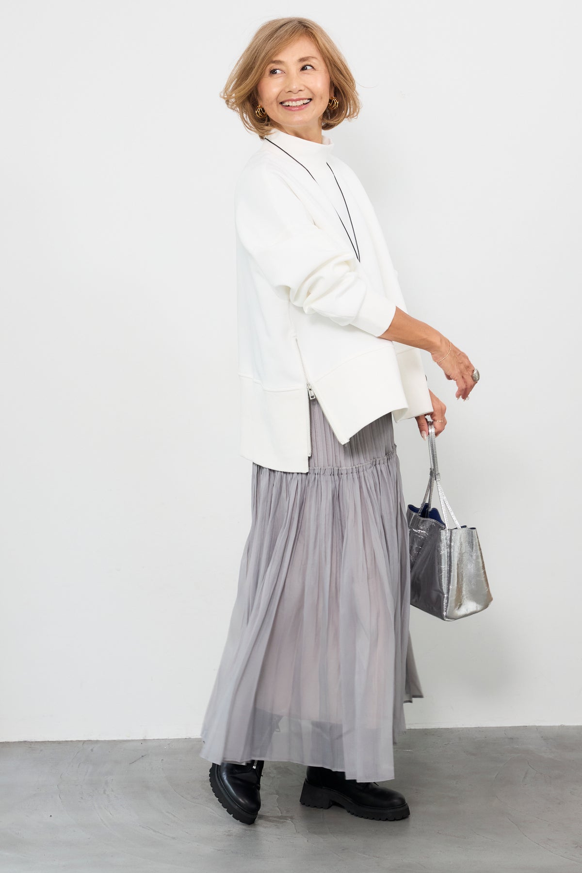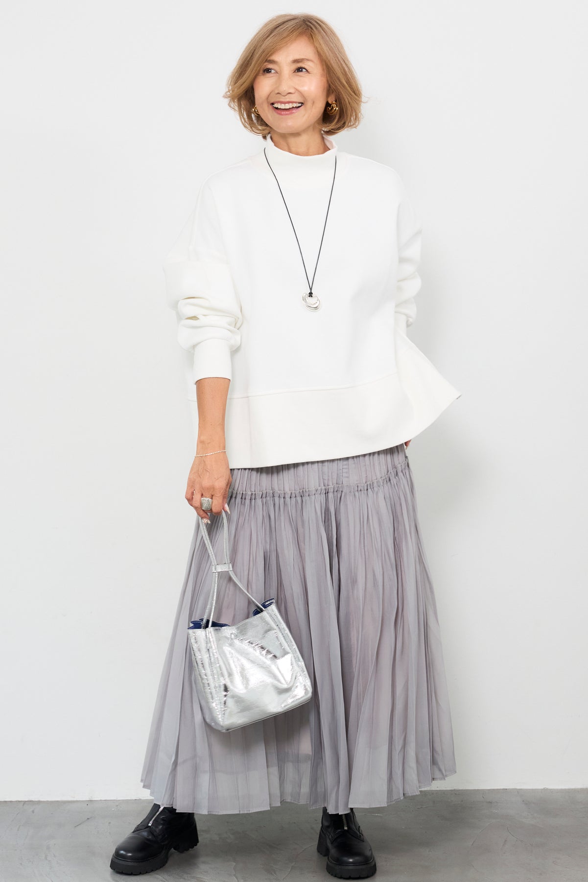 軽やかな揺れ感が魅力のティアードプリーツスカート。繊細に施された細プリーツが縦ラインを強調し、すっきりとした印象を演出します。