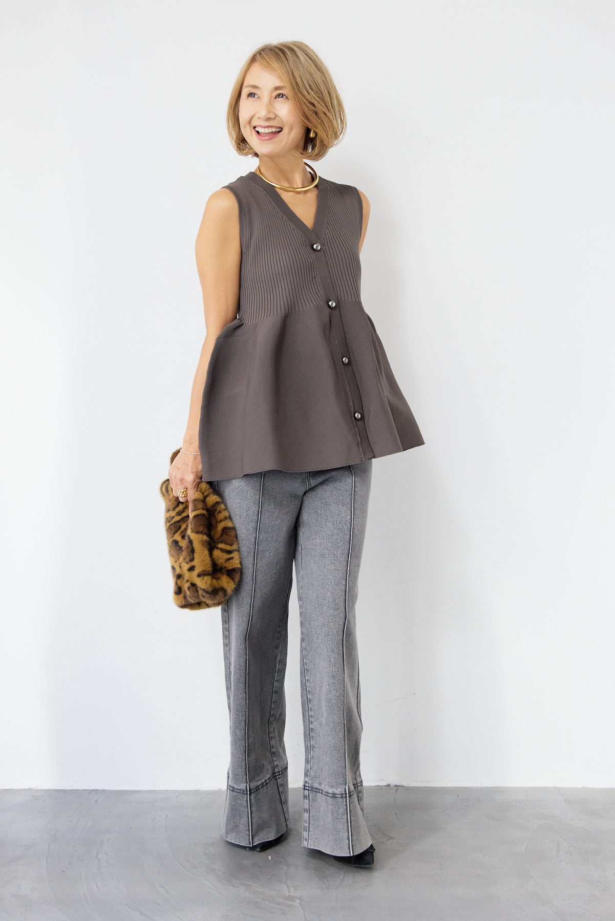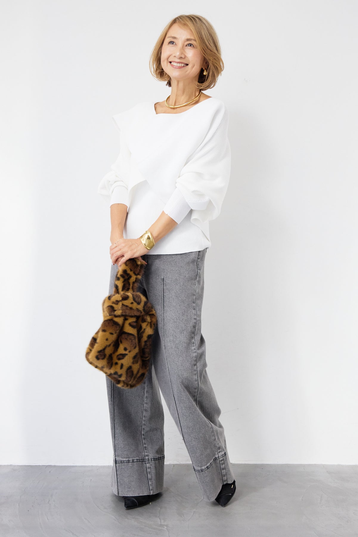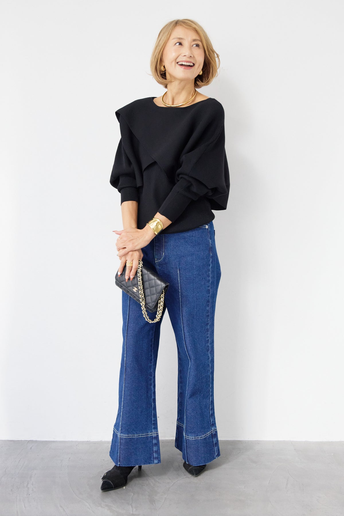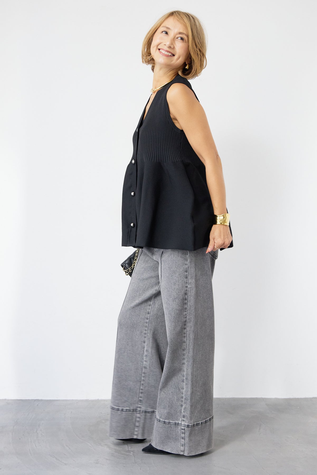 上質感あふれるワイドデニムパンツ。しっかりとした厚みとハリのある生地を使用し、穿くほどに風合いが増す一着です。フロントに入ったセンターシームが縦ラインを強調し、ワイドシルエットながらもすっきりとした印象に。脚のラインをきれいに見せ、カジュアルになりすぎない大人のデニムスタイルを叶えます。ウエストは後ろゴム仕様で、見た目のきちんと感と快適な穿き心地を両立。ヒップまわりには程よいゆとりを持たせ、体型を選ばずリラックスして着用できます。Tシャツやニットでカジュアルに、ブラウスやジャケットと合わせてきれいめにも。オン・オフ問わず活躍する、長く愛用したい大人のためのワイドデニムパンツです。
