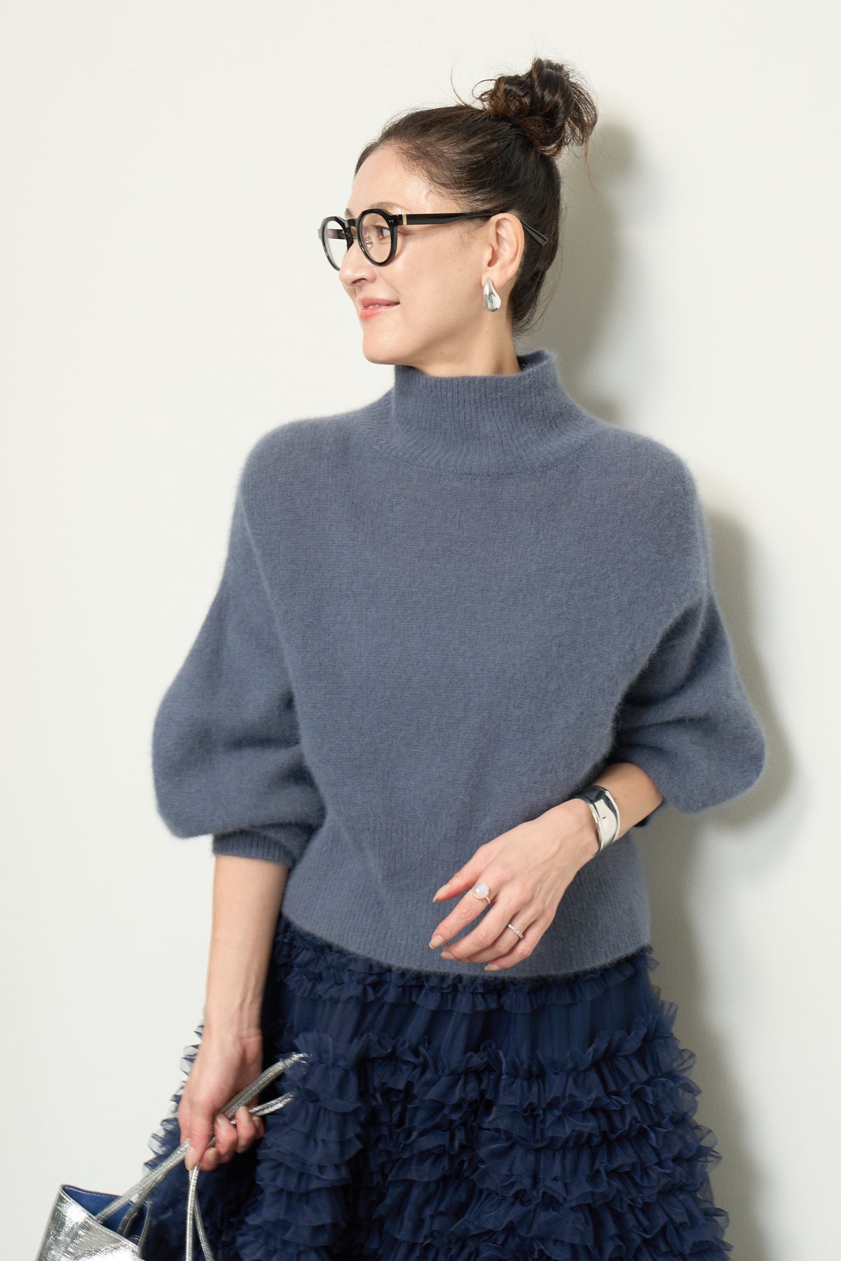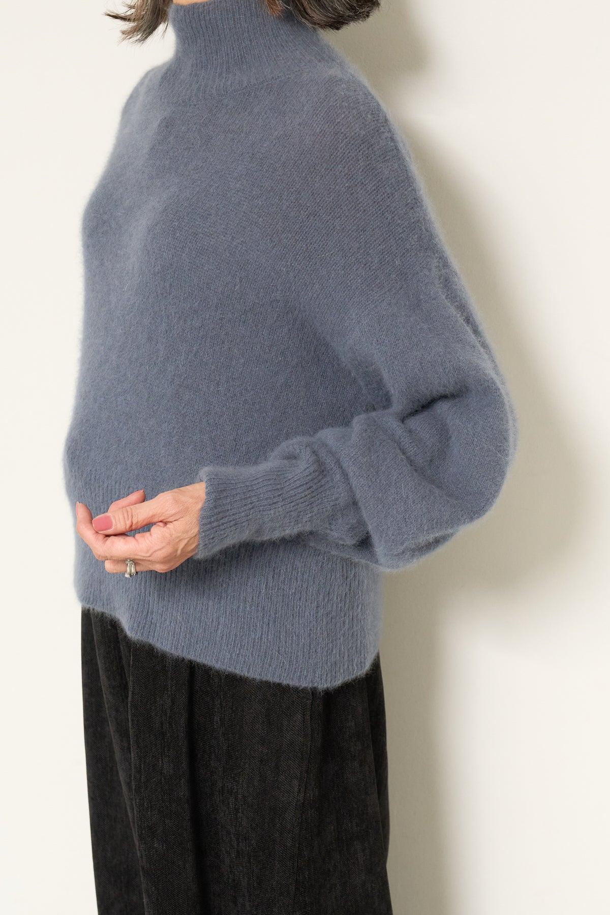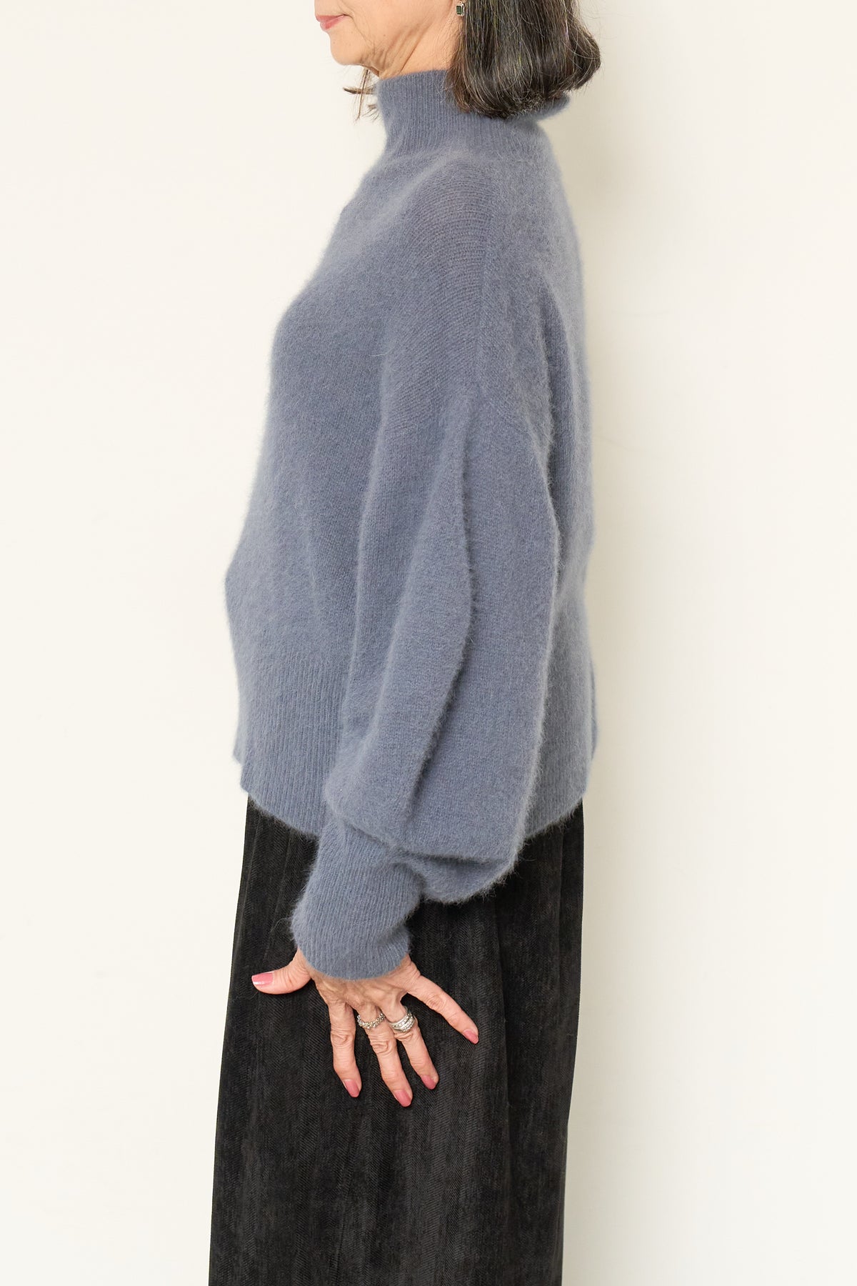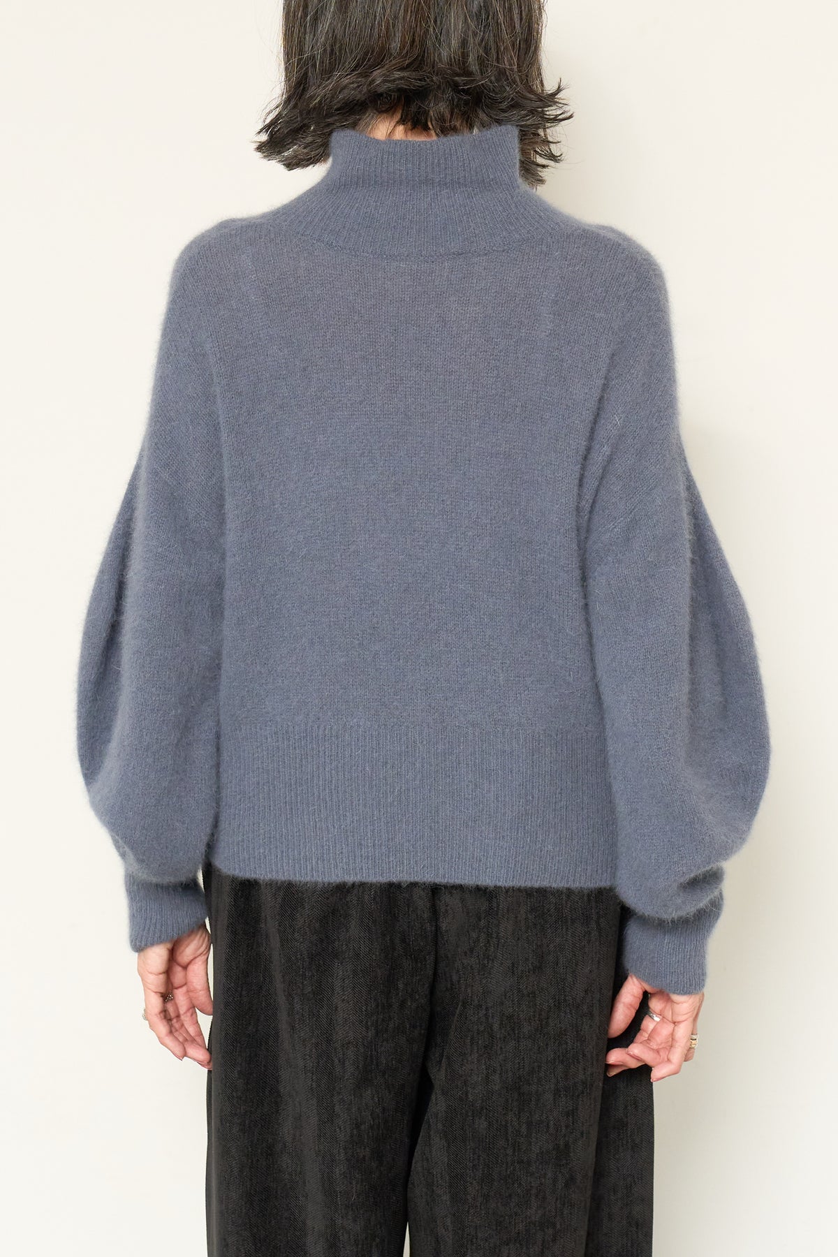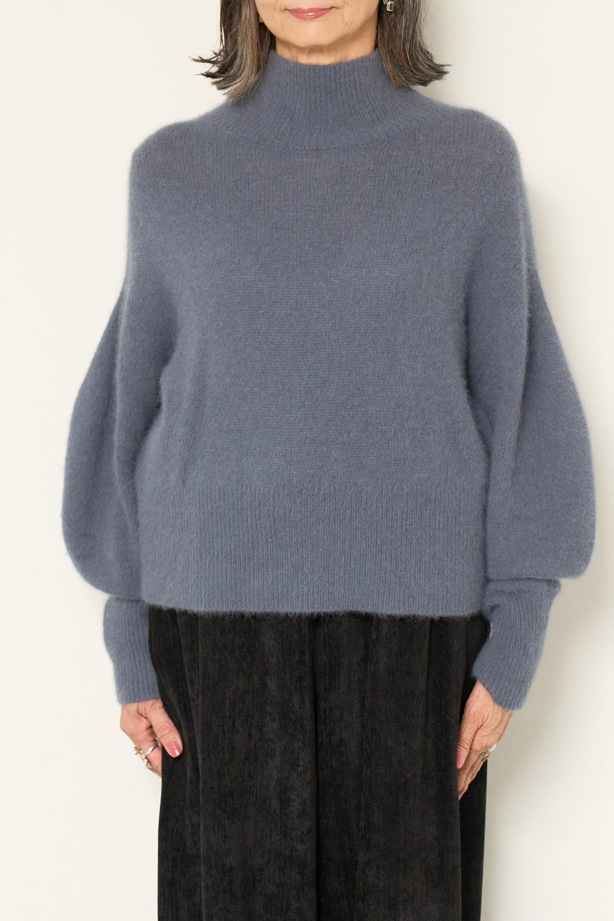 上質なFOX混素材で仕立てたボリュームスリーブニットは、柔らかな肌触りと軽やかな着心地が魅力です。立体感のある袖がシルエットに奥行きを与え、さりげない存在感をプラス。シンプルなデザインでありながら、モダンなディテールが光る一着です。 スタイルに合わせてカジュアルにもフェミニンにも着回しが可能な、トレンド感溢れるニット。季節の変わり目に最適で、どんなシーンでも活躍してくれます。