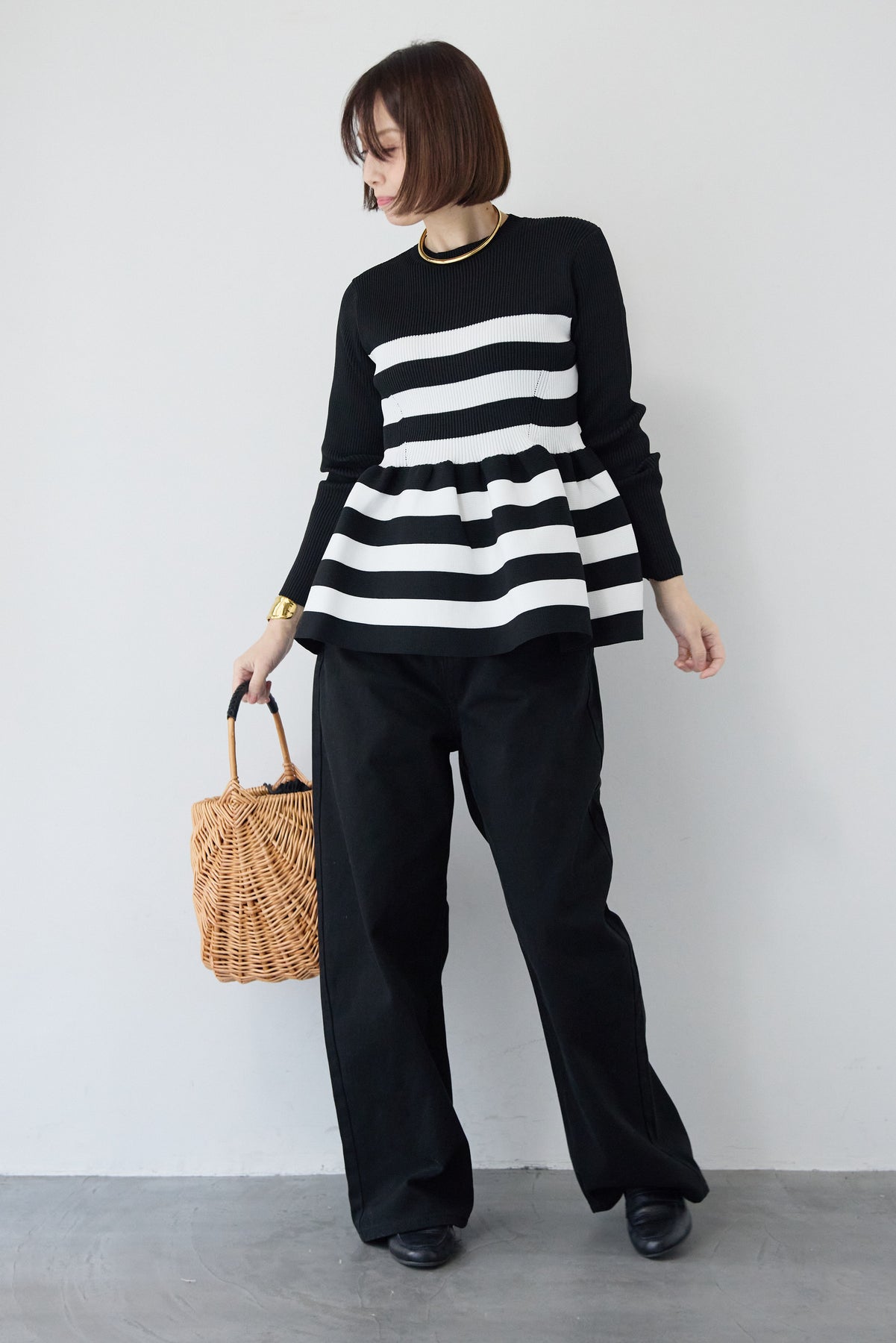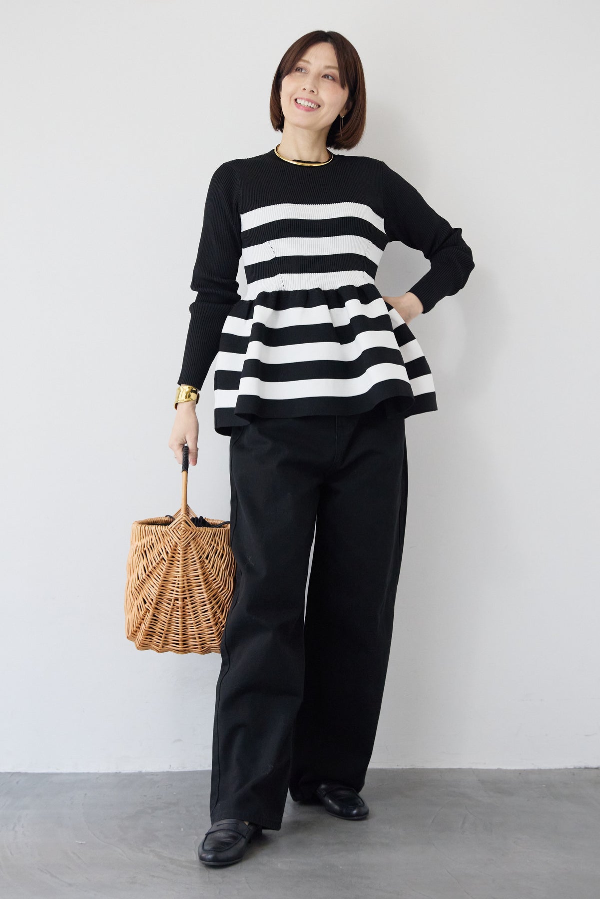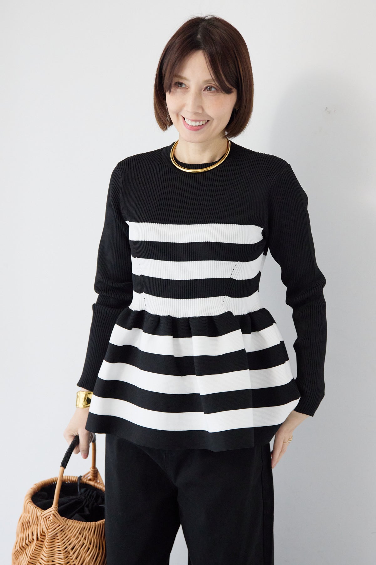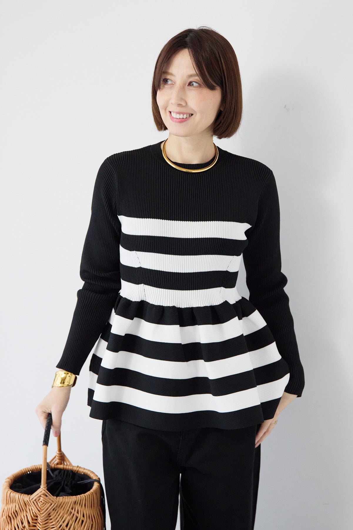 上身頃は縦畝のリブ編みで、すっきりとしたフィット感を演出し、ウエスト位置から自然に広がるペプラムシルエットが女性らしさを引き立てるニットトップス。切り替え部分には編み地の変化をつけ、立体感とさりげないデザイン性をプラスしています。クルーネックは詰まりすぎず、上品で着回しやすいバランス。袖は細めのリブで、全体をすっきりとまとめながらも、裾のフレアがコーディネートに動きを与えます。パンツ合わせはもちろん、タイトスカートと合わせればきれいめな印象にも。一枚で華やかさと体型カバーを叶える、デイリーからきちんとシーンまで活躍するペプラムニットです。