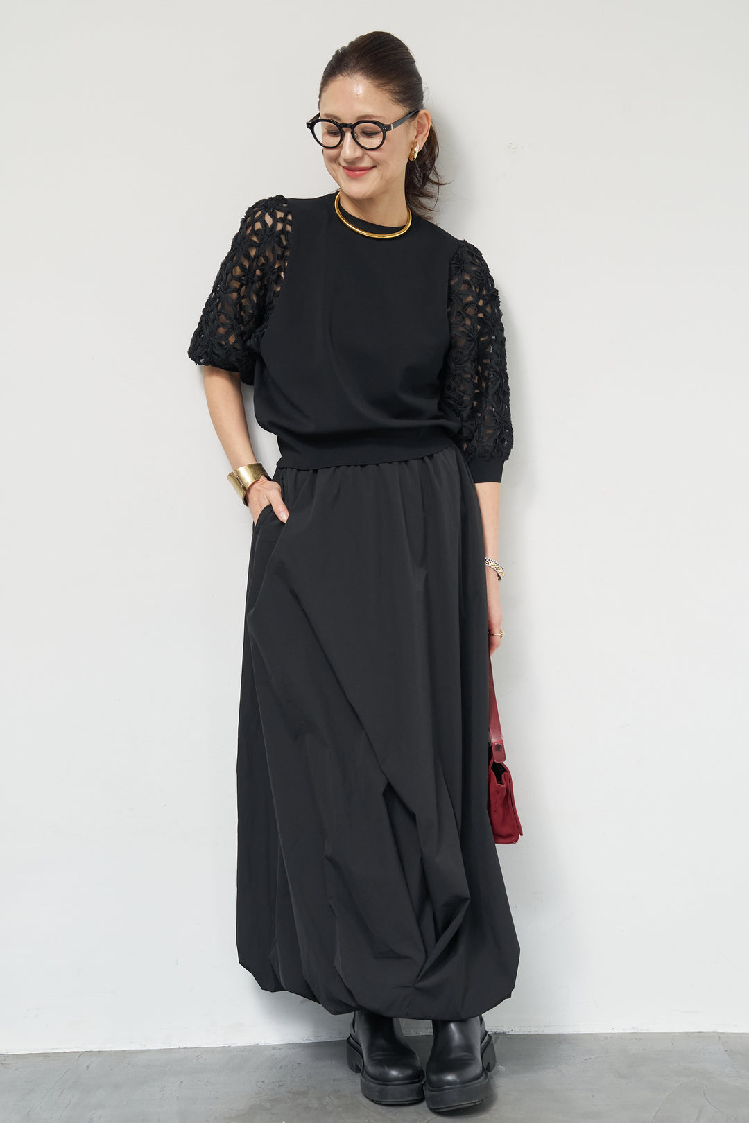 [SET]フラワースリーブニットプルオーバー+ポリエステルブロード バルーンスカート(2set)