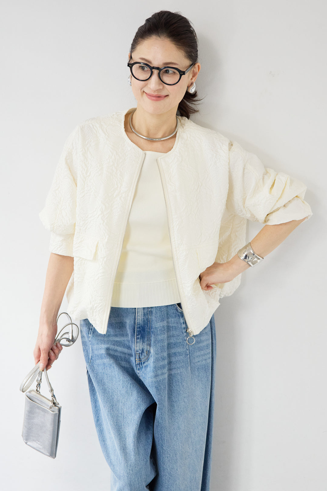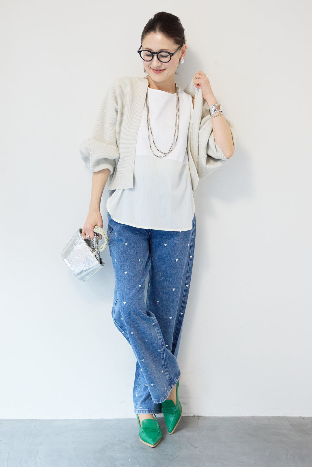 [SET]スカラップヘム レースシアーブラウス+ステッチデザインストレッチデニムワイドパンツ(2set)