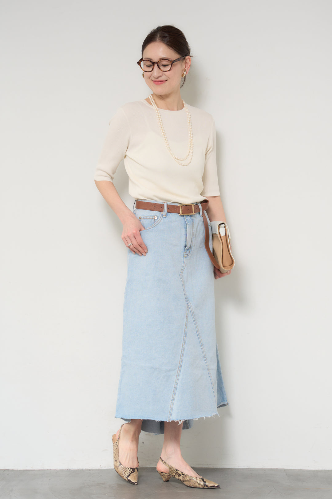 [SET]サラっと細リブニット+フリンジヘムデニムロングスカート(2set)