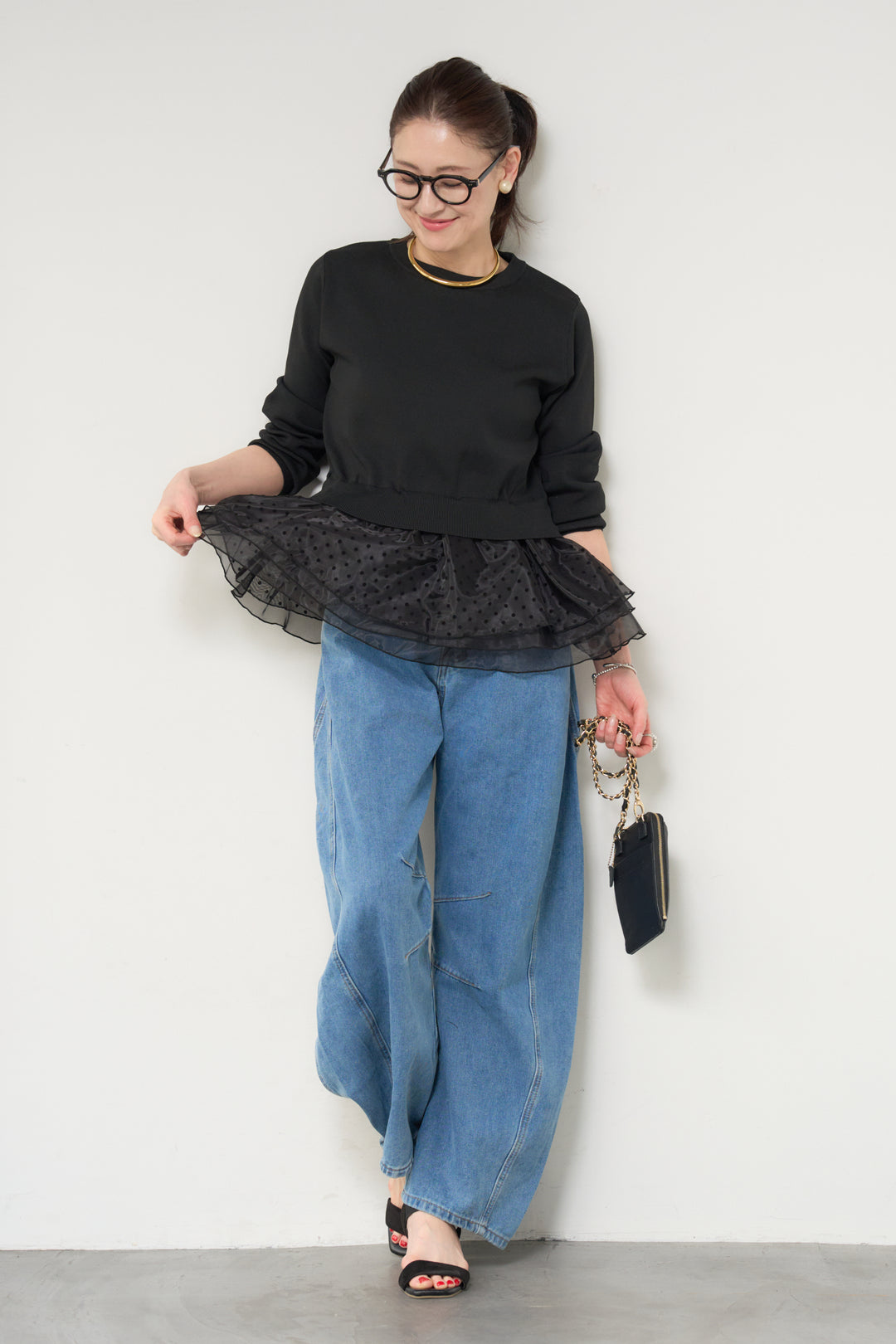 [SET]ティアードレースプルオーバー+カーブデニムパンツ(2set)