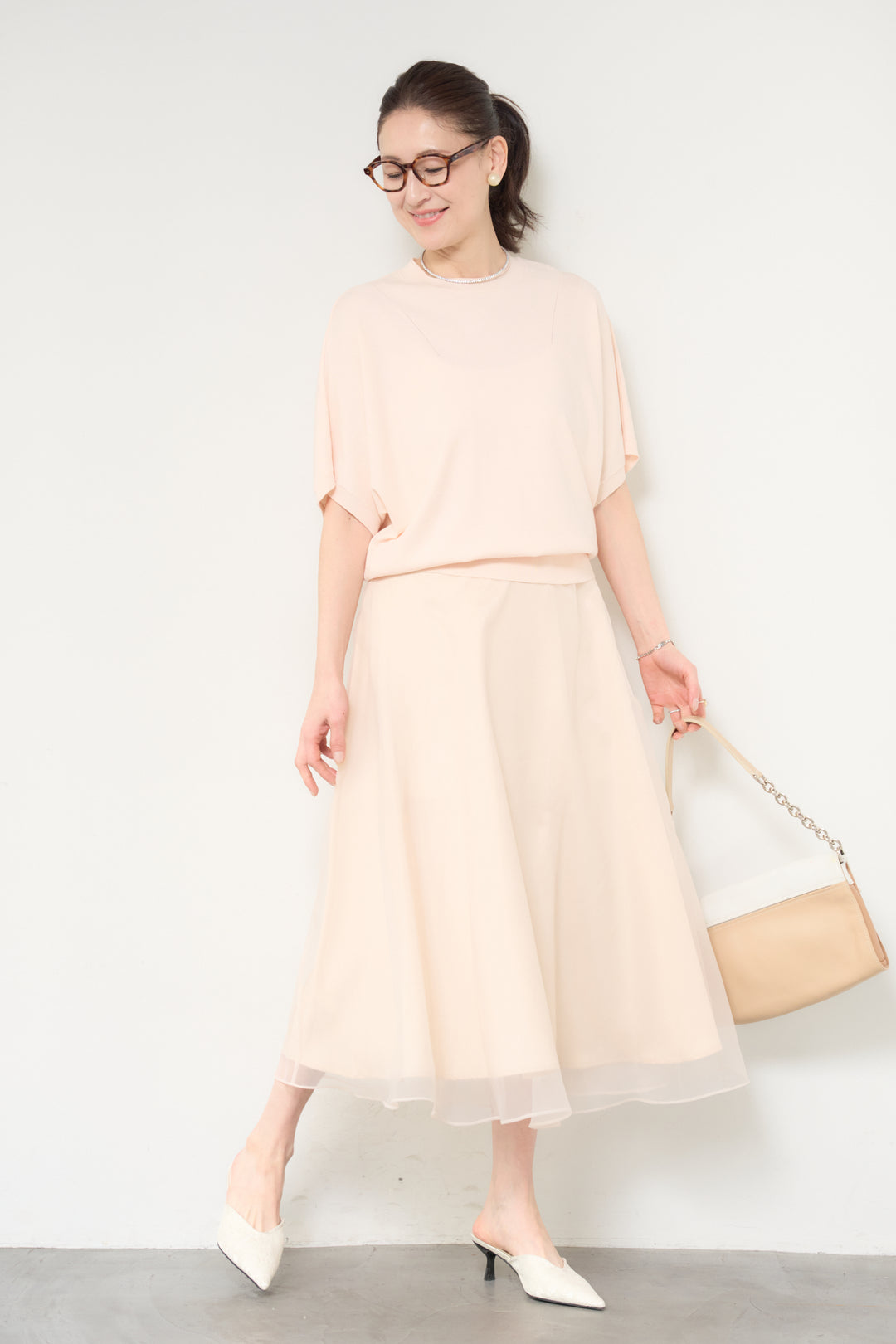 [SET]ドルマンショートスリーブニット+シアーチュールフレアスカート(2set)