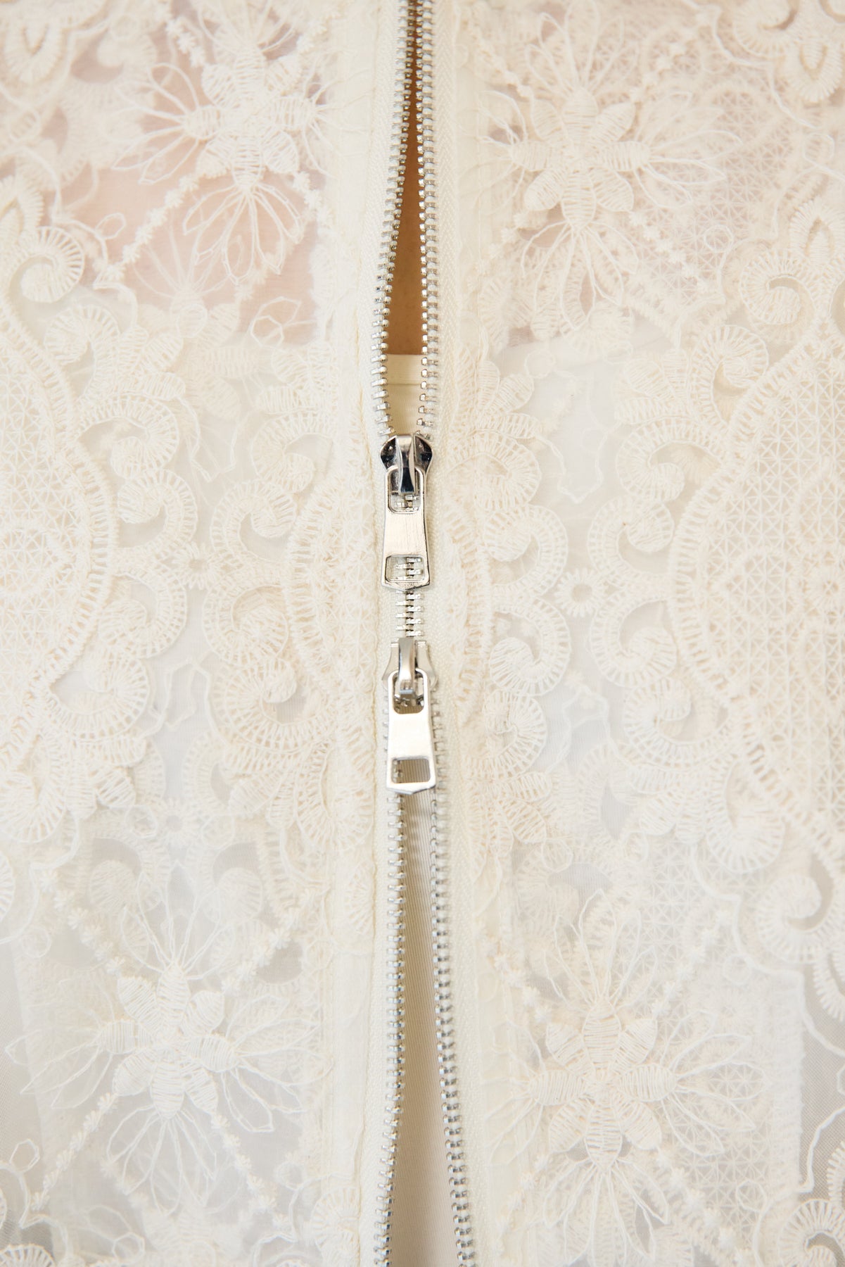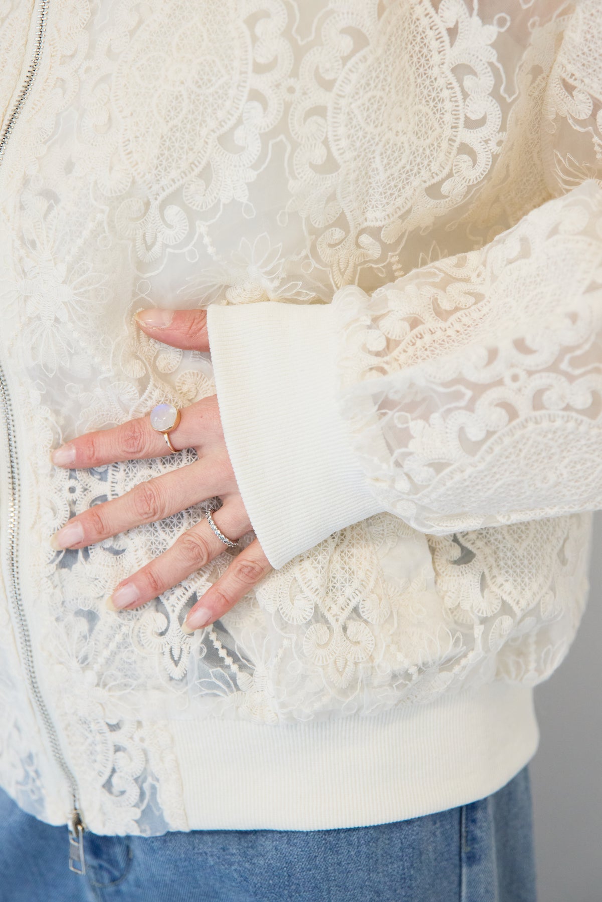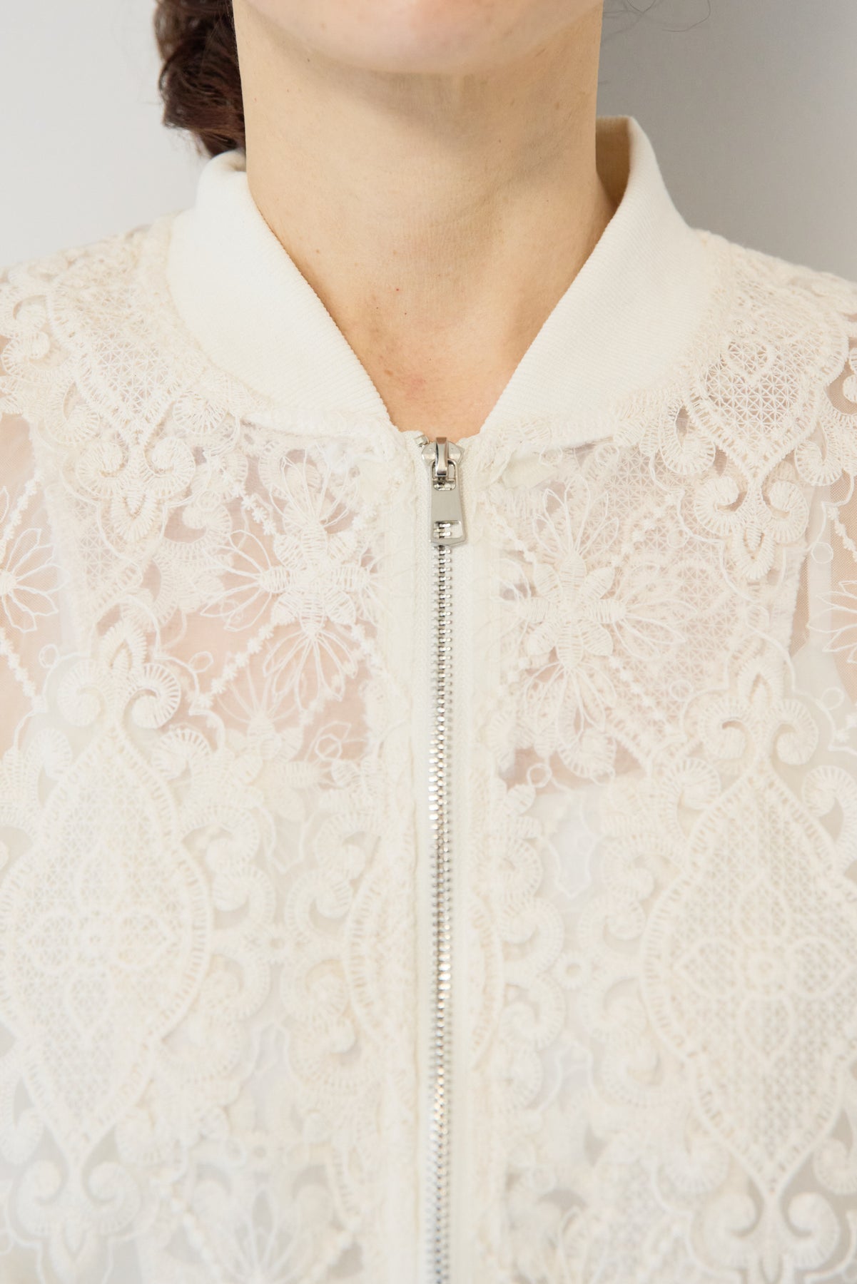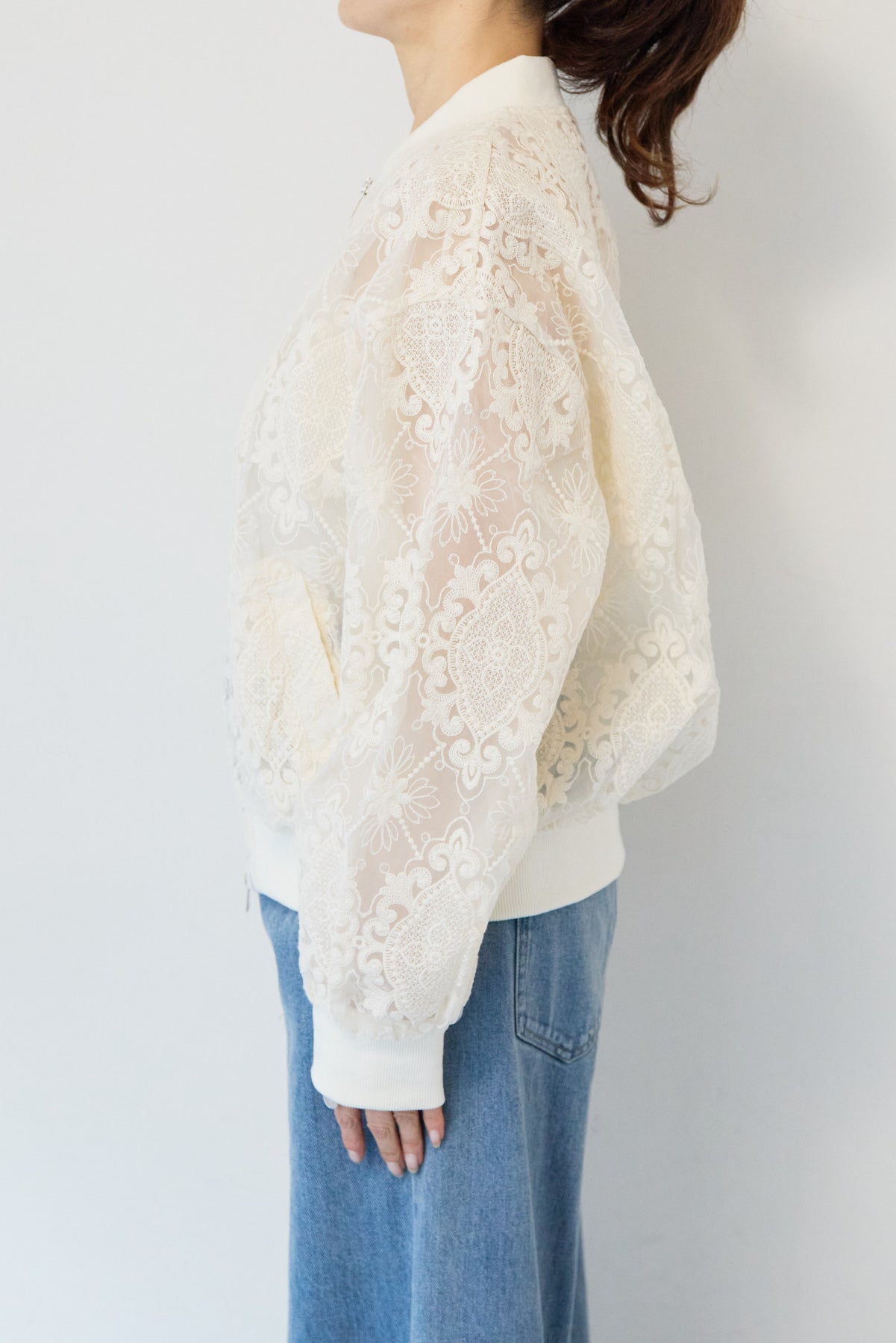 繊細なレース素材が目を惹く、上品さと軽やかさを兼ね備えたシアーブルゾン。程よい透け感の総レースデザインが、女性らしいやわらかな印象を演出します。ブルゾン型なので甘くなりすぎず、カジュアルにもきれいめにもマッチ。デニムと合わせたデイリーコーデはもちろん、ワンピースやスカートの羽織としても活躍します。首元・袖口・裾にはリブを施し、すっきりとしたシルエットと着心地の良さを両立。フロントはダブルジップ仕様で、開け方次第でスタイリングのアレンジも楽しめます。季節の変わり目や冷房対策にもおすすめの、軽やかに羽織れる一枚です。