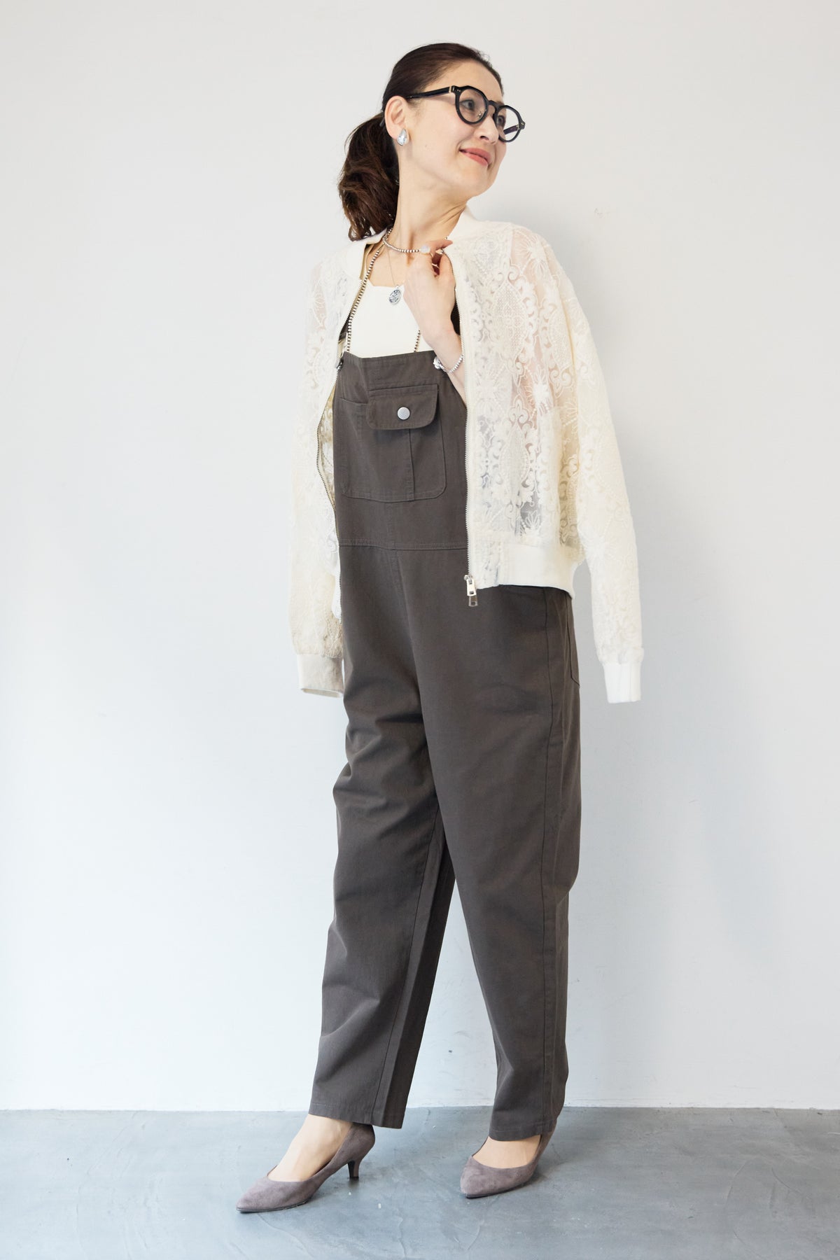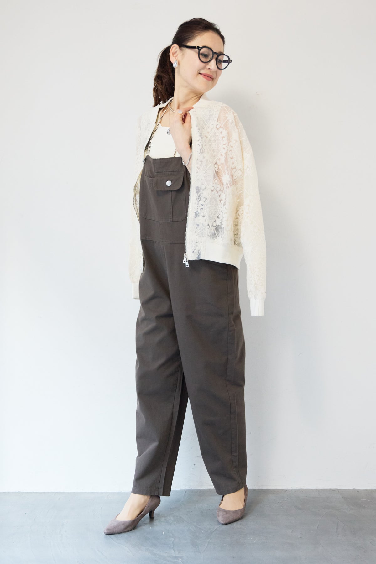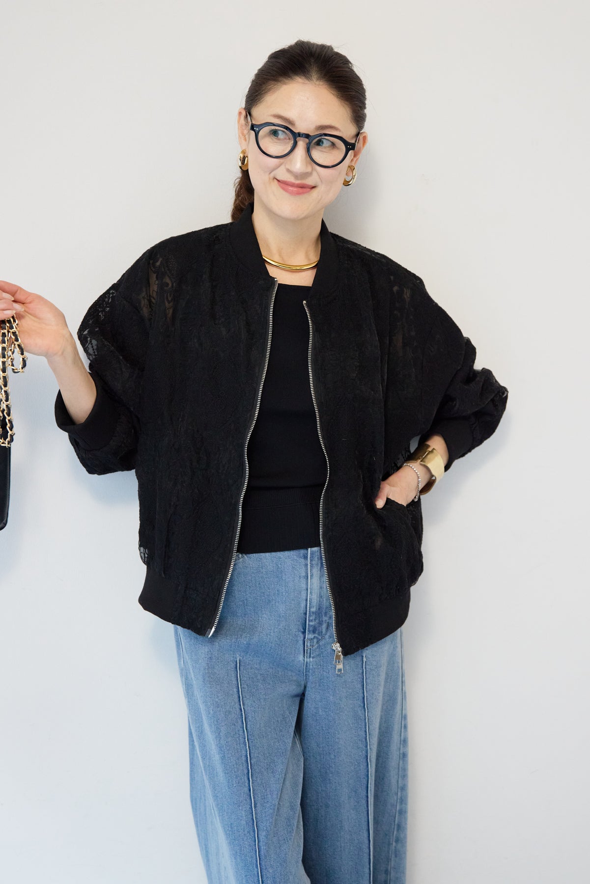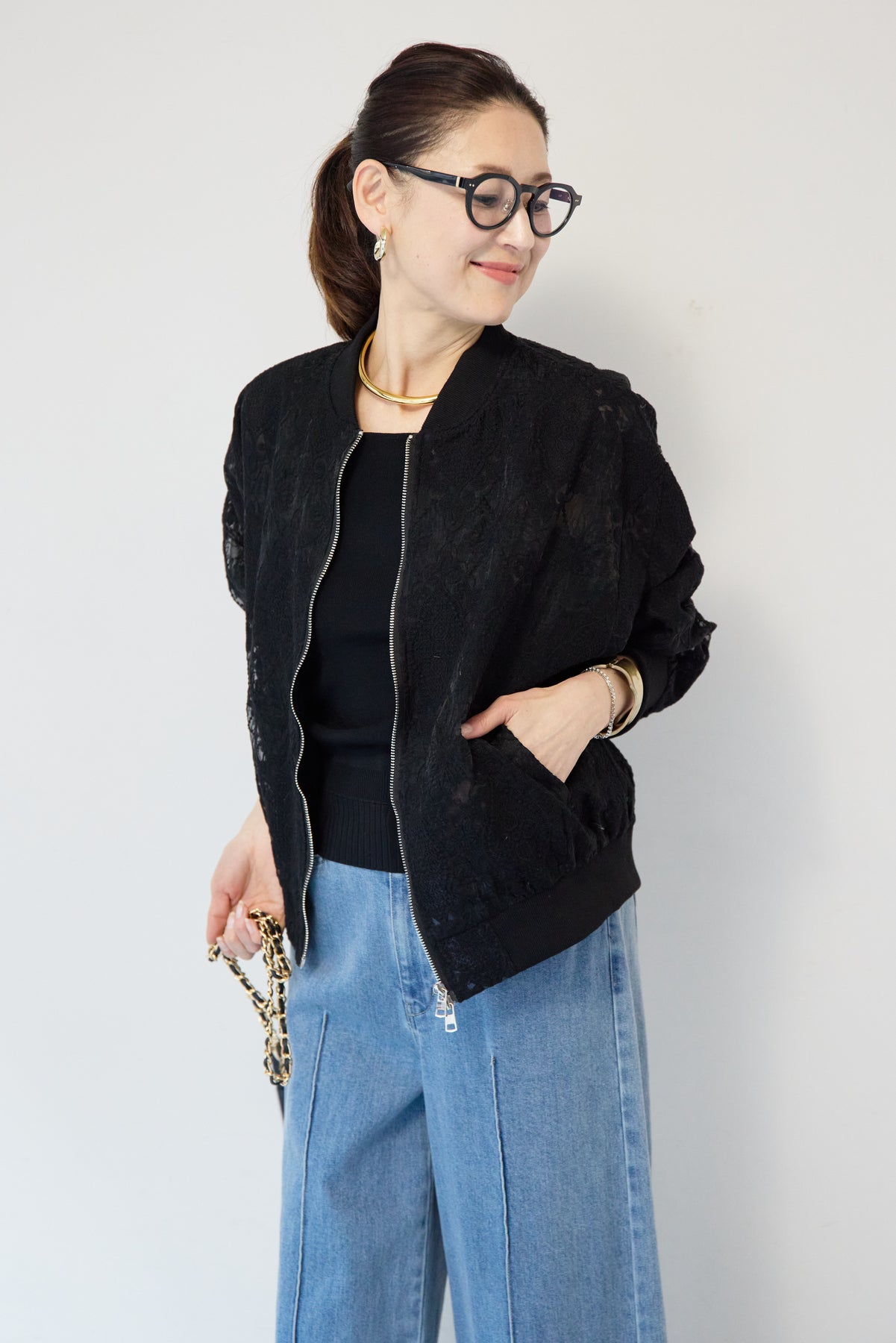 繊細なレース素材が目を惹く、上品さと軽やかさを兼ね備えたシアーブルゾン。程よい透け感の総レースデザインが、女性らしいやわらかな印象を演出します。ブルゾン型なので甘くなりすぎず、カジュアルにもきれいめにもマッチ。デニムと合わせたデイリーコーデはもちろん、ワンピースやスカートの羽織としても活躍します。首元・袖口・裾にはリブを施し、すっきりとしたシルエットと着心地の良さを両立。フロントはダブルジップ仕様で、開け方次第でスタイリングのアレンジも楽しめます。季節の変わり目や冷房対策にもおすすめの、軽やかに羽織れる一枚です。