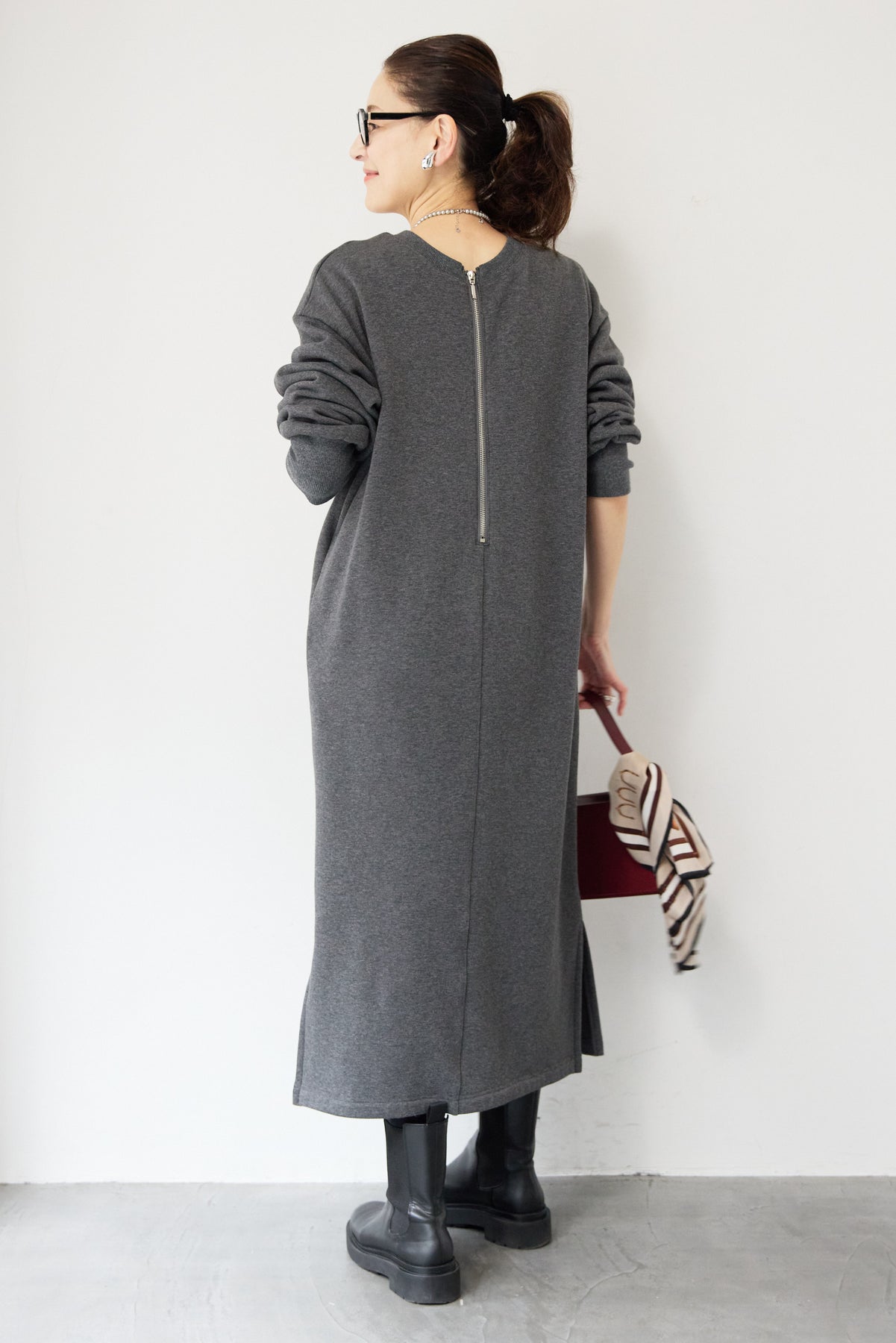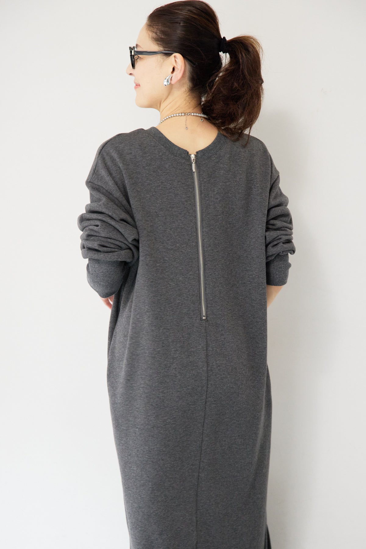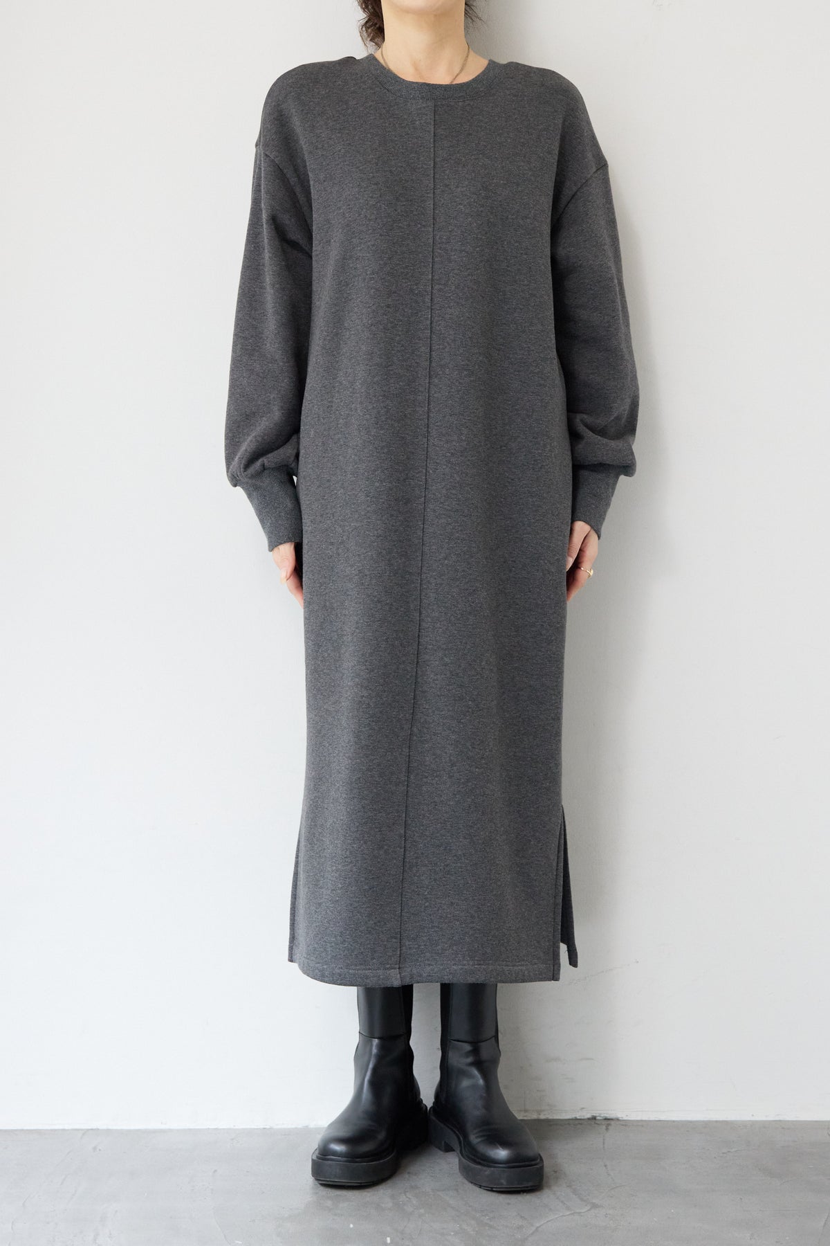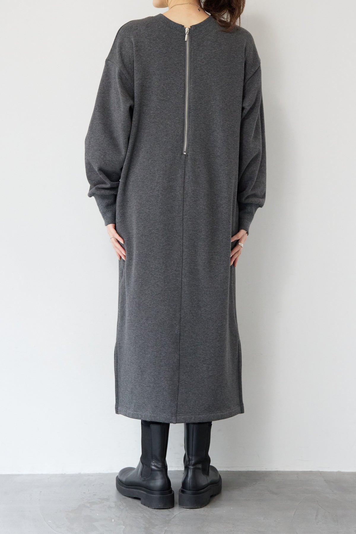 シンプルな中にさりげないデザイン性を効かせた、大人のための裏起毛ワンピース。柔らかくあたたかな裏起毛素材を使用し、寒い季節も快適な着心地を叶えます。フロントは縦ラインを強調する切り替えデザインで、すっきりとした印象に。背中には存在感のあるバックジップを施し、後ろ姿まで抜かりなく仕上げました。着脱のしやすさはもちろん、コーディネートのアクセントにもなるポイントです。程よくゆとりのあるストレートシルエットとロング丈が、体のラインを拾いすぎず上品にカバー。裾にはサイドスリットを入れることで、足さばきが良く、重たく見えないバランスに仕上げています。一枚でさらっと着るだけでサマになり、ブーツやスニーカーなど合わせる小物次第でカジュアルにもきれいめにも活躍します。