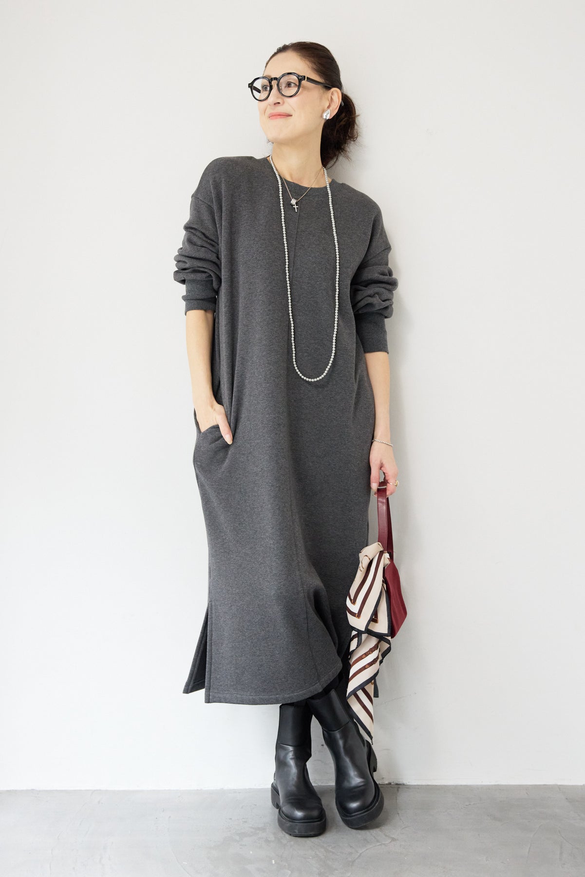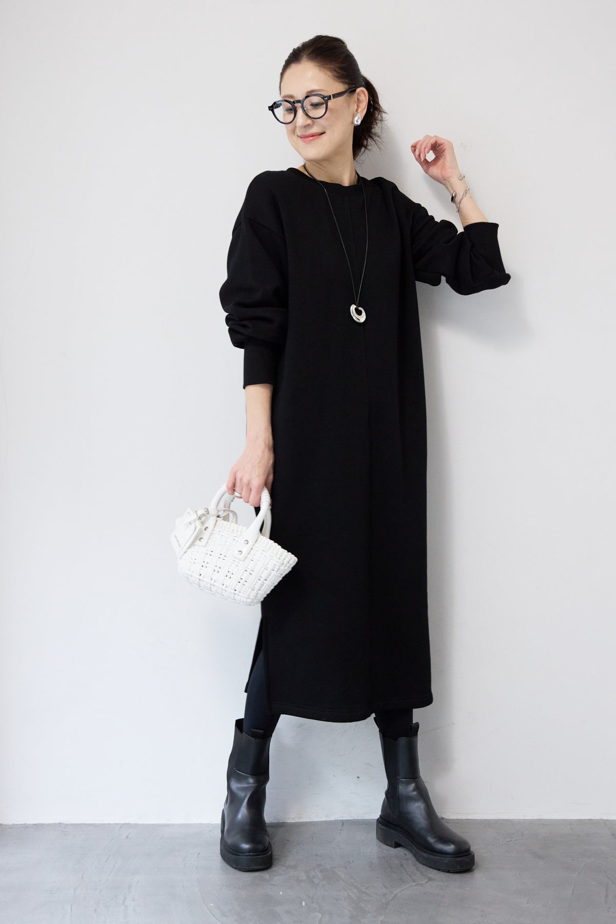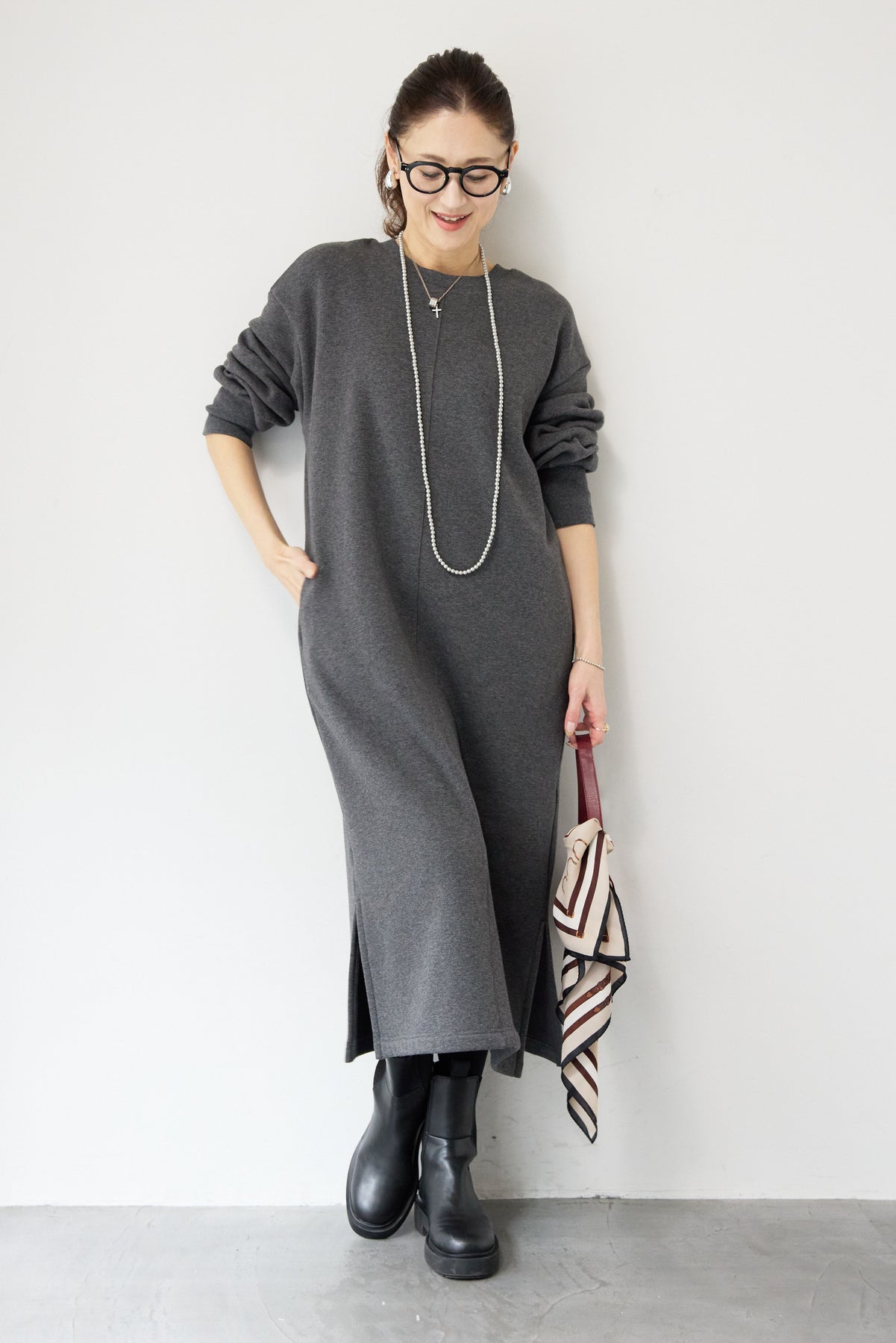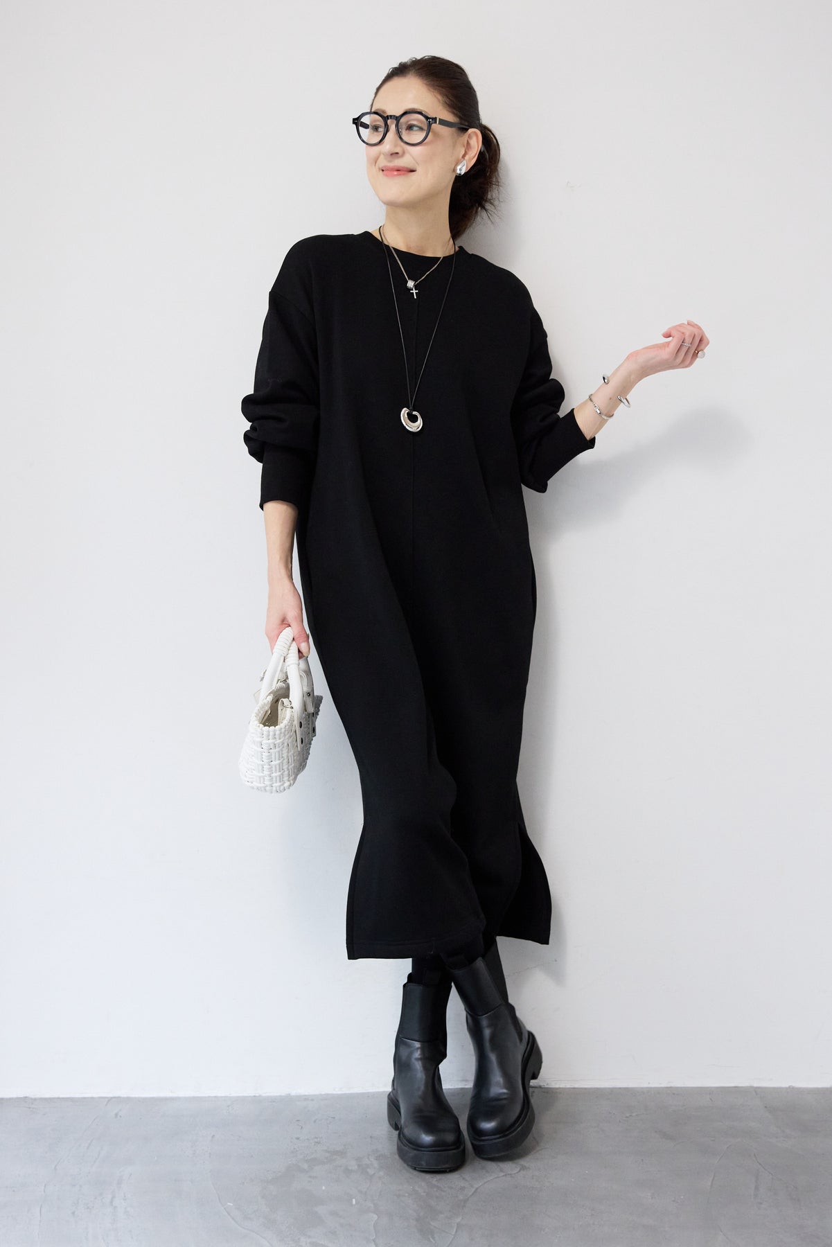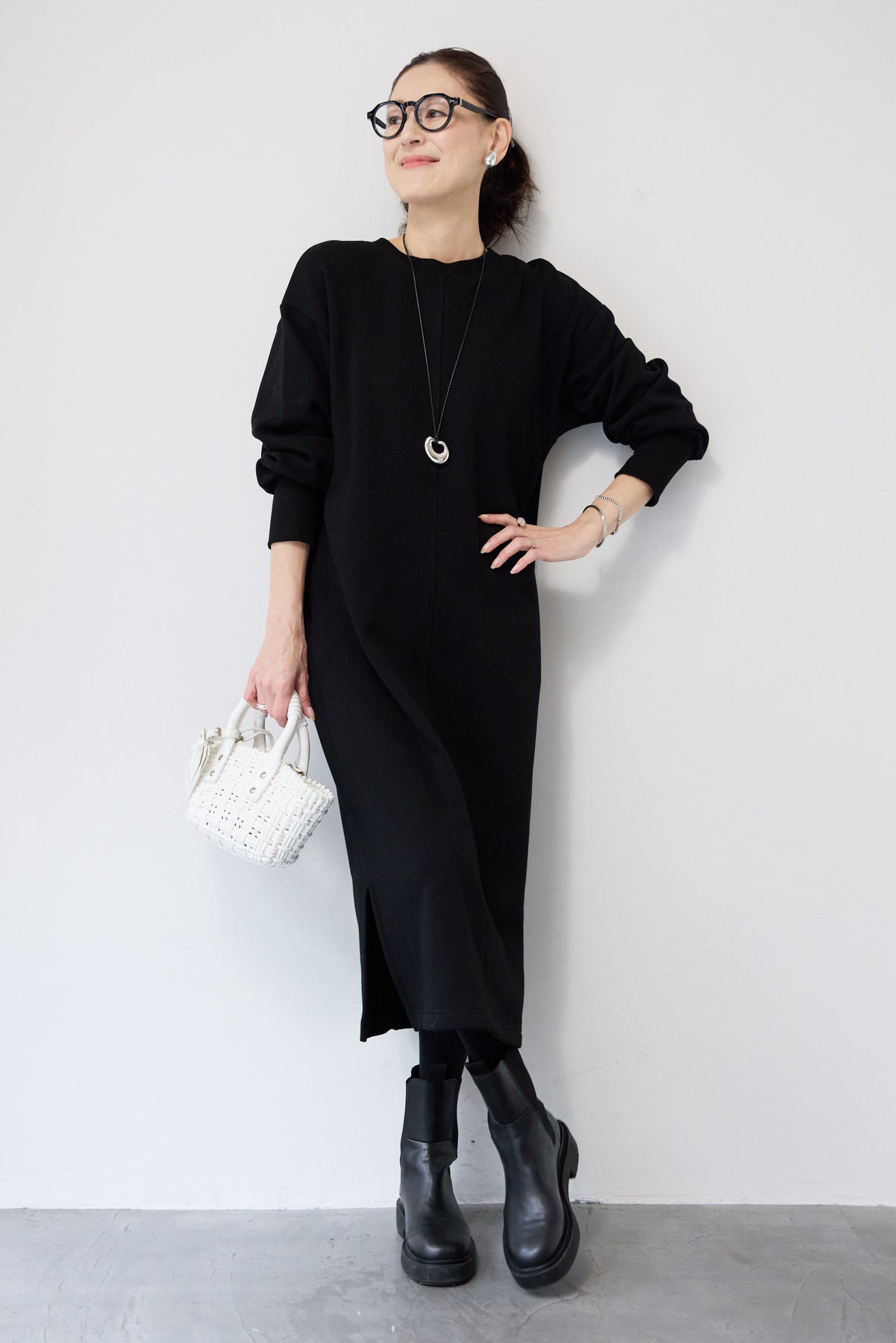 シンプルな中にさりげないデザイン性を効かせた、大人のための裏起毛ワンピース。柔らかくあたたかな裏起毛素材を使用し、寒い季節も快適な着心地を叶えます。フロントは縦ラインを強調する切り替えデザインで、すっきりとした印象に。背中には存在感のあるバックジップを施し、後ろ姿まで抜かりなく仕上げました。着脱のしやすさはもちろん、コーディネートのアクセントにもなるポイントです。程よくゆとりのあるストレートシルエットとロング丈が、体のラインを拾いすぎず上品にカバー。裾にはサイドスリットを入れることで、足さばきが良く、重たく見えないバランスに仕上げています。一枚でさらっと着るだけでサマになり、ブーツやスニーカーなど合わせる小物次第でカジュアルにもきれいめにも活躍します。