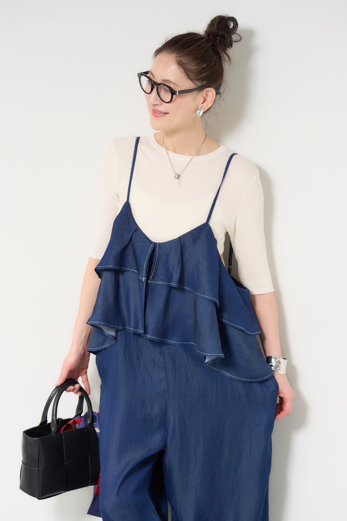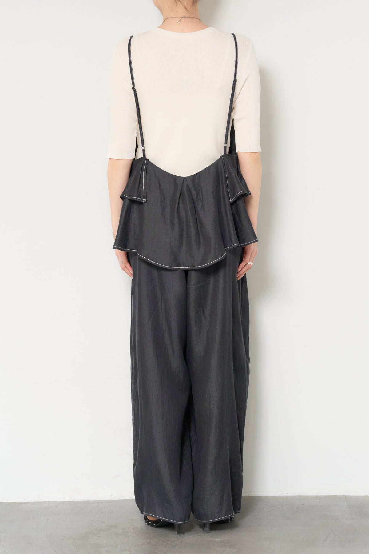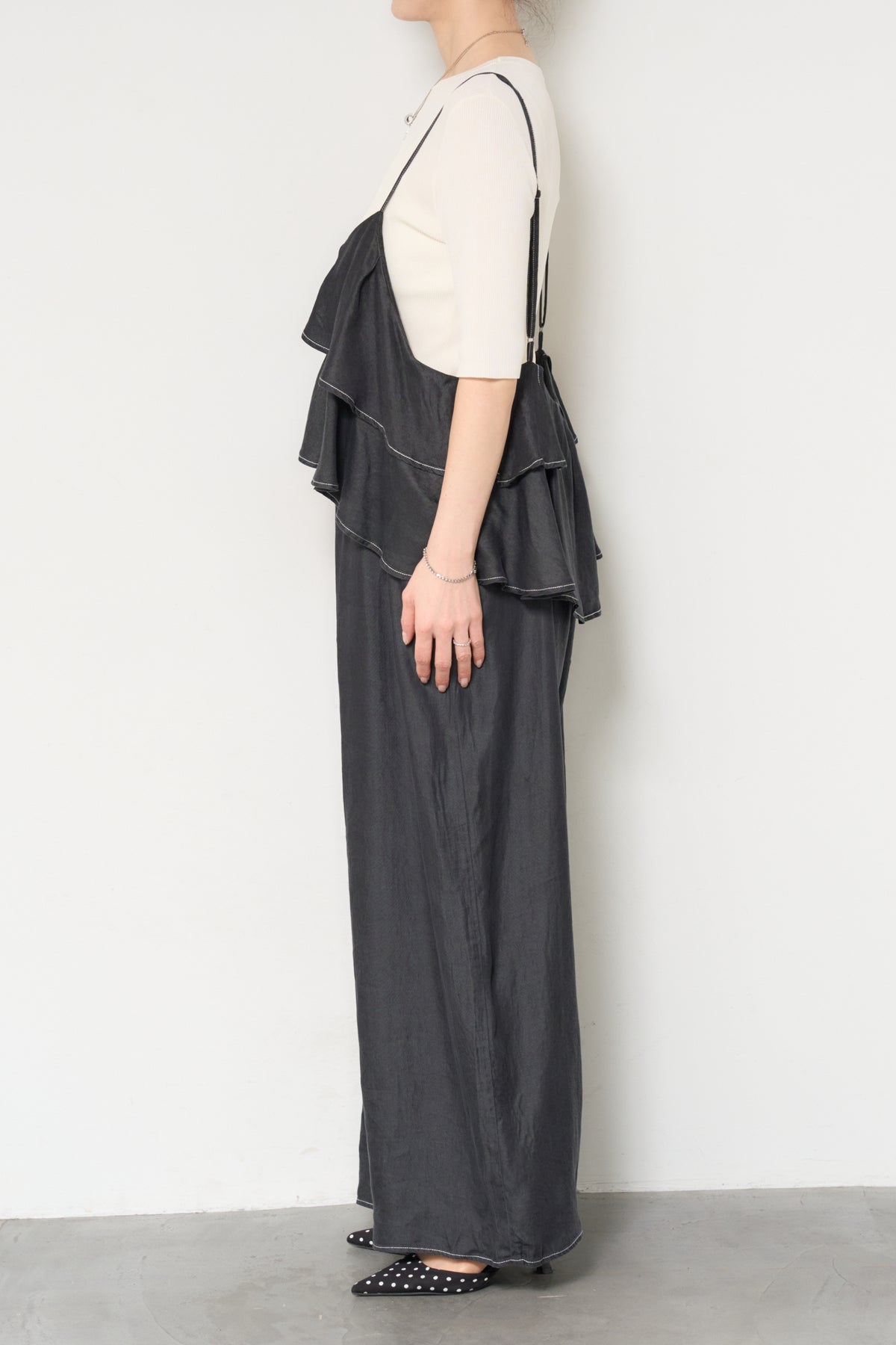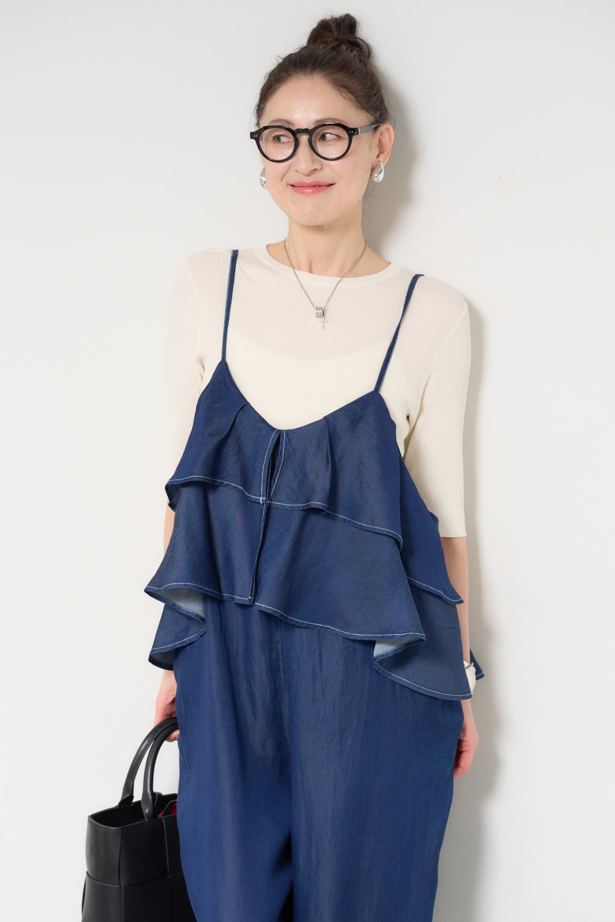 デニム素材にフリルデザインをあしらった、存在感のあるサロペット。胸元から広がるボリュームフリルがコーディネートのアクセントになり、シンプルなインナーと合わせるだけで華やかな印象に。落ち感のある柔らかなデニム素材を使用し、リラックス感のあるワイドシルエットに仕上げました。肩ストラップは長さ調整が可能で、自分に合ったフィット感で着用できます。Tシャツやニットとのレイヤードスタイルを楽しめる、デイリーに活躍する一着です。