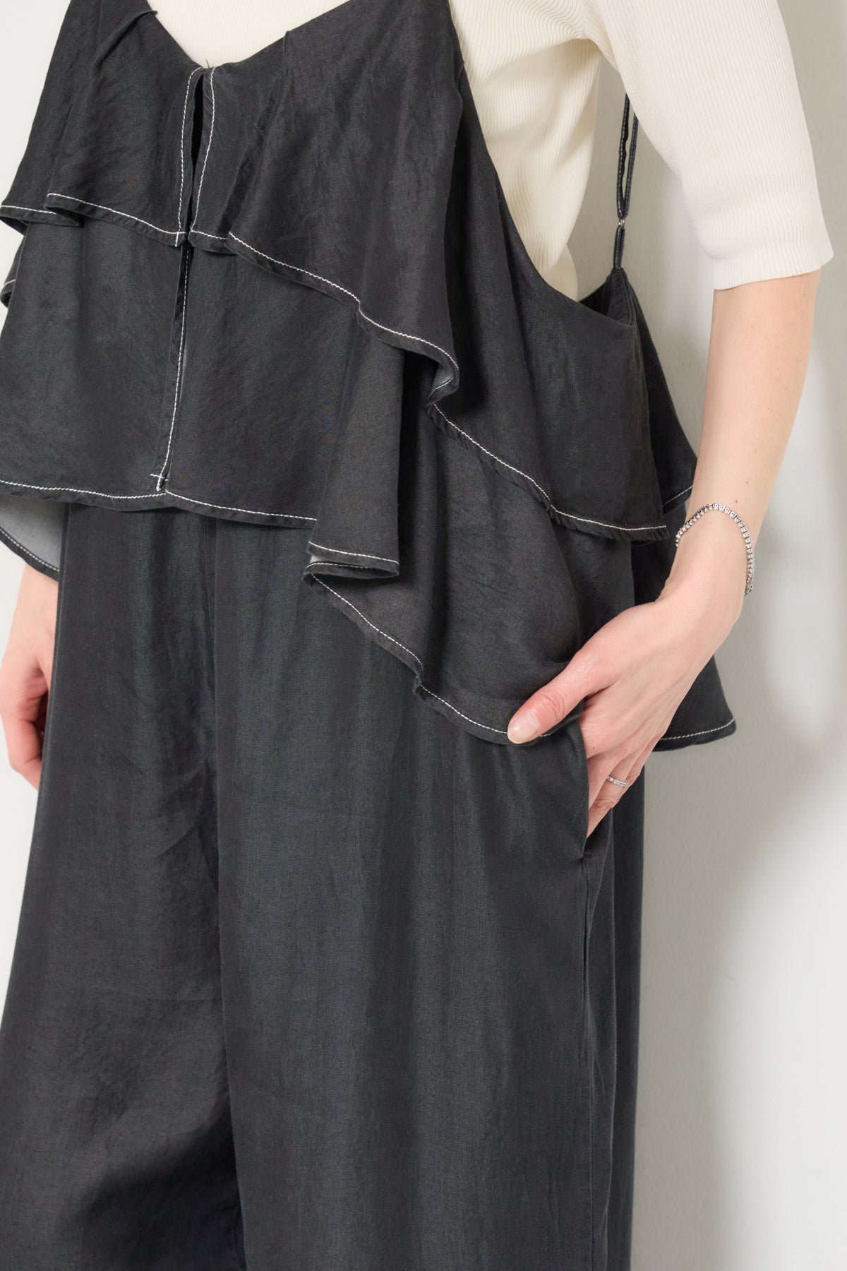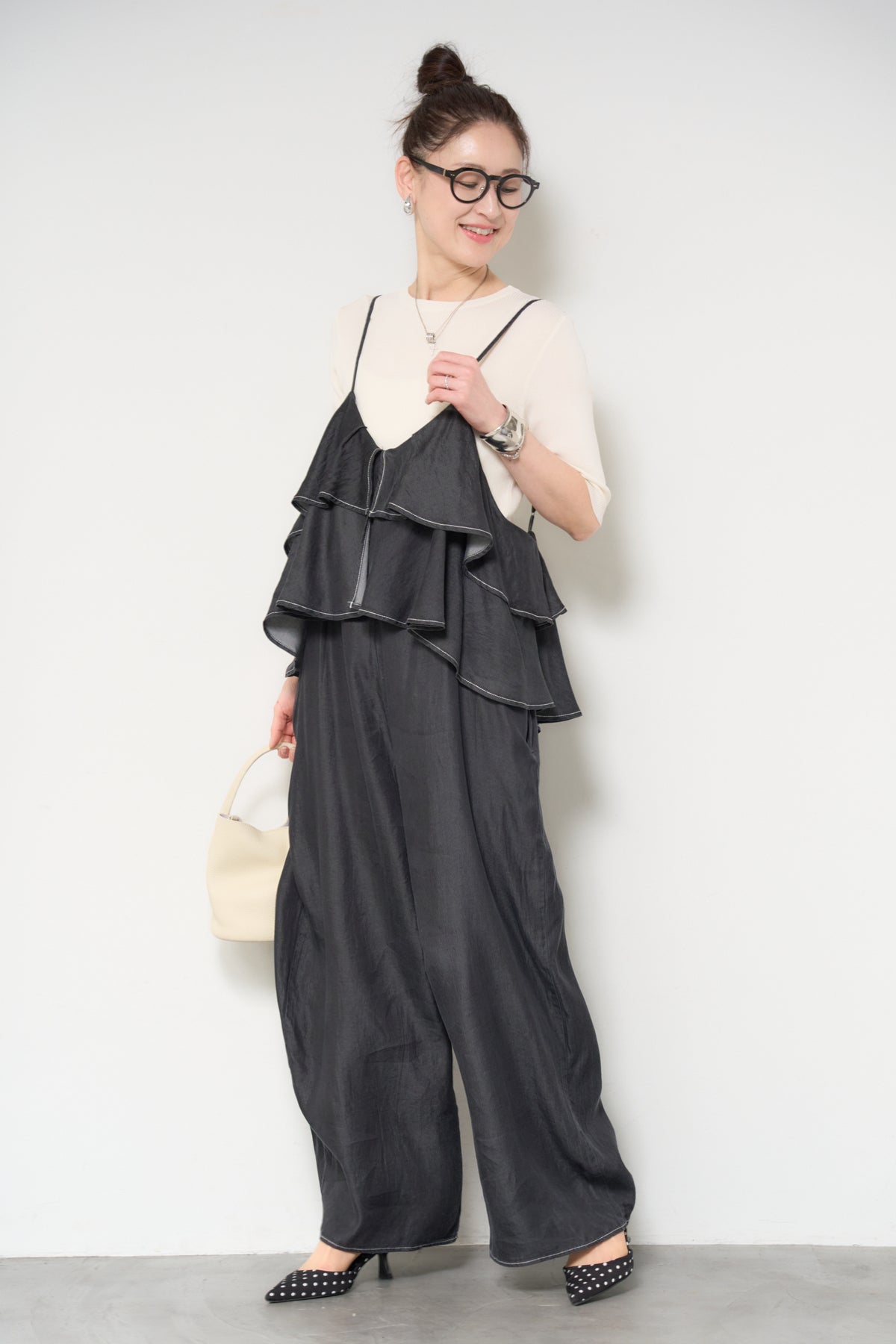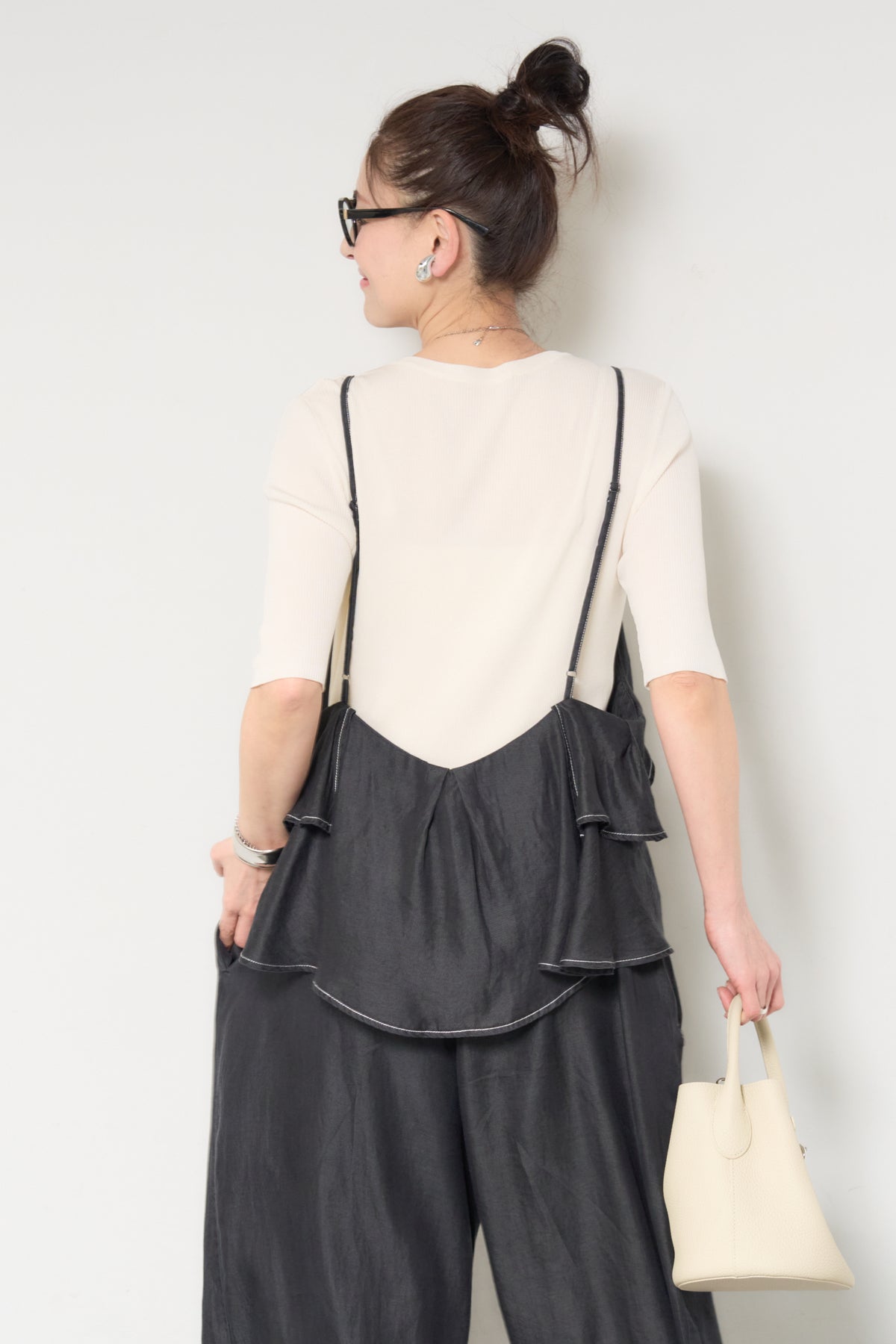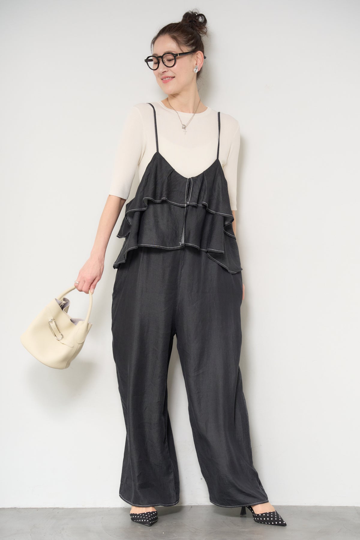 デニム素材にフリルデザインをあしらった、存在感のあるサロペット。胸元から広がるボリュームフリルがコーディネートのアクセントになり、シンプルなインナーと合わせるだけで華やかな印象に。落ち感のある柔らかなデニム素材を使用し、リラックス感のあるワイドシルエットに仕上げました。肩ストラップは長さ調整が可能で、自分に合ったフィット感で着用できます。Tシャツやニットとのレイヤードスタイルを楽しめる、デイリーに活躍する一着です。