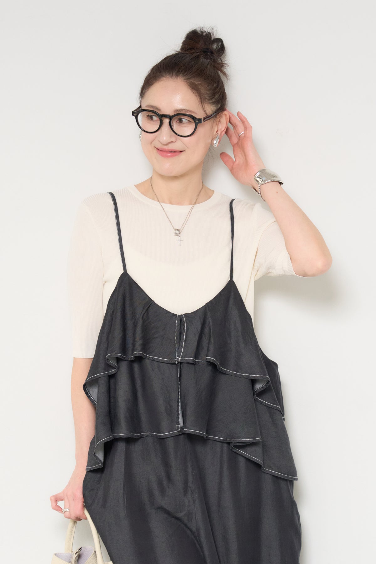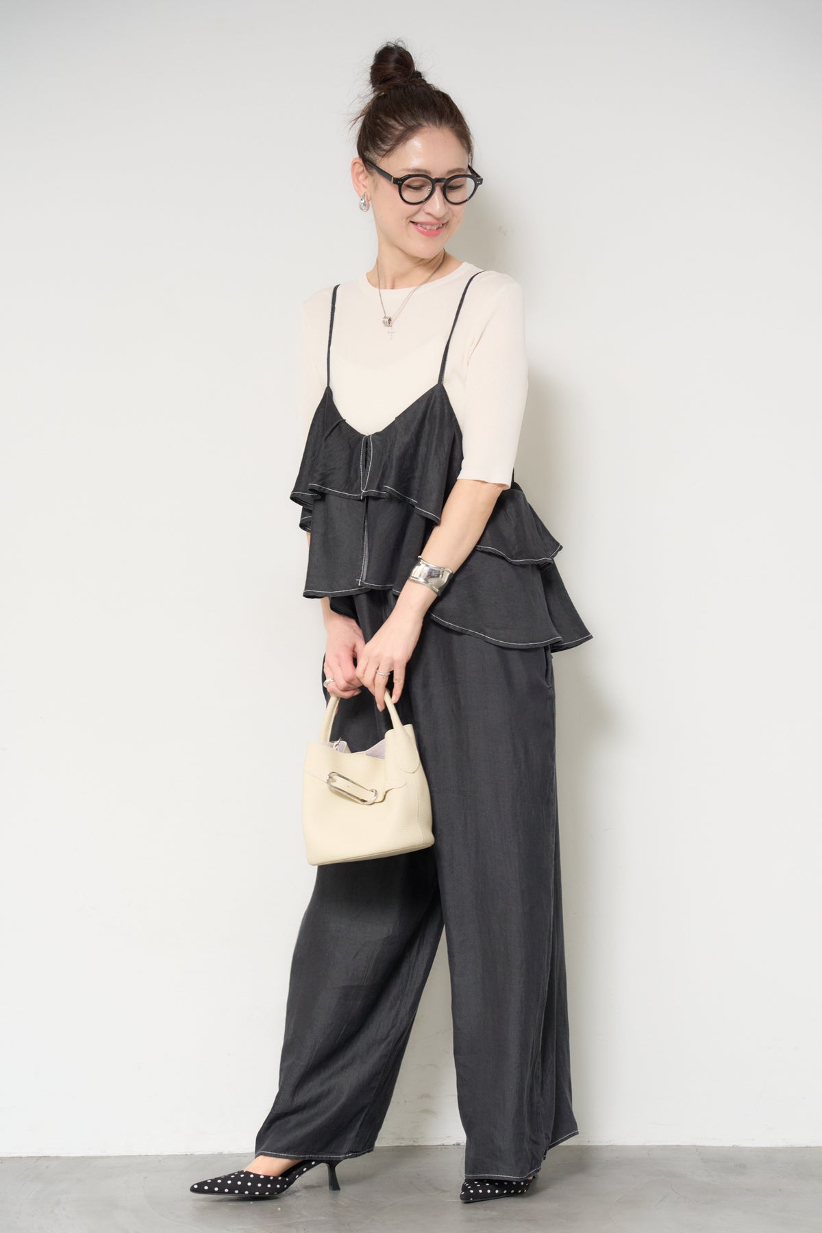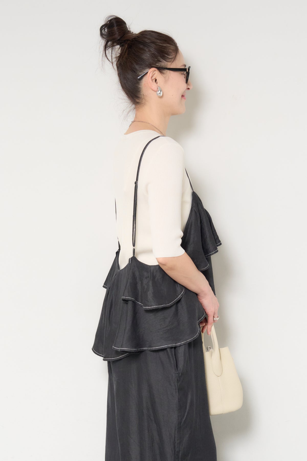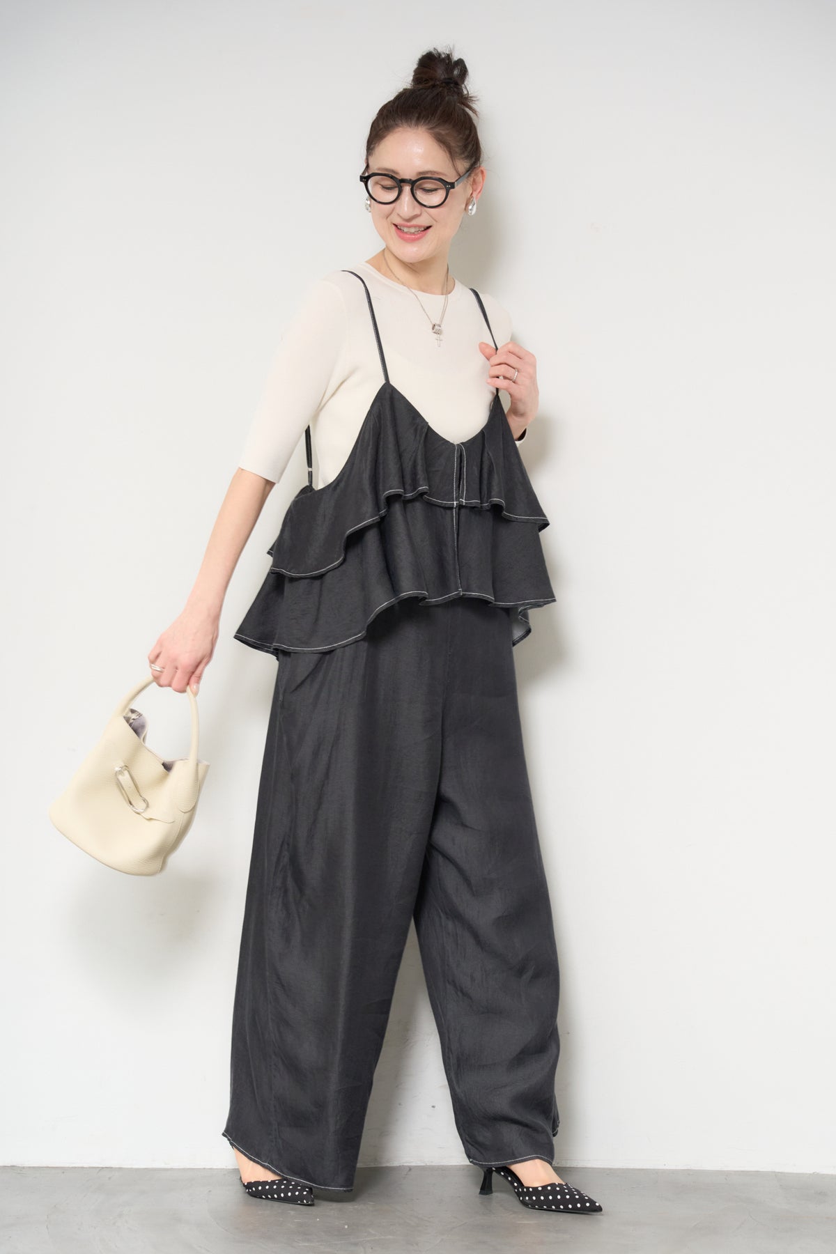 デニム素材にフリルデザインをあしらった、存在感のあるサロペット。胸元から広がるボリュームフリルがコーディネートのアクセントになり、シンプルなインナーと合わせるだけで華やかな印象に。落ち感のある柔らかなデニム素材を使用し、リラックス感のあるワイドシルエットに仕上げました。肩ストラップは長さ調整が可能で、自分に合ったフィット感で着用できます。Tシャツやニットとのレイヤードスタイルを楽しめる、デイリーに活躍する一着です。