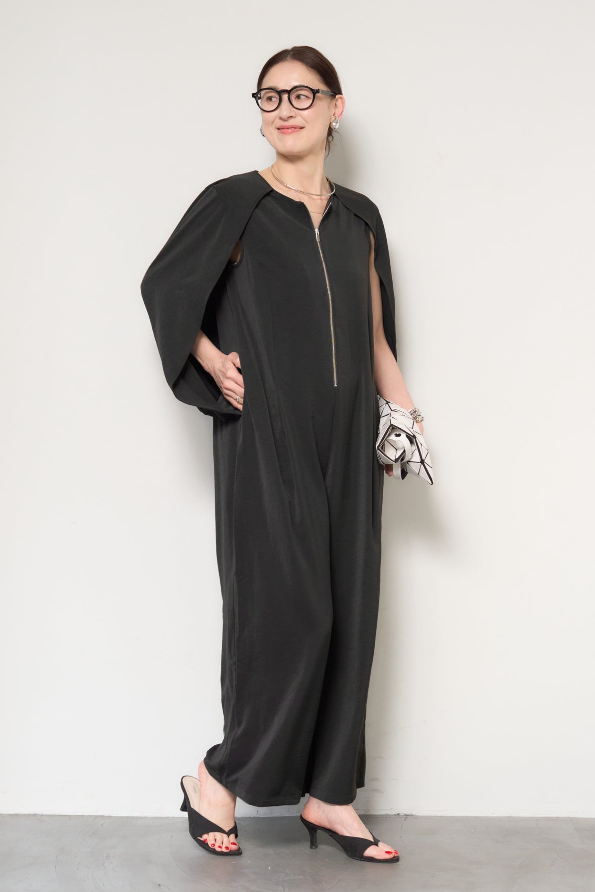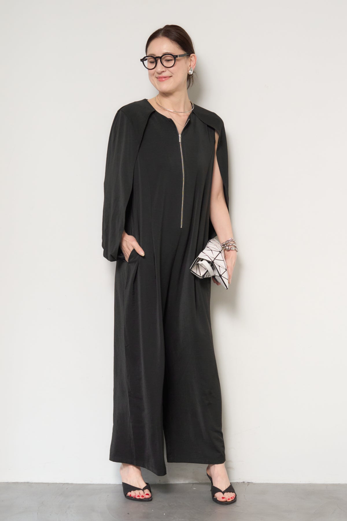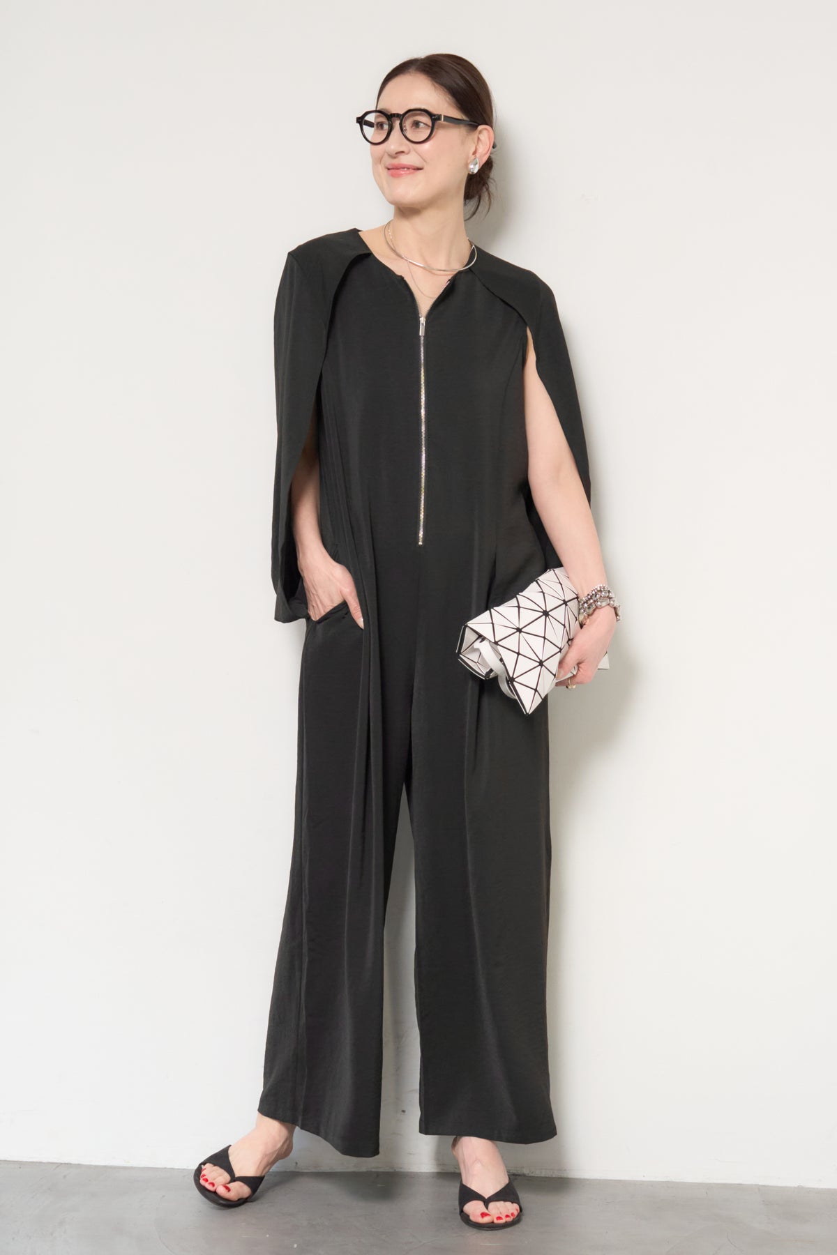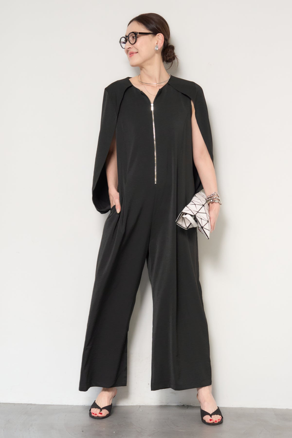 一枚で完成する、洗練された大人のためのケープマントオールインワン。マントを羽織ったようなデザインが特徴で、動くたびに美しいドレープを描き、上品かつモードな印象を演出します。フロントには縦ラインを強調するファスナーデザインを採用し、すっきりとした縦長シルエットを実現。体のラインを拾いすぎない落ち感のある素材が、体型カバーとスタイルアップを同時に叶えます。ケープ部分は腕を通せる仕様で、軽やかな着心地と動きやすさも兼ね備えています。パンツ部分は程よいワイドシルエットで、リラックス感がありながらもきちんと感のある仕上がり。デイリーにはもちろん、アクセサリーやバッグ次第でオケージョンやお食事シーンにも活躍します。