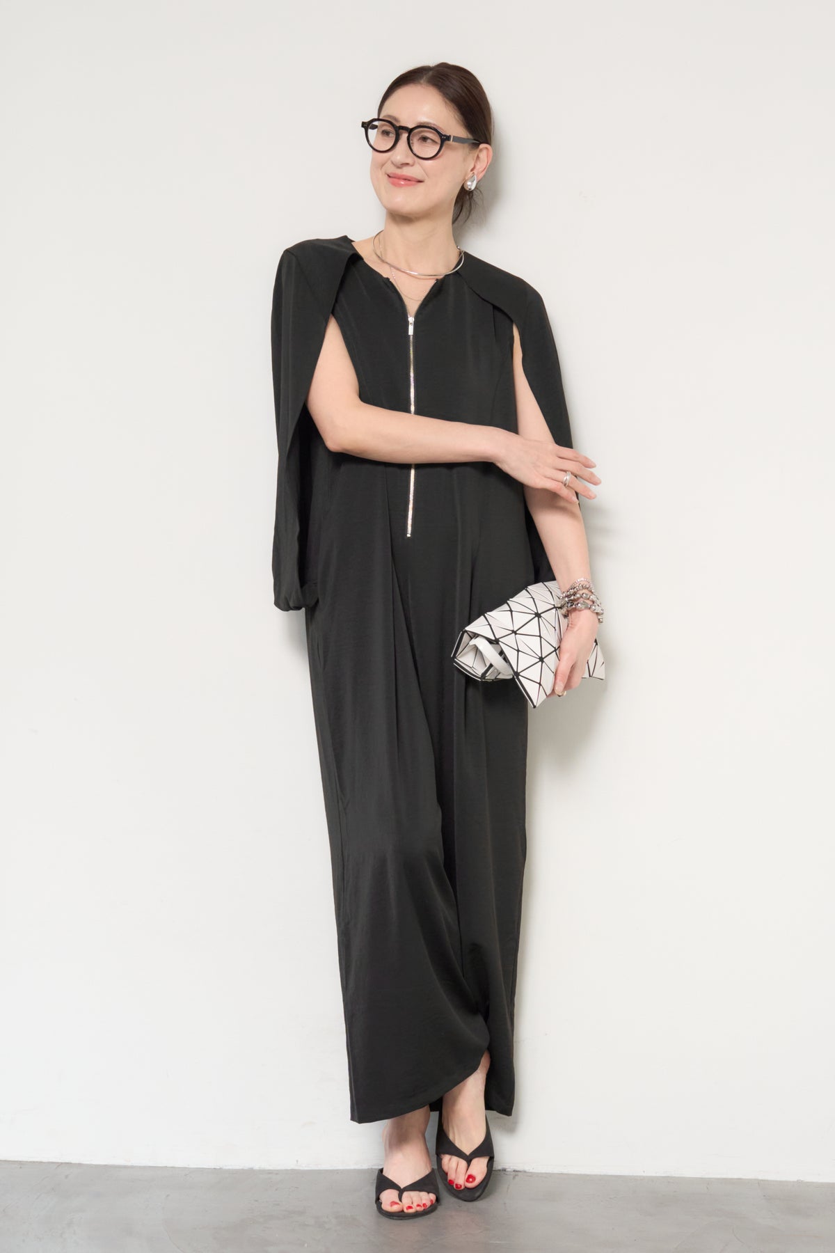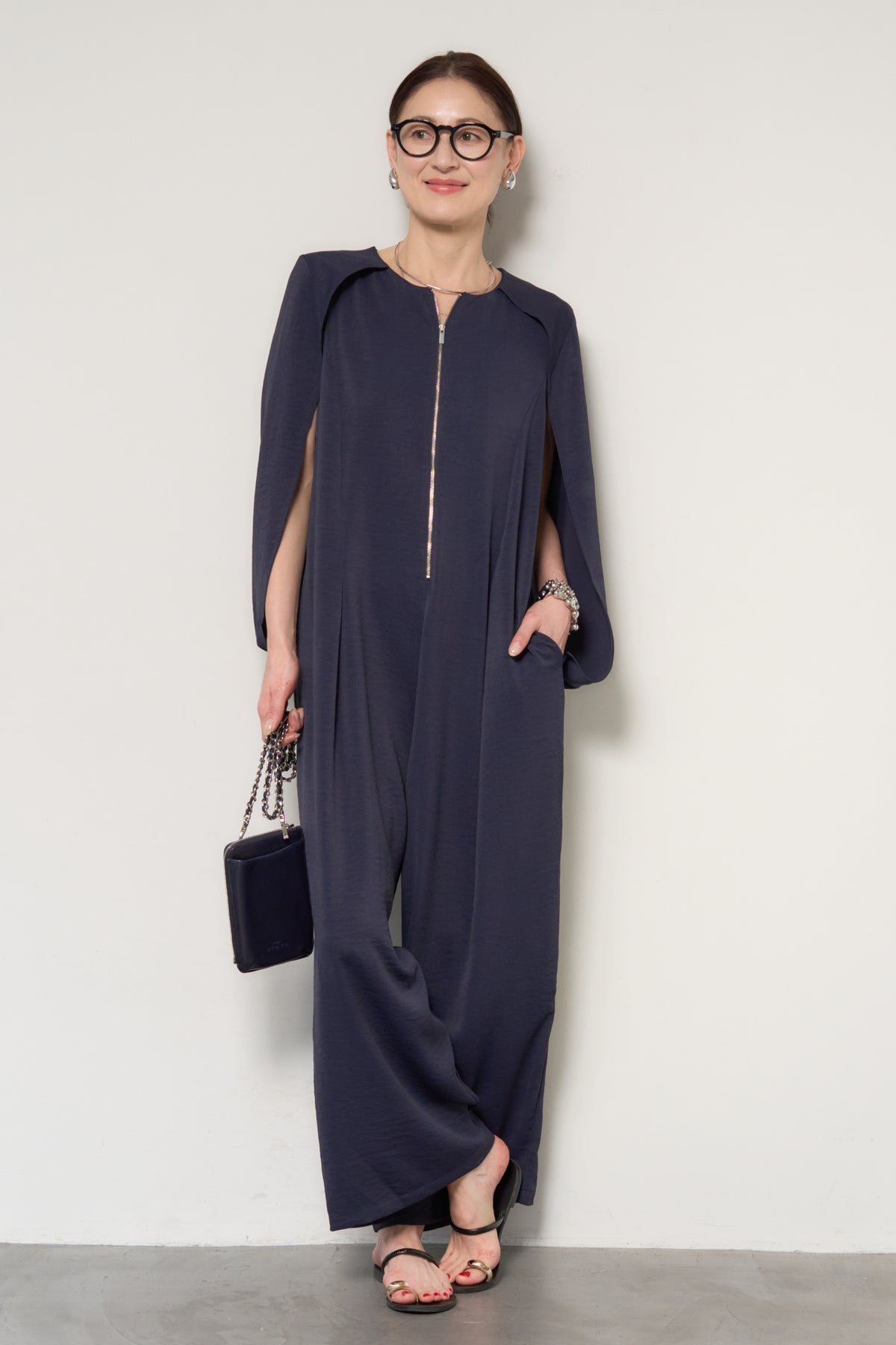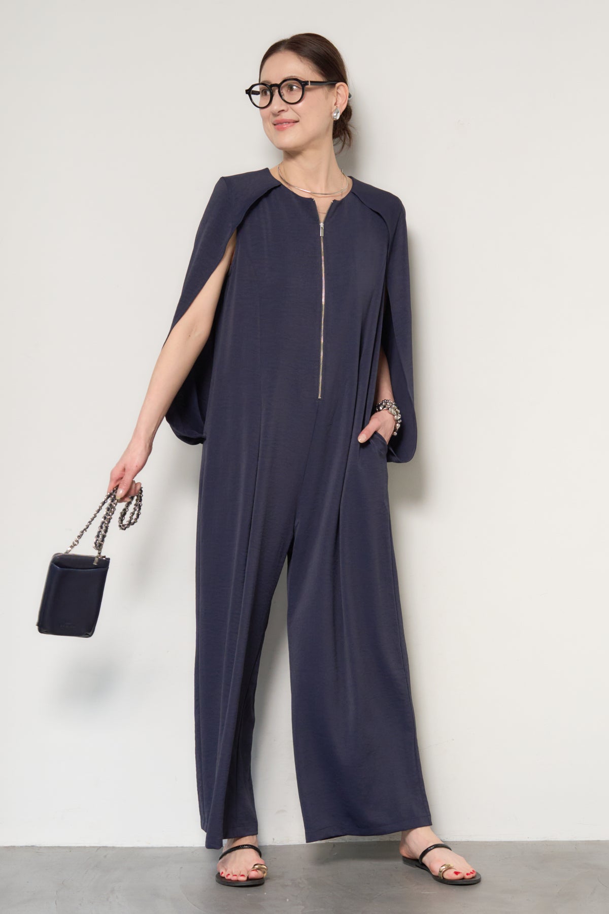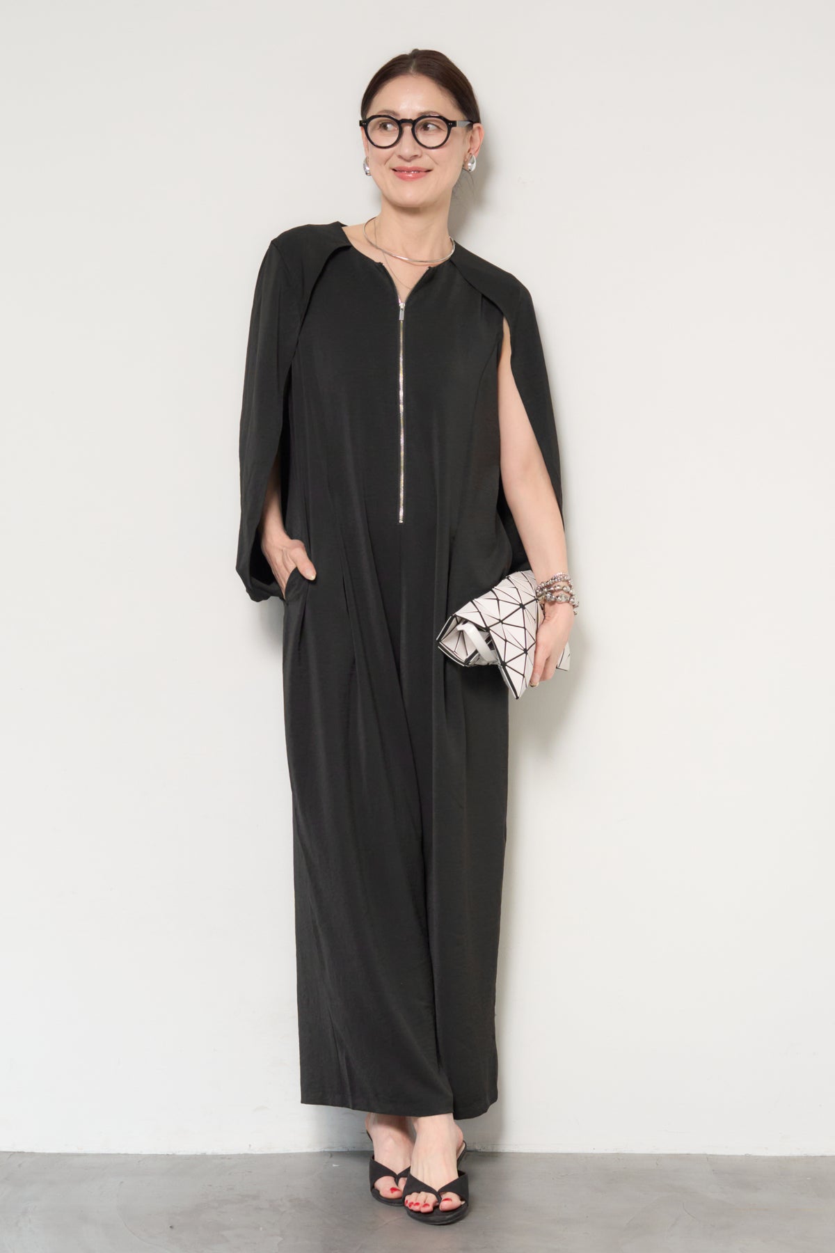 一枚で完成する、洗練された大人のためのケープマントオールインワン。マントを羽織ったようなデザインが特徴で、動くたびに美しいドレープを描き、上品かつモードな印象を演出します。フロントには縦ラインを強調するファスナーデザインを採用し、すっきりとした縦長シルエットを実現。体のラインを拾いすぎない落ち感のある素材が、体型カバーとスタイルアップを同時に叶えます。ケープ部分は腕を通せる仕様で、軽やかな着心地と動きやすさも兼ね備えています。パンツ部分は程よいワイドシルエットで、リラックス感がありながらもきちんと感のある仕上がり。デイリーにはもちろん、アクセサリーやバッグ次第でオケージョンやお食事シーンにも活躍します。