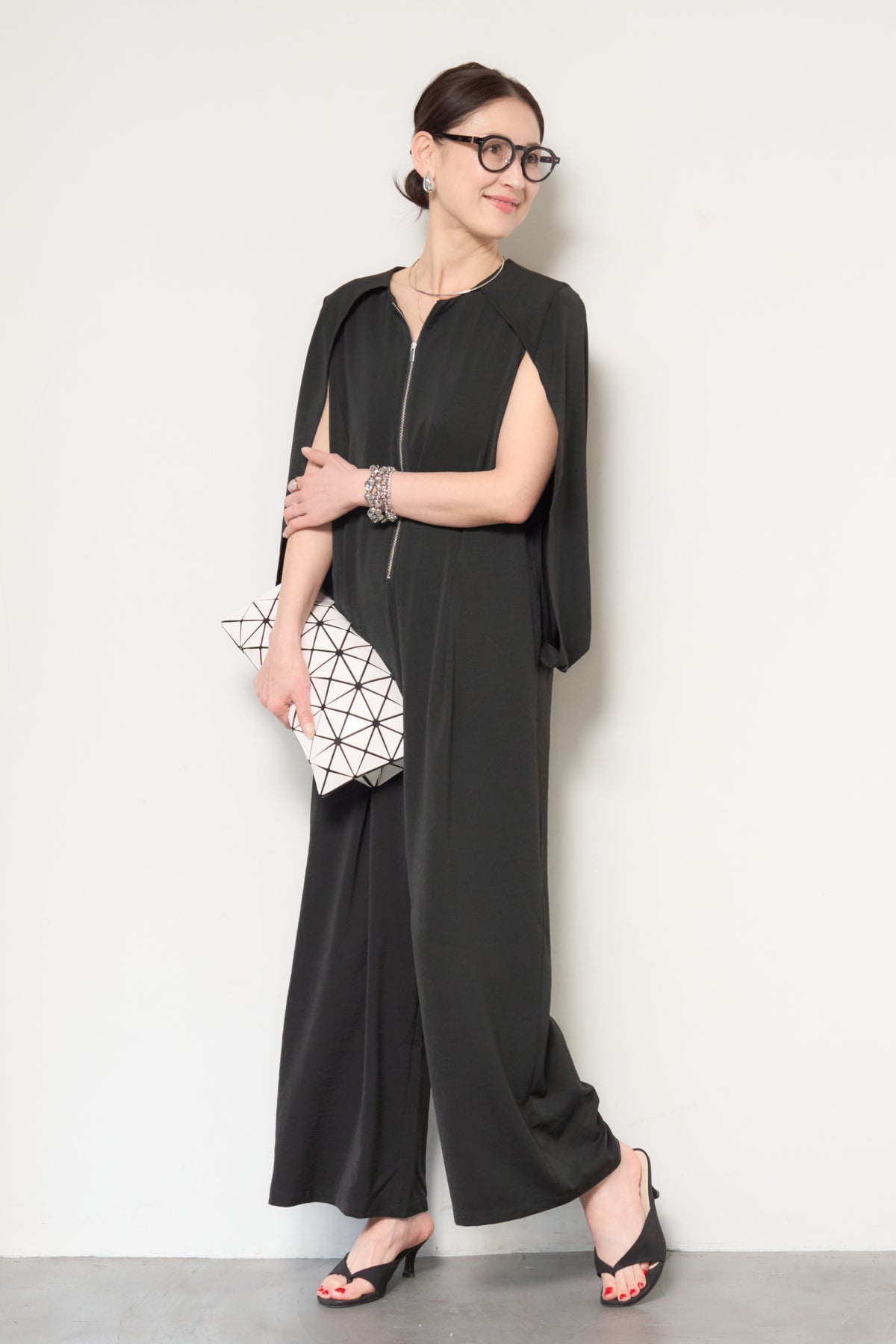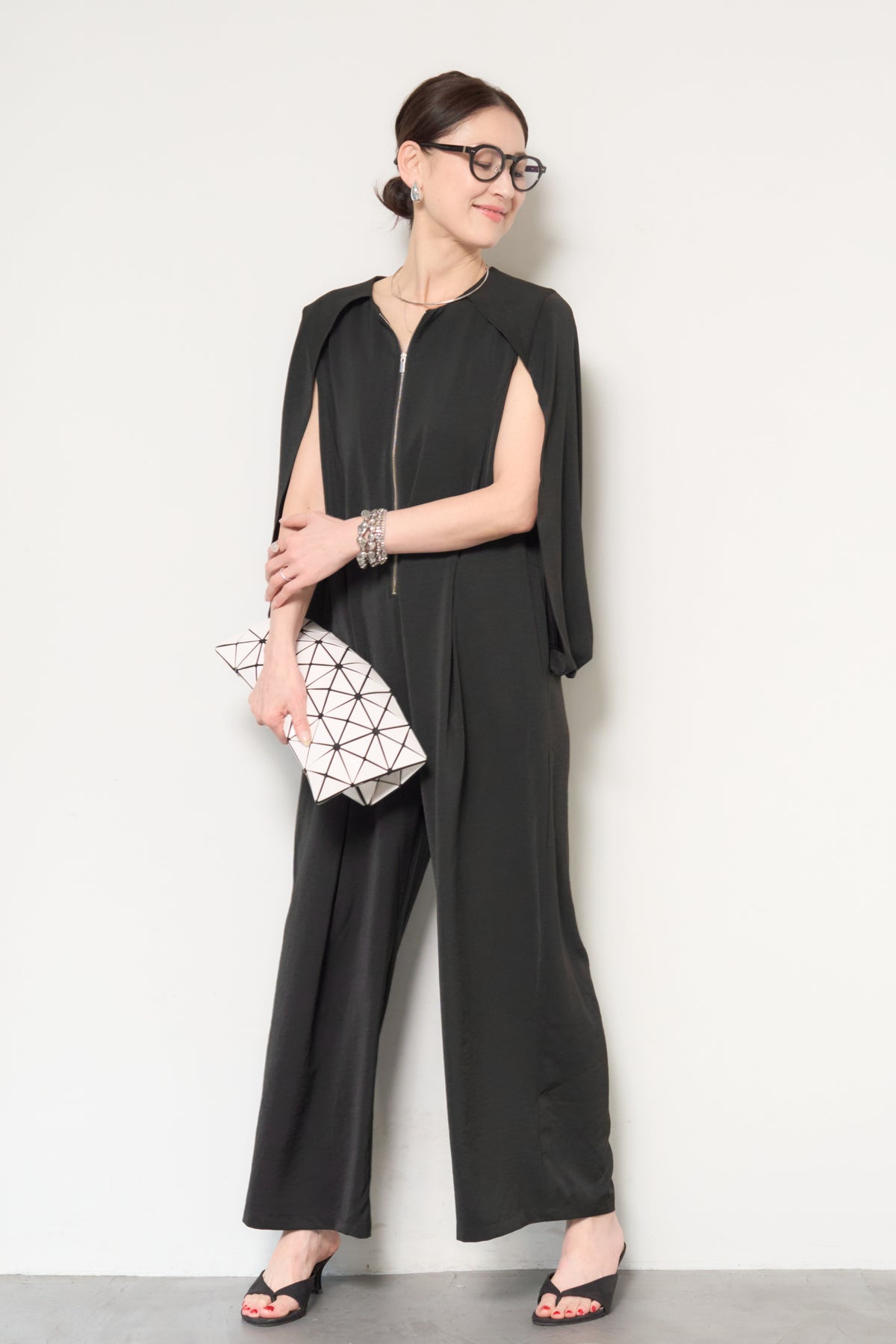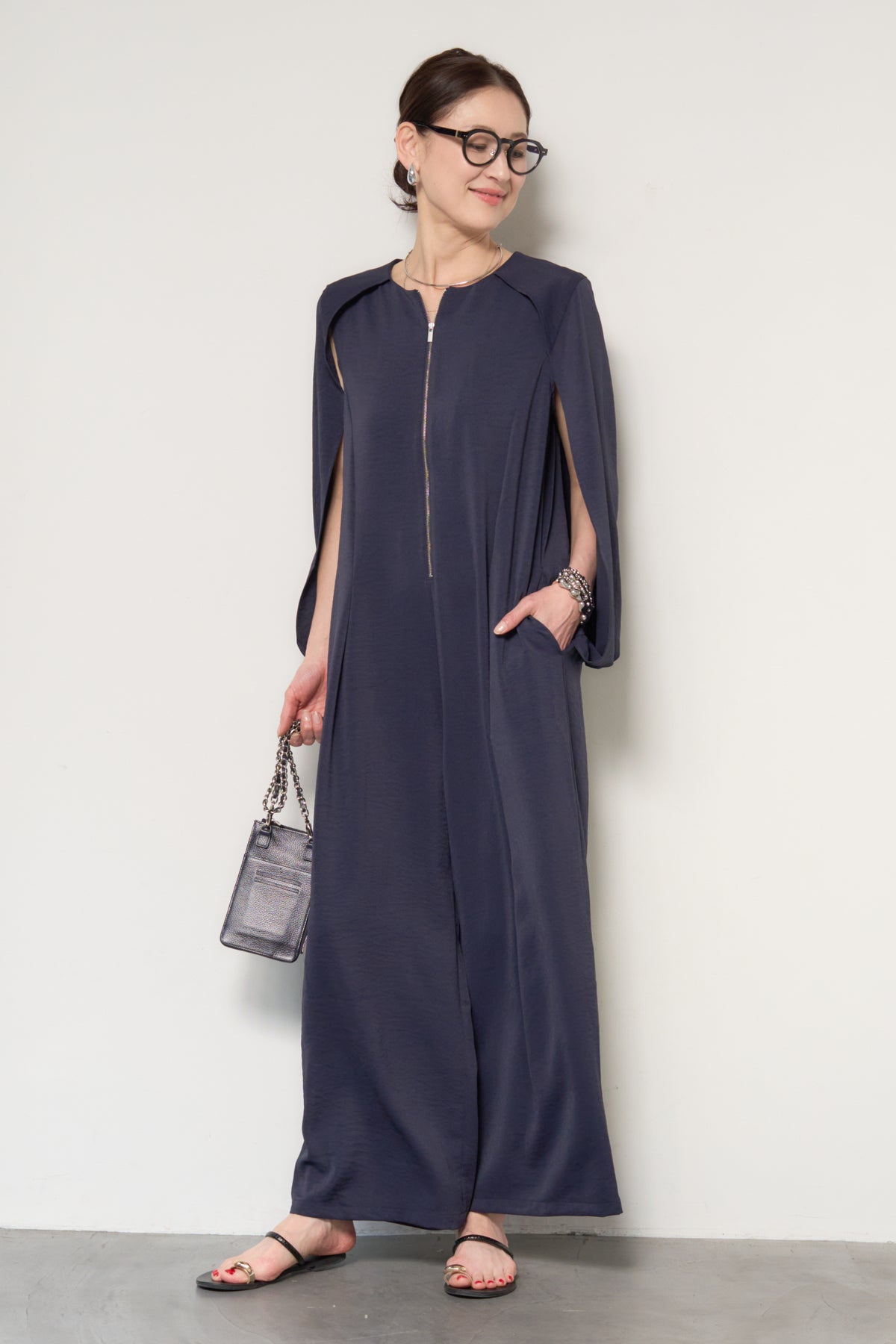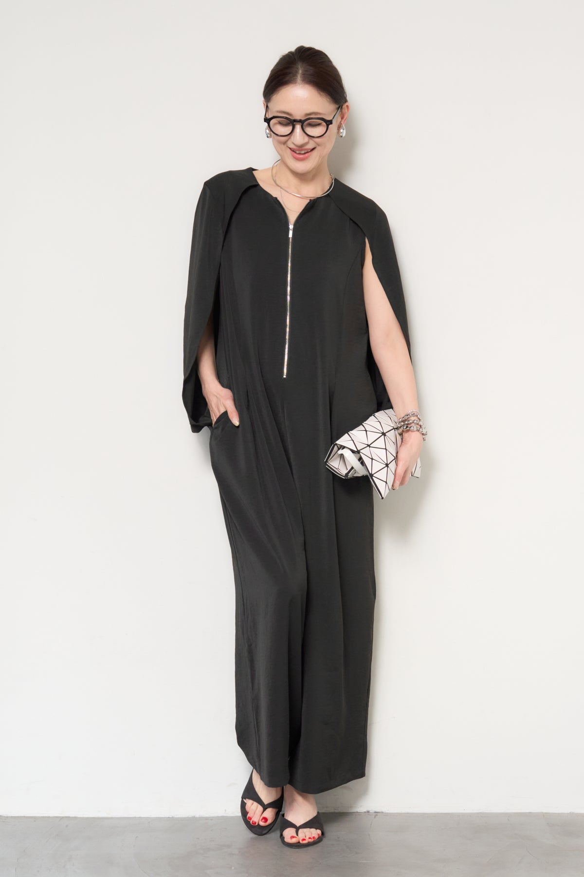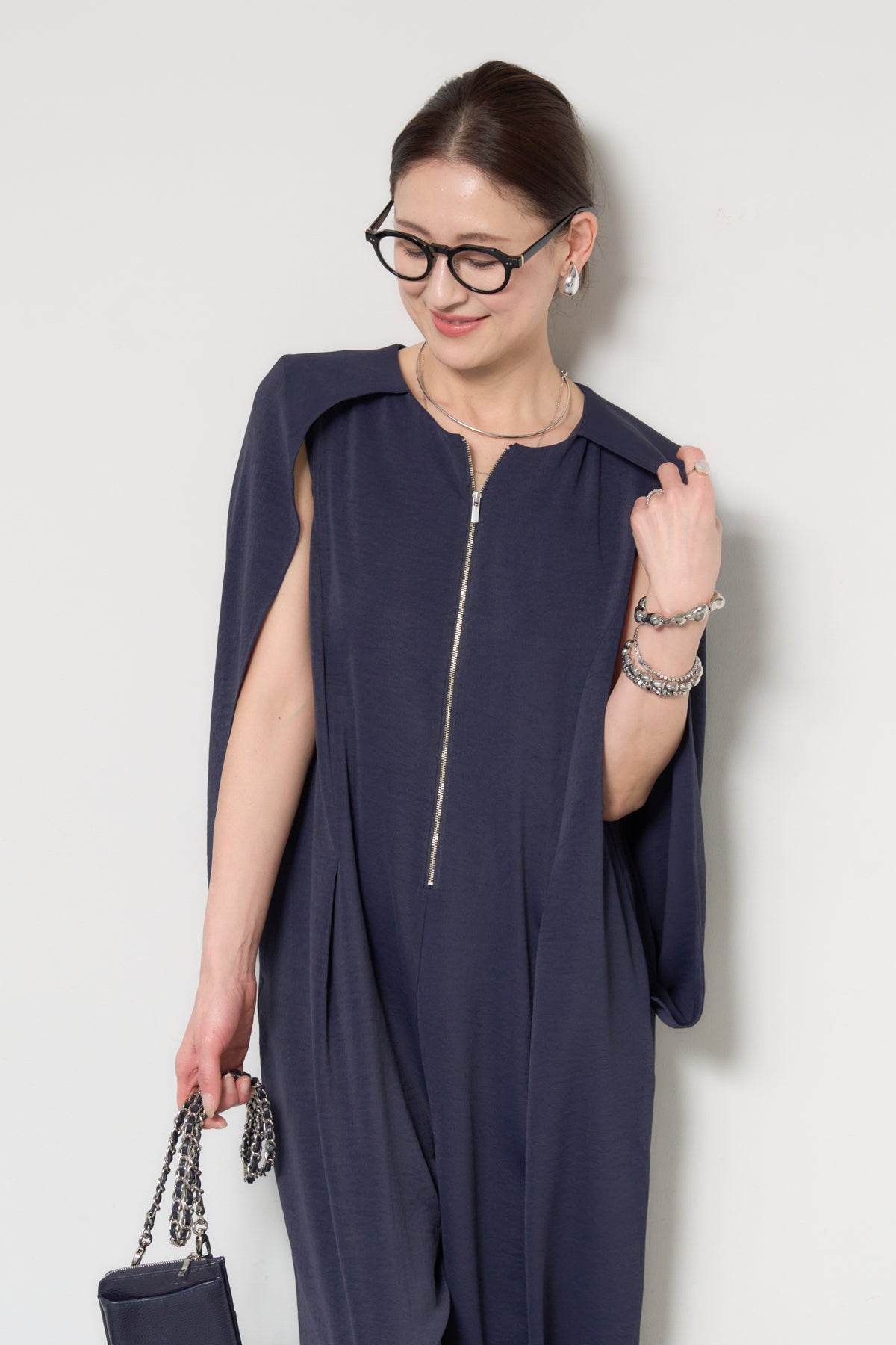 一枚で完成する、洗練された大人のためのケープマントオールインワン。マントを羽織ったようなデザインが特徴で、動くたびに美しいドレープを描き、上品かつモードな印象を演出します。フロントには縦ラインを強調するファスナーデザインを採用し、すっきりとした縦長シルエットを実現。体のラインを拾いすぎない落ち感のある素材が、体型カバーとスタイルアップを同時に叶えます。ケープ部分は腕を通せる仕様で、軽やかな着心地と動きやすさも兼ね備えています。パンツ部分は程よいワイドシルエットで、リラックス感がありながらもきちんと感のある仕上がり。デイリーにはもちろん、アクセサリーやバッグ次第でオケージョンやお食事シーンにも活躍します。