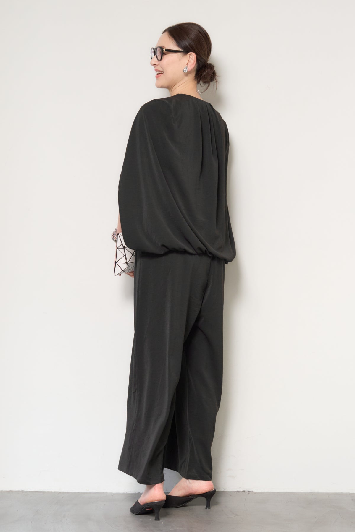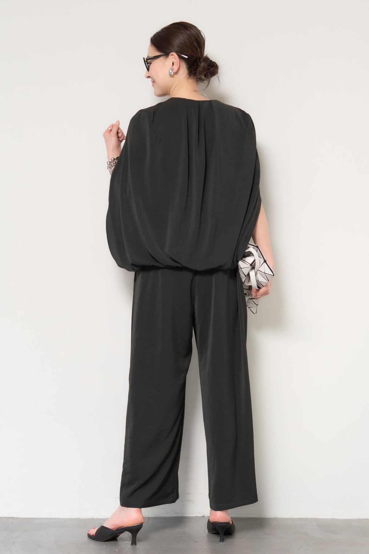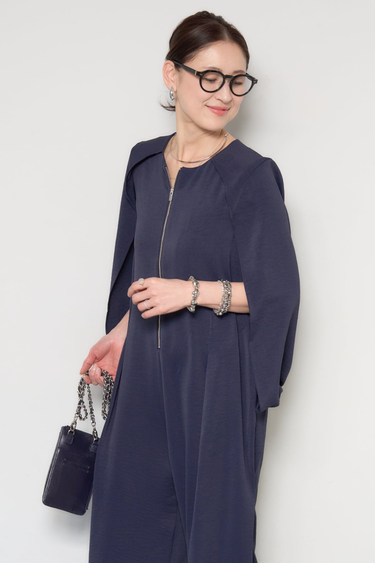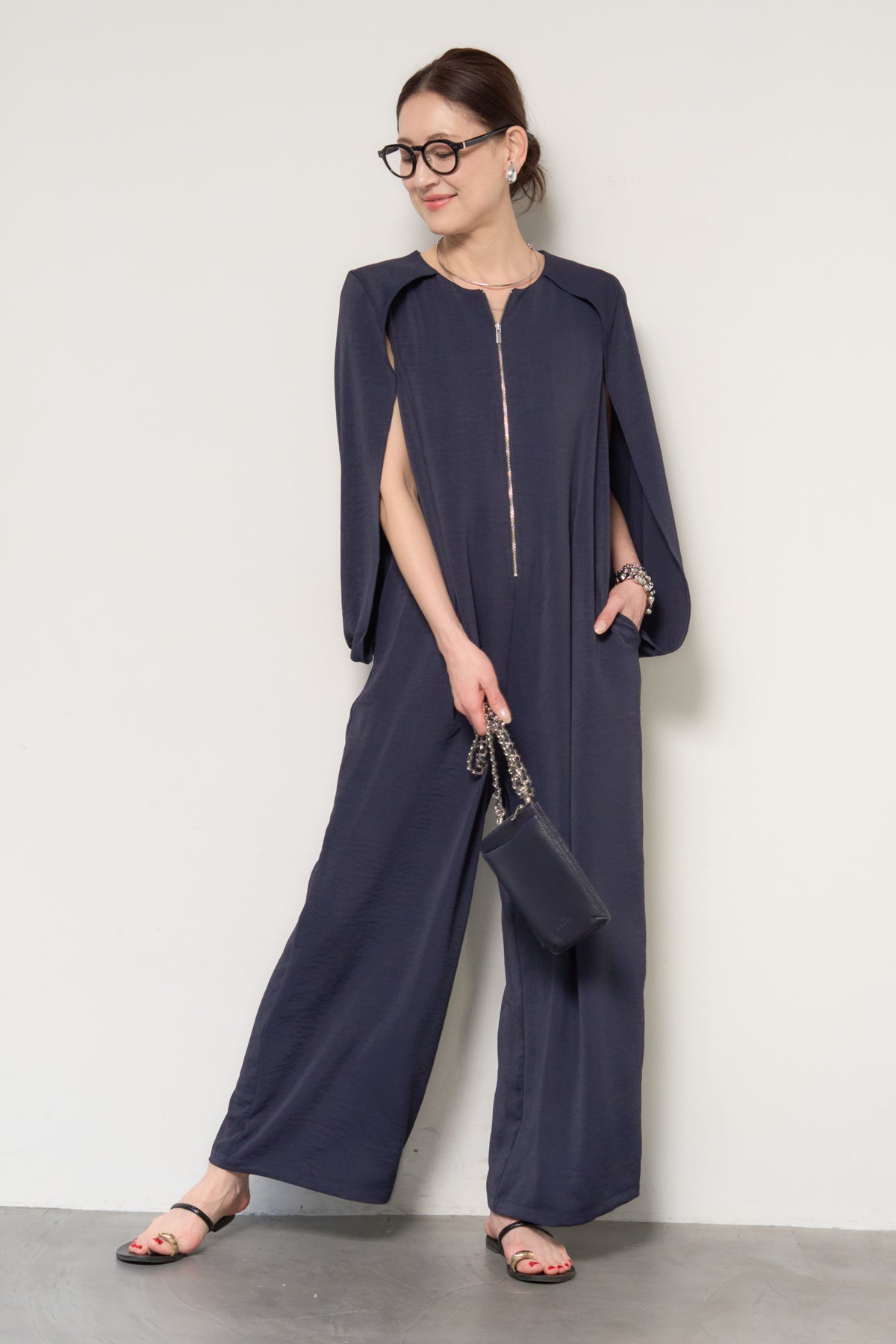 一枚で完成する、洗練された大人のためのケープマントオールインワン。マントを羽織ったようなデザインが特徴で、動くたびに美しいドレープを描き、上品かつモードな印象を演出します。フロントには縦ラインを強調するファスナーデザインを採用し、すっきりとした縦長シルエットを実現。体のラインを拾いすぎない落ち感のある素材が、体型カバーとスタイルアップを同時に叶えます。ケープ部分は腕を通せる仕様で、軽やかな着心地と動きやすさも兼ね備えています。パンツ部分は程よいワイドシルエットで、リラックス感がありながらもきちんと感のある仕上がり。デイリーにはもちろん、アクセサリーやバッグ次第でオケージョンやお食事シーンにも活躍します。