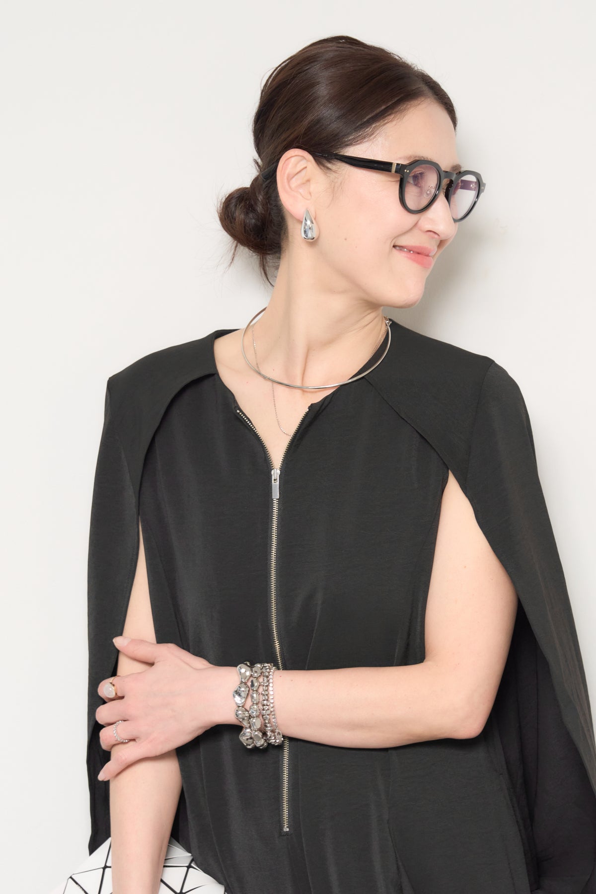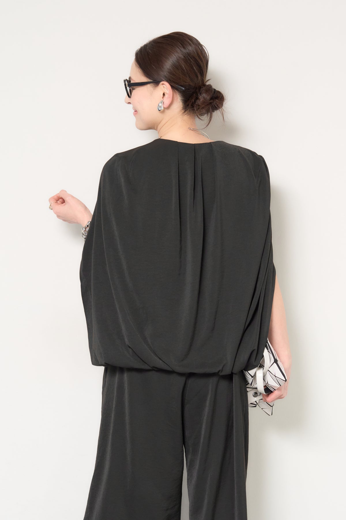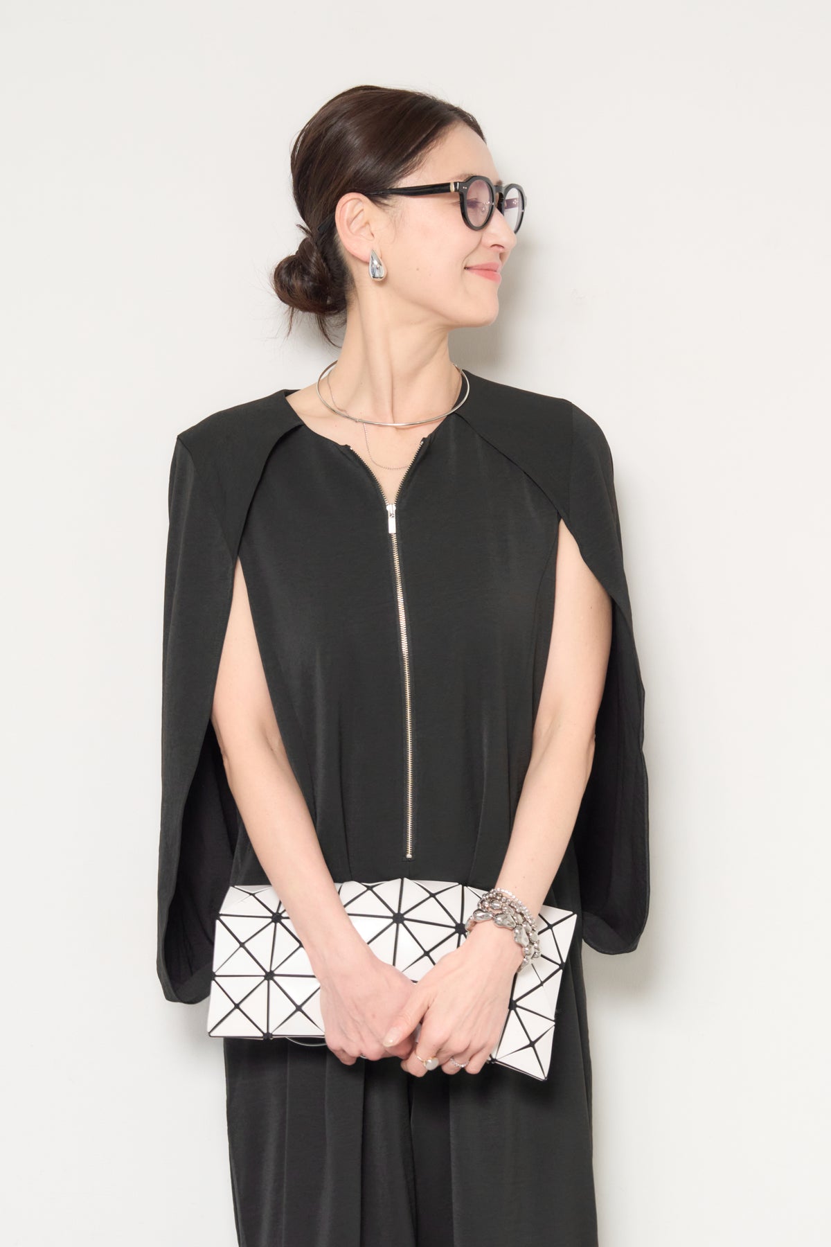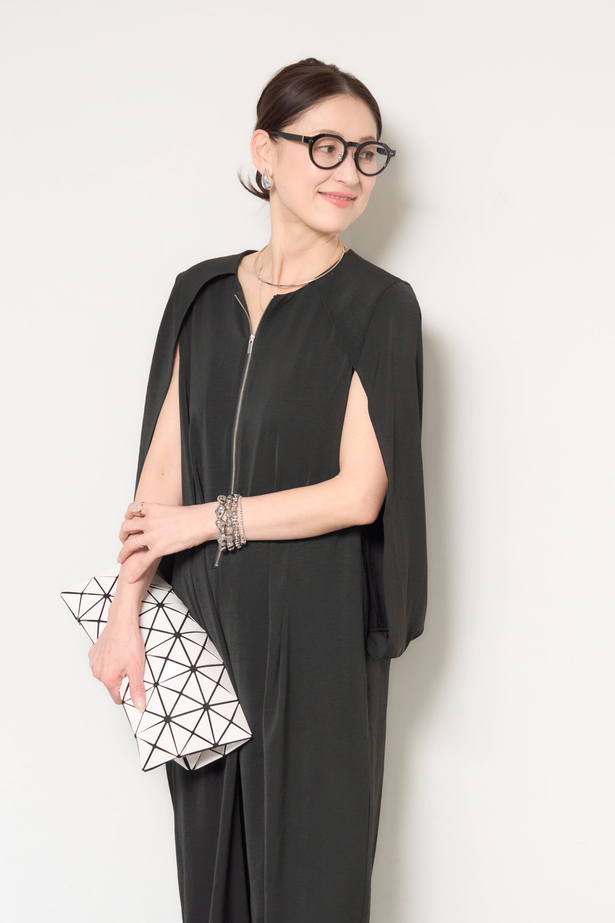 一枚で完成する、洗練された大人のためのケープマントオールインワン。マントを羽織ったようなデザインが特徴で、動くたびに美しいドレープを描き、上品かつモードな印象を演出します。フロントには縦ラインを強調するファスナーデザインを採用し、すっきりとした縦長シルエットを実現。体のラインを拾いすぎない落ち感のある素材が、体型カバーとスタイルアップを同時に叶えます。ケープ部分は腕を通せる仕様で、軽やかな着心地と動きやすさも兼ね備えています。パンツ部分は程よいワイドシルエットで、リラックス感がありながらもきちんと感のある仕上がり。デイリーにはもちろん、アクセサリーやバッグ次第でオケージョンやお食事シーンにも活躍します。