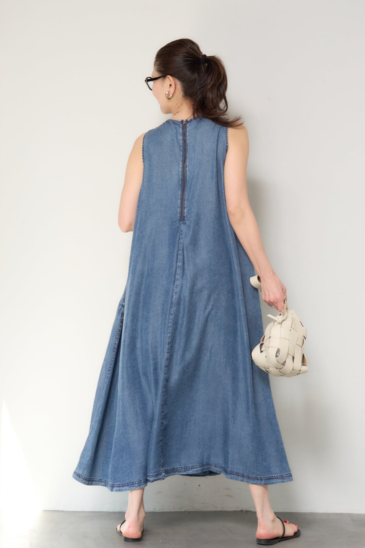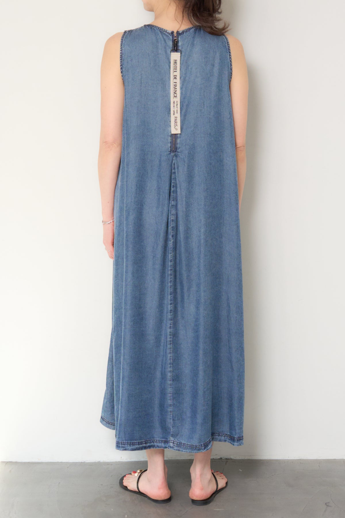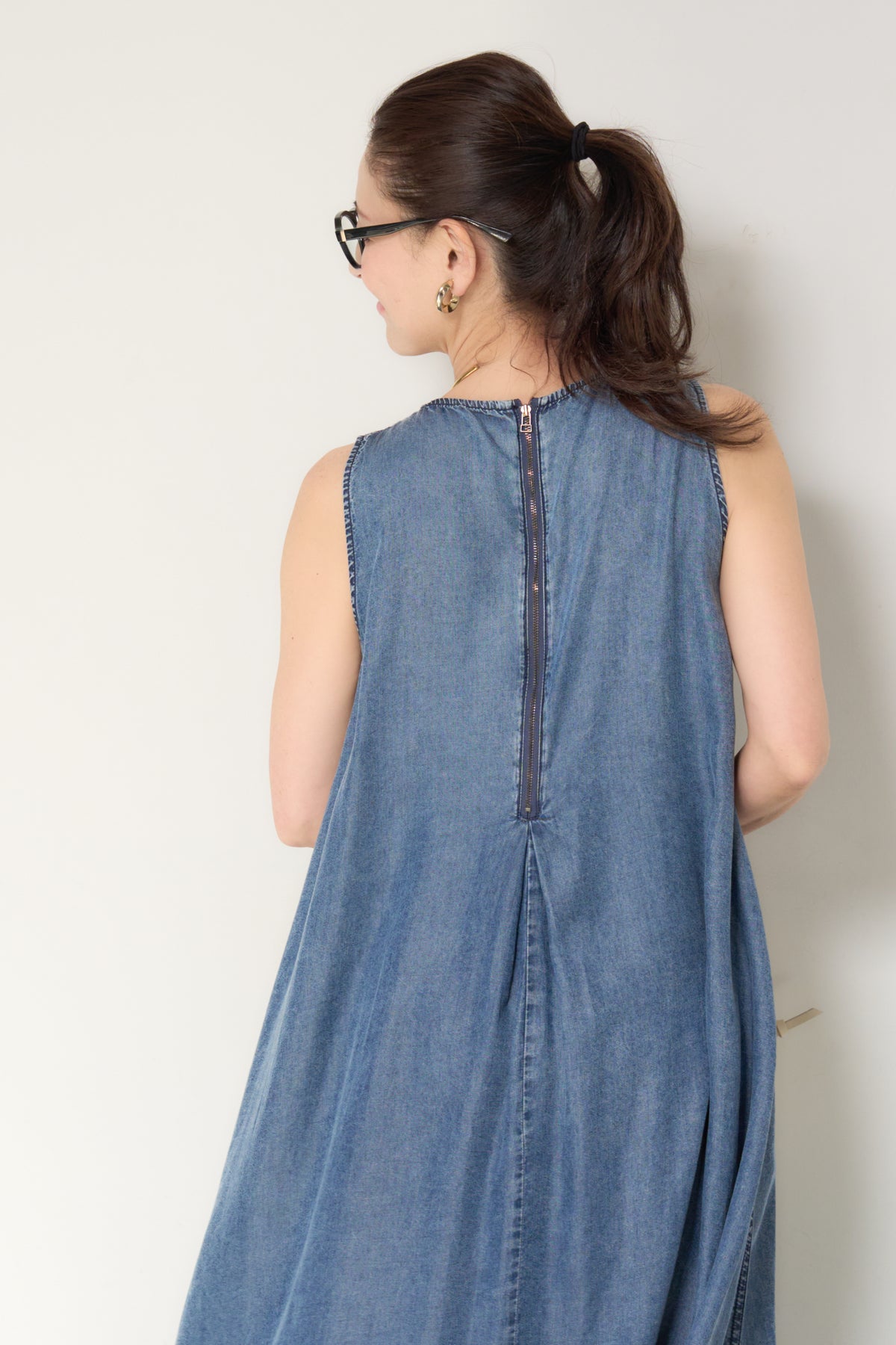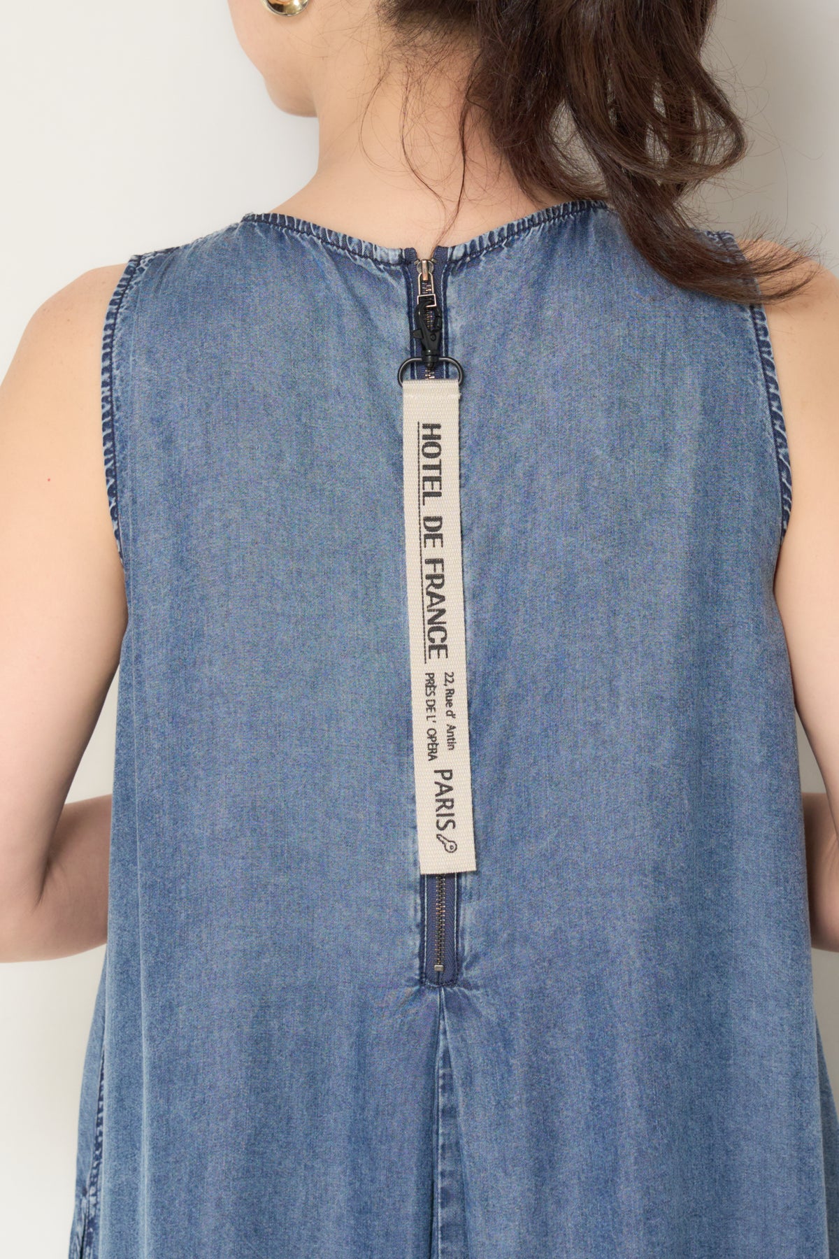 やわらかな風合いと軽やかな着心地が魅力の、パウダーシルクデニムジップワンピース。パウダーシルクのようになめらかなタッチのデニム素材を使用し、カジュアルながらも上品な印象に仕上げた一枚。フロントに入ったタックが自然なドレープを生み出し、身体のラインを拾いにくいゆったりとしたシルエットでリラックス感のある着心地です。バックスタイルにはジップデザインを採用し、長めのロゴテープがアクセントに。後ろ姿まで抜かりなく、シンプルな中にさりげないデザイン性をプラスしています。ノースリーブのすっきりとしたデザインで、サンダルやフラットシューズと合わせるだけで軽やかな大人のカジュアルスタイルが完成。1枚でコーディネートが決まる、デイリーに活躍するデニムワンピースです。