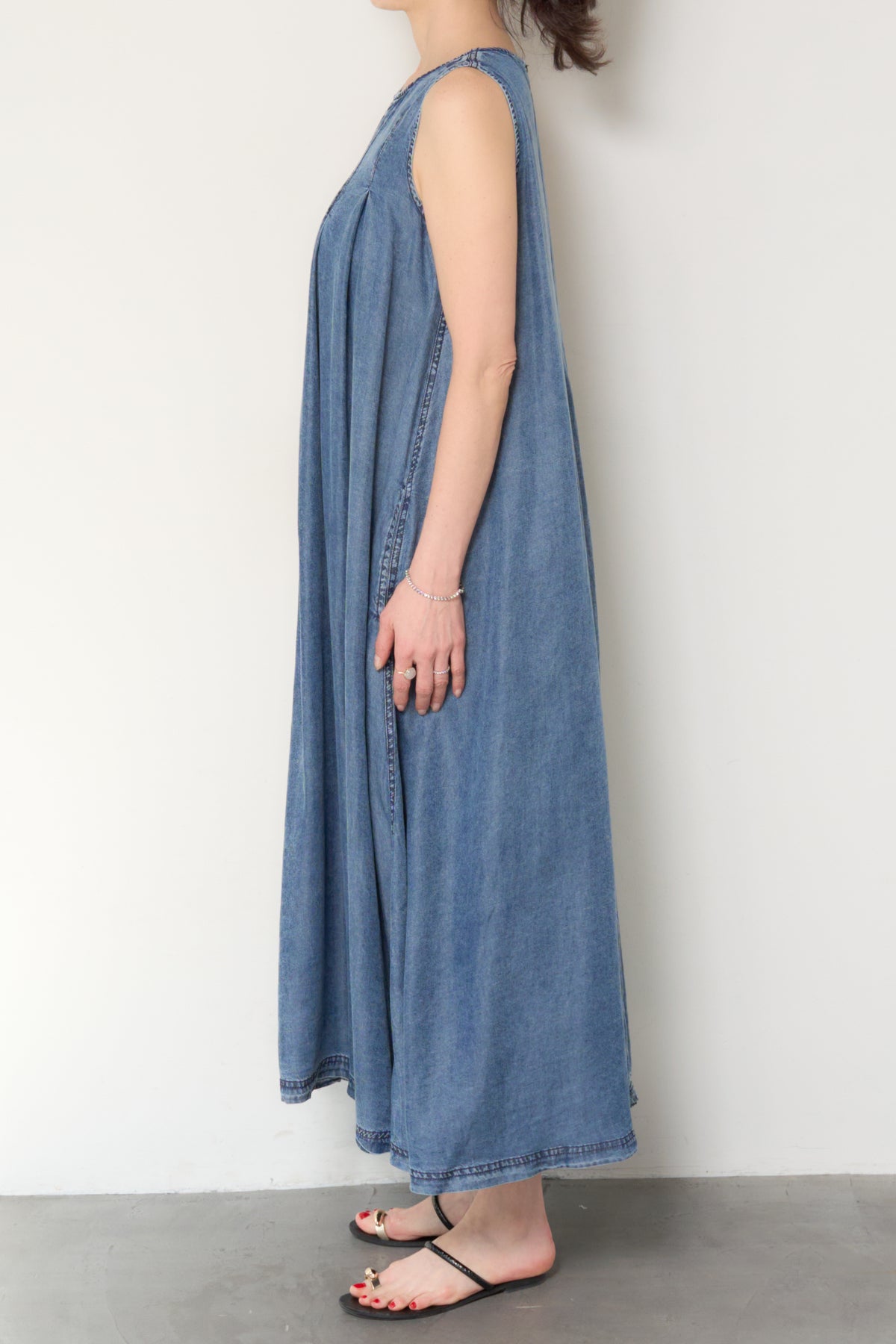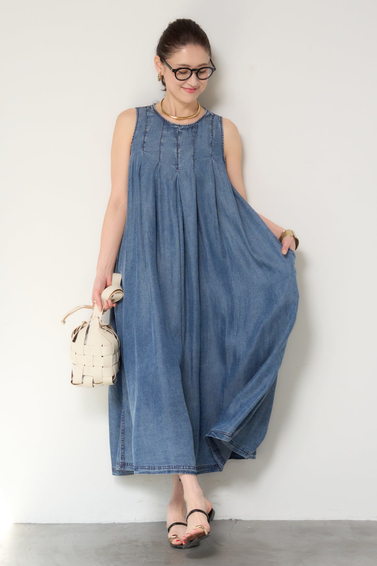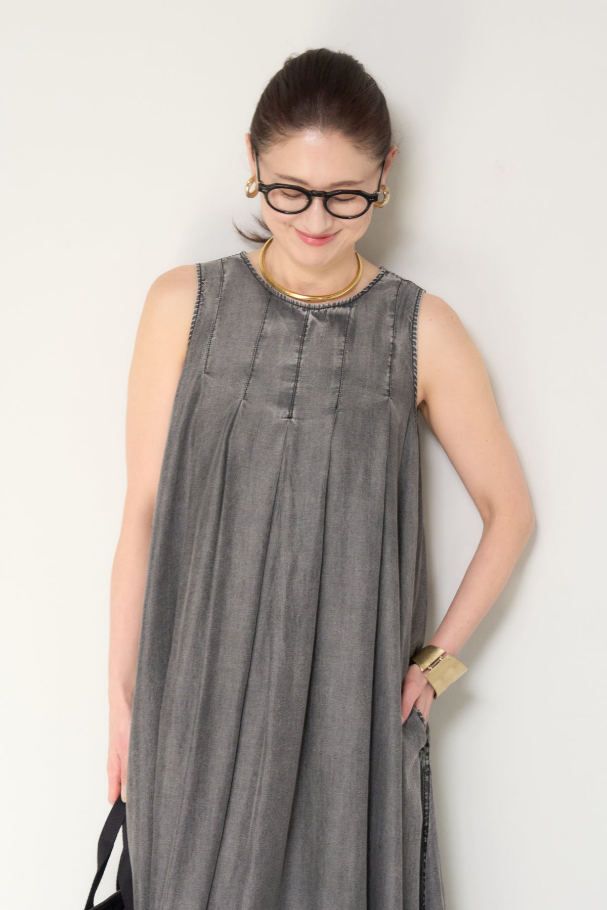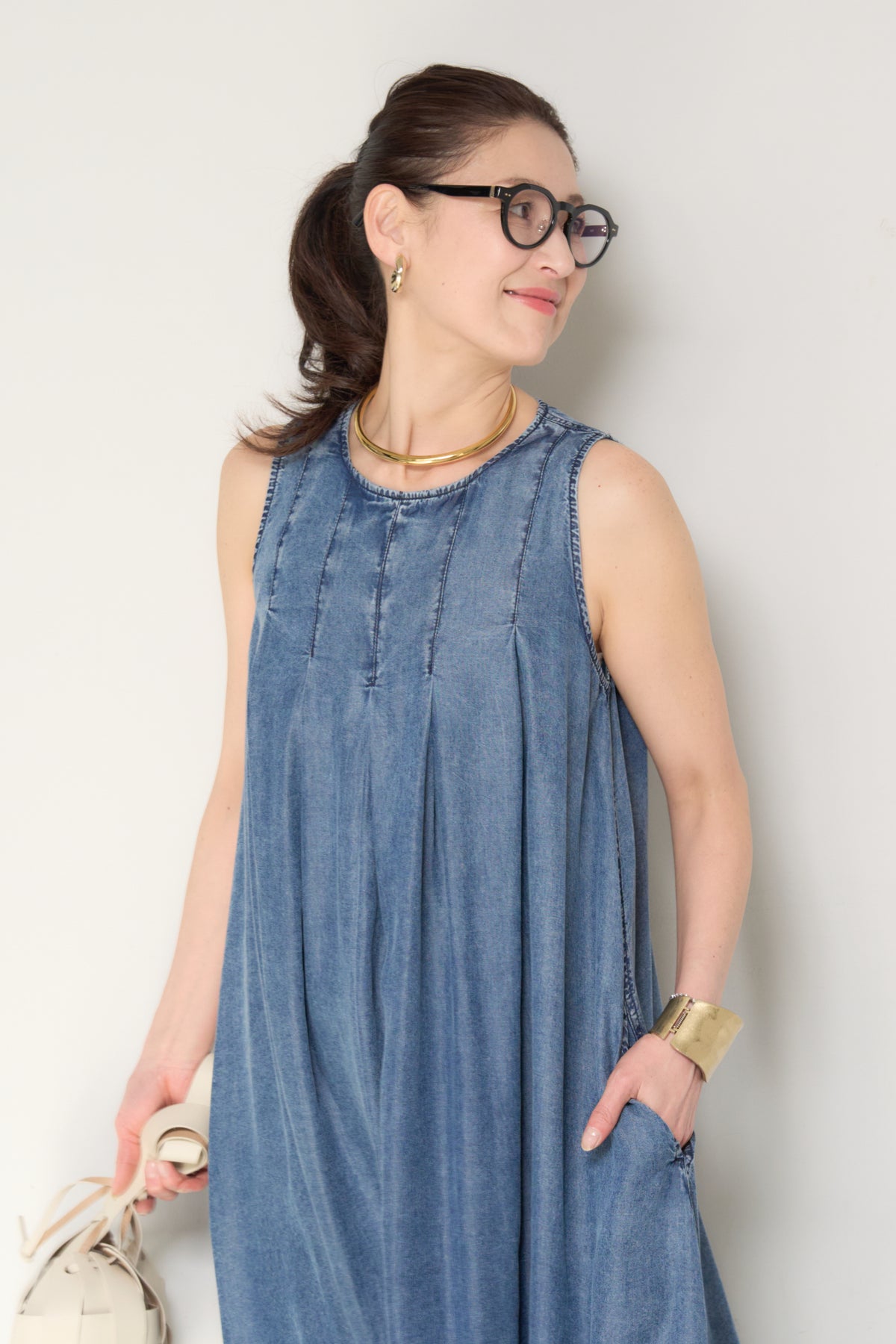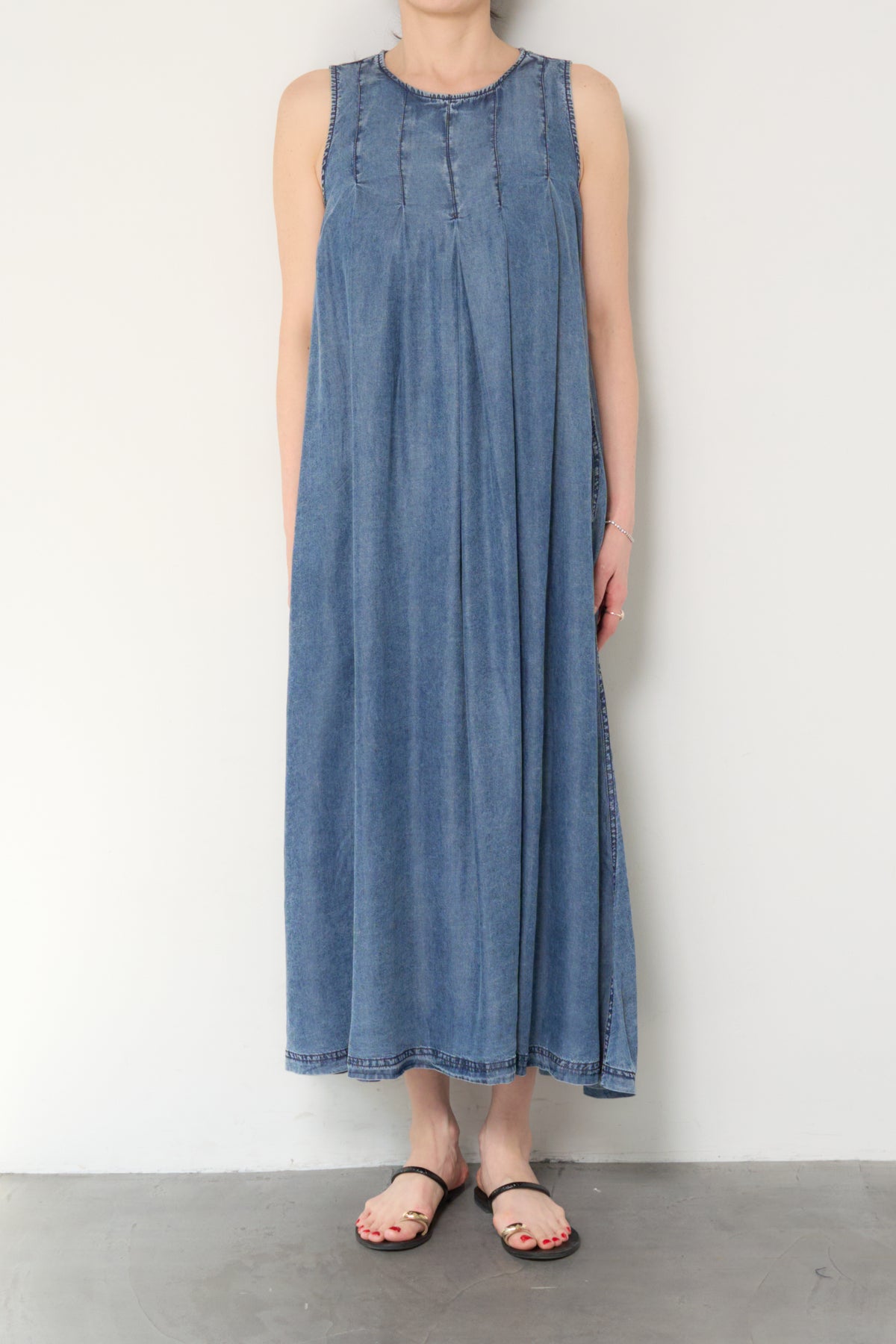 やわらかな風合いと軽やかな着心地が魅力の、パウダーシルクデニムジップワンピース。パウダーシルクのようになめらかなタッチのデニム素材を使用し、カジュアルながらも上品な印象に仕上げた一枚。フロントに入ったタックが自然なドレープを生み出し、身体のラインを拾いにくいゆったりとしたシルエットでリラックス感のある着心地です。バックスタイルにはジップデザインを採用し、長めのロゴテープがアクセントに。後ろ姿まで抜かりなく、シンプルな中にさりげないデザイン性をプラスしています。ノースリーブのすっきりとしたデザインで、サンダルやフラットシューズと合わせるだけで軽やかな大人のカジュアルスタイルが完成。1枚でコーディネートが決まる、デイリーに活躍するデニムワンピースです。