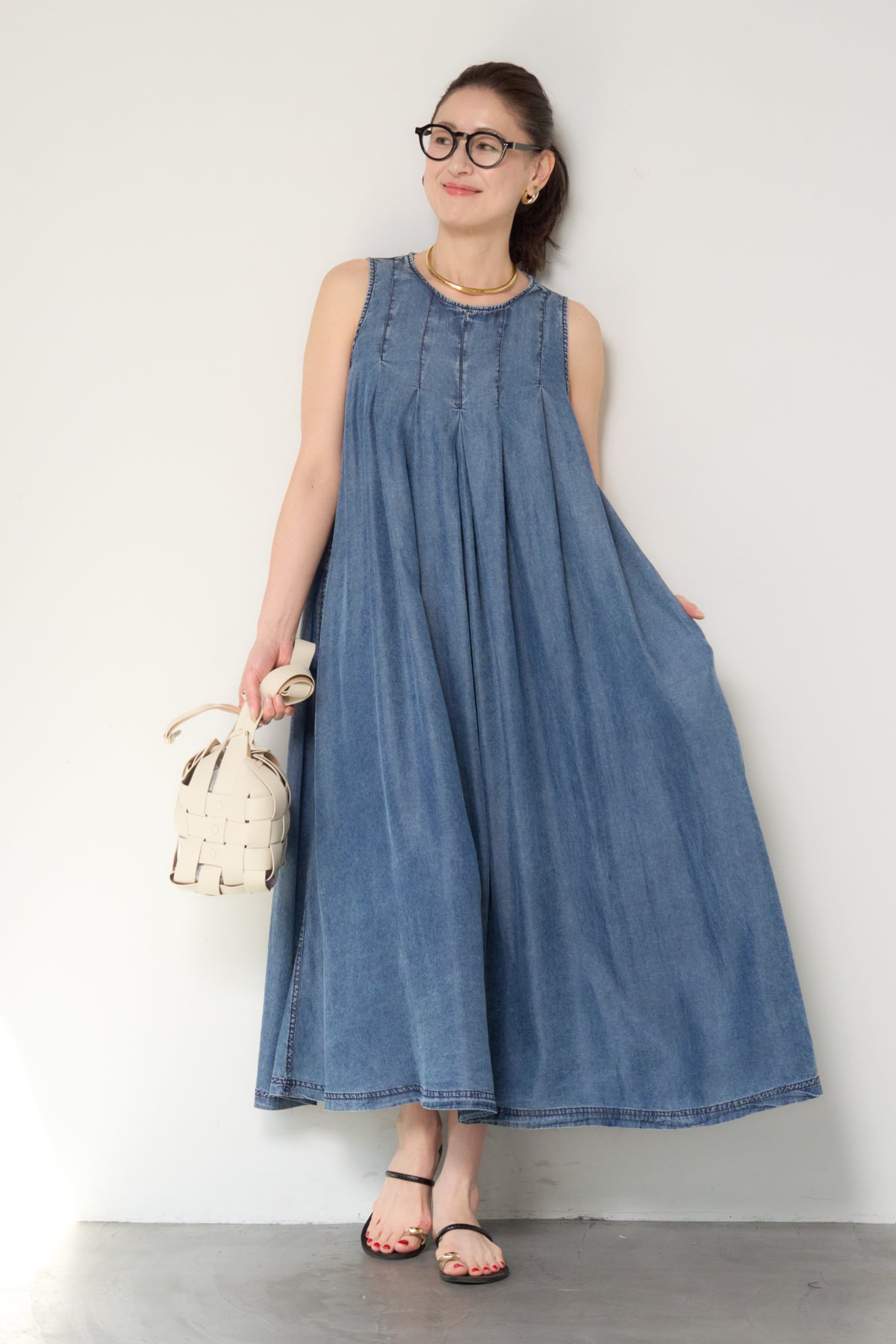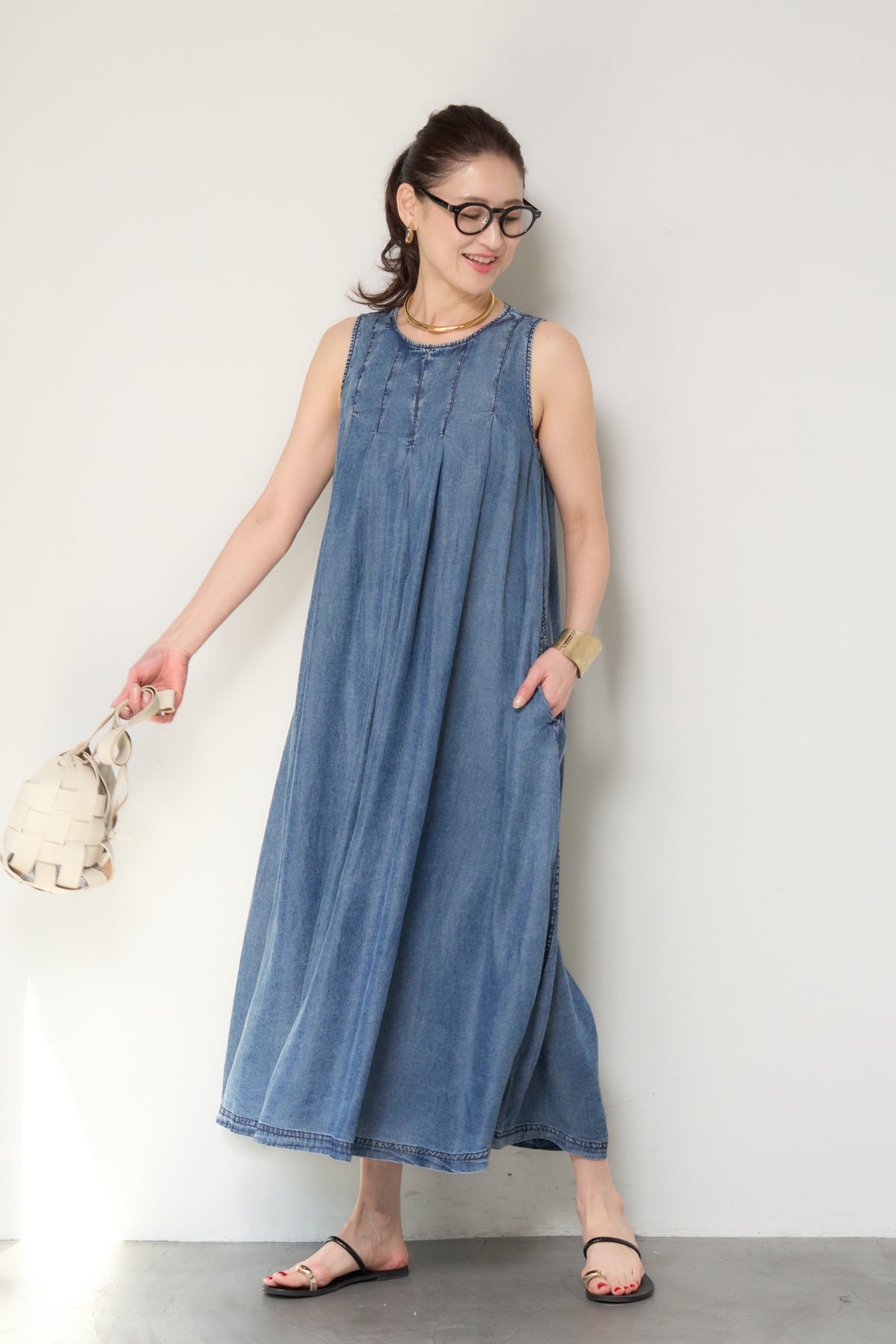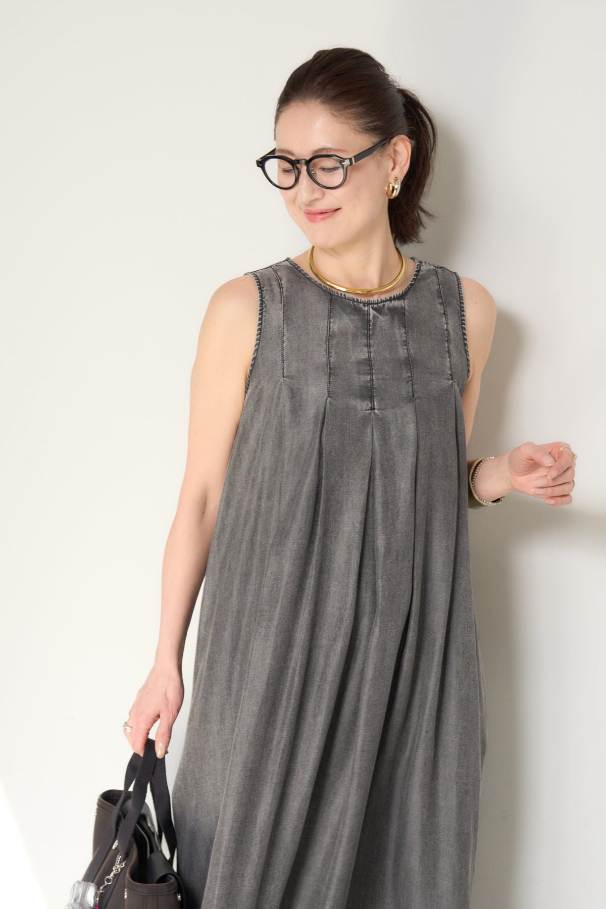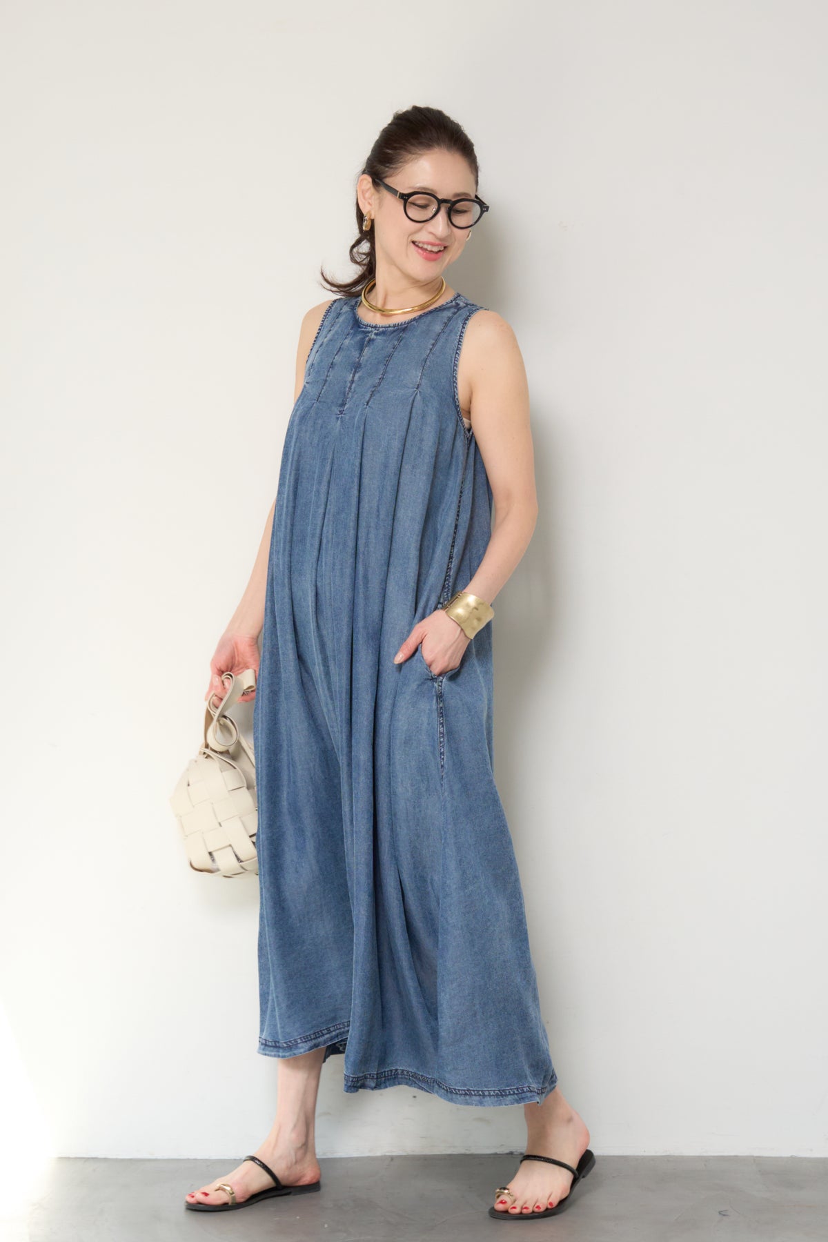 やわらかな風合いと軽やかな着心地が魅力の、パウダーシルクデニムジップワンピース。パウダーシルクのようになめらかなタッチのデニム素材を使用し、カジュアルながらも上品な印象に仕上げた一枚。フロントに入ったタックが自然なドレープを生み出し、身体のラインを拾いにくいゆったりとしたシルエットでリラックス感のある着心地です。バックスタイルにはジップデザインを採用し、長めのロゴテープがアクセントに。後ろ姿まで抜かりなく、シンプルな中にさりげないデザイン性をプラスしています。ノースリーブのすっきりとしたデザインで、サンダルやフラットシューズと合わせるだけで軽やかな大人のカジュアルスタイルが完成。1枚でコーディネートが決まる、デイリーに活躍するデニムワンピースです。