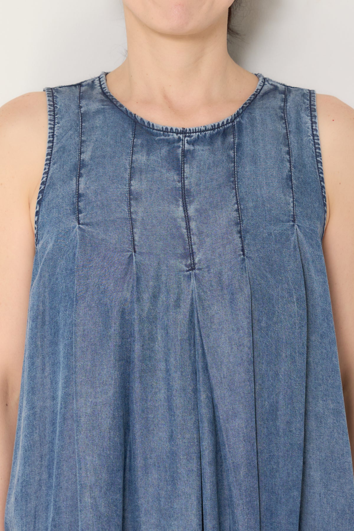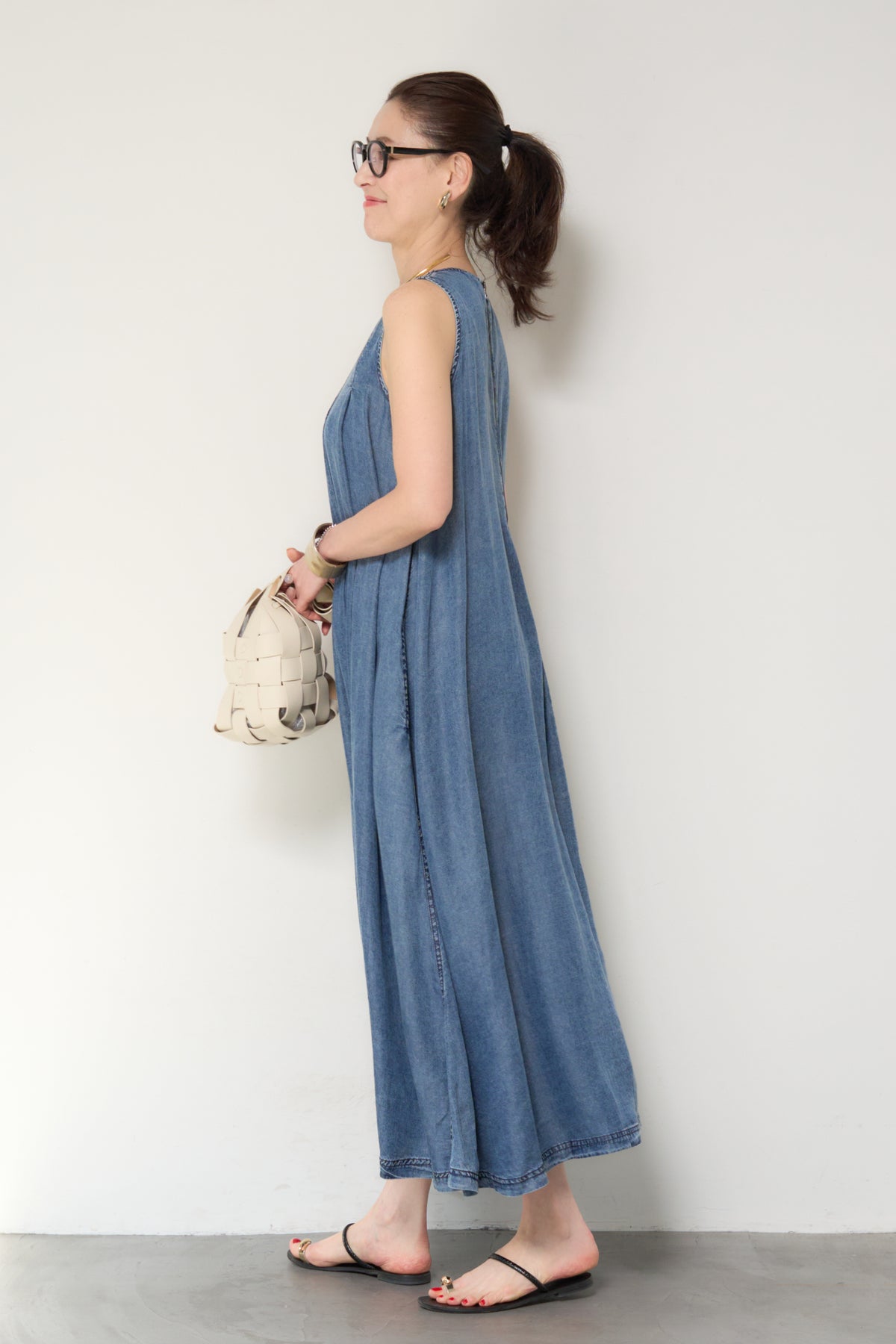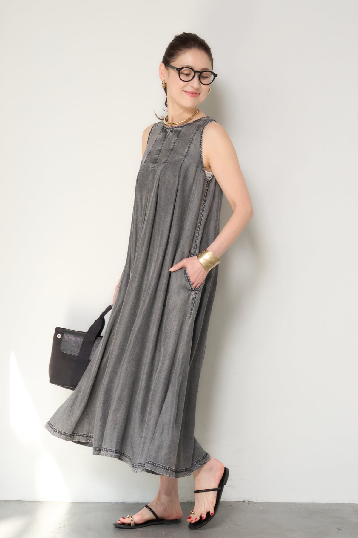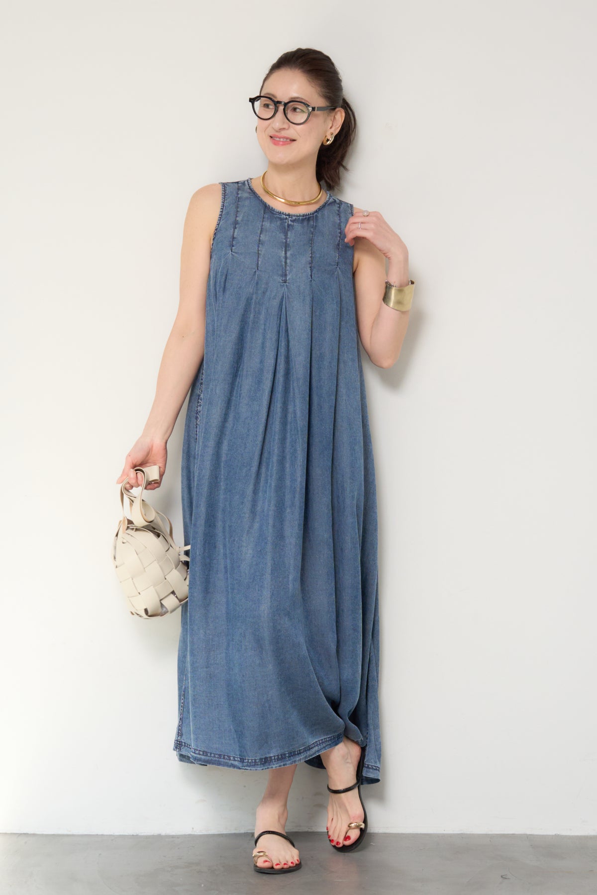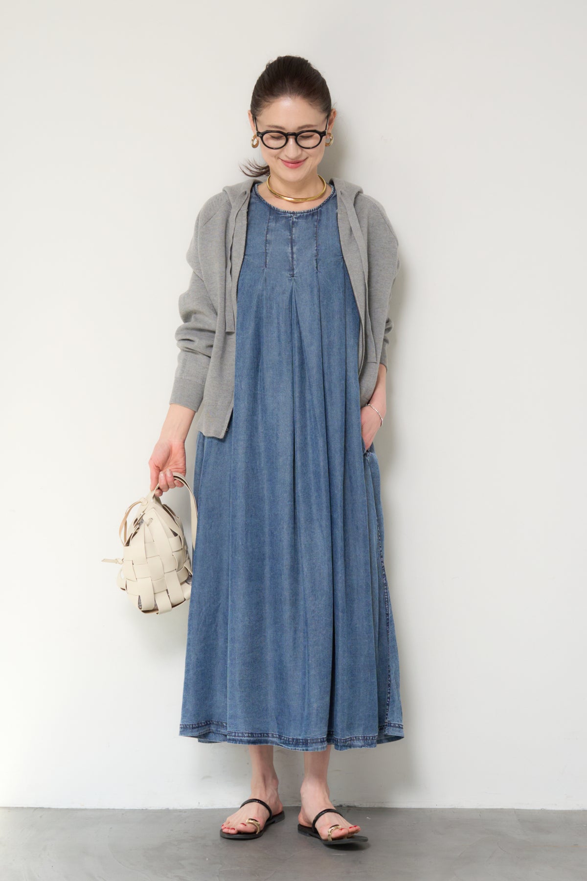 やわらかな風合いと軽やかな着心地が魅力の、パウダーシルクデニムジップワンピース。パウダーシルクのようになめらかなタッチのデニム素材を使用し、カジュアルながらも上品な印象に仕上げた一枚。フロントに入ったタックが自然なドレープを生み出し、身体のラインを拾いにくいゆったりとしたシルエットでリラックス感のある着心地です。バックスタイルにはジップデザインを採用し、長めのロゴテープがアクセントに。後ろ姿まで抜かりなく、シンプルな中にさりげないデザイン性をプラスしています。ノースリーブのすっきりとしたデザインで、サンダルやフラットシューズと合わせるだけで軽やかな大人のカジュアルスタイルが完成。1枚でコーディネートが決まる、デイリーに活躍するデニムワンピースです。