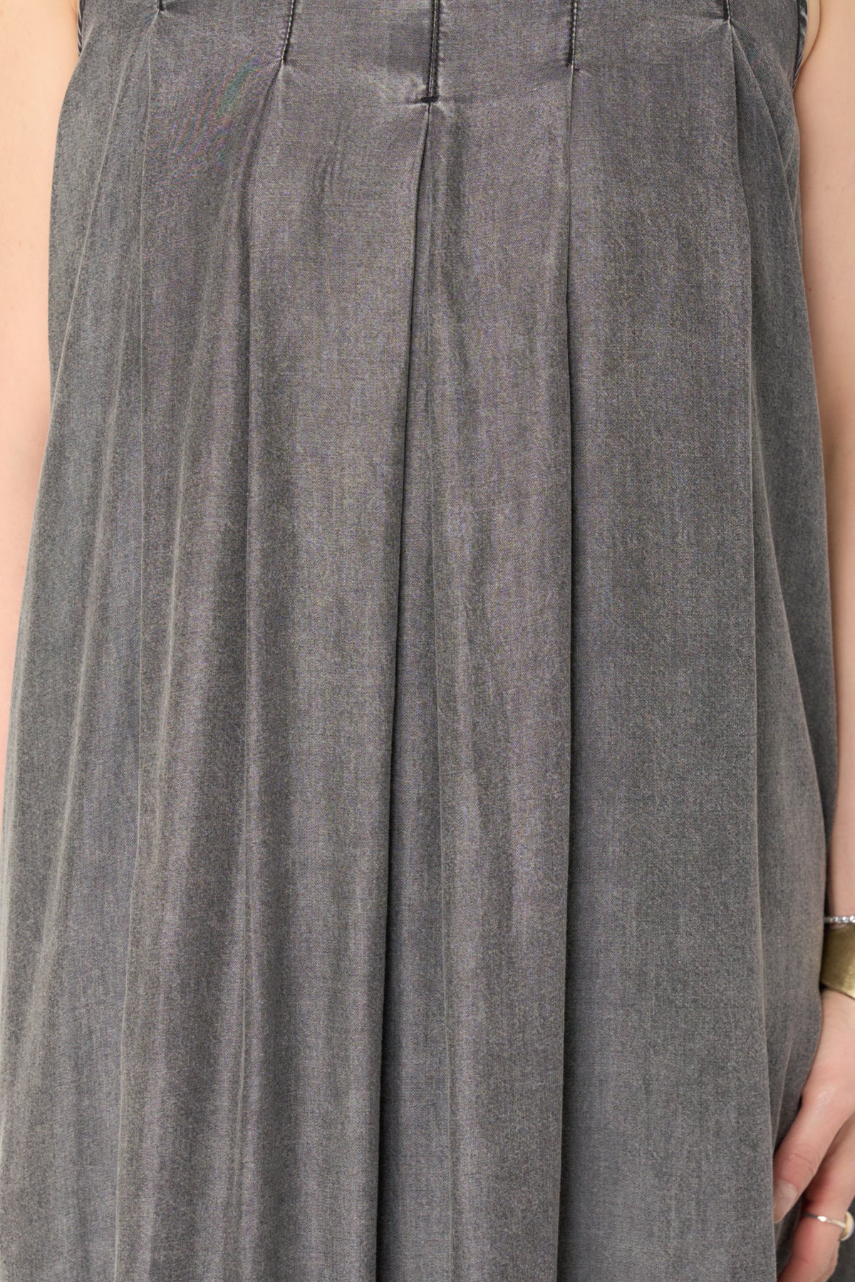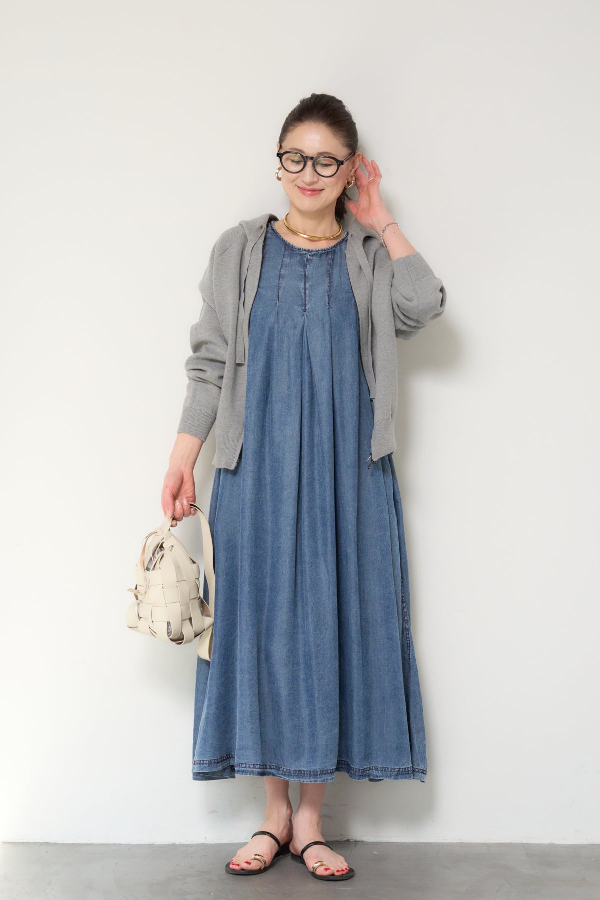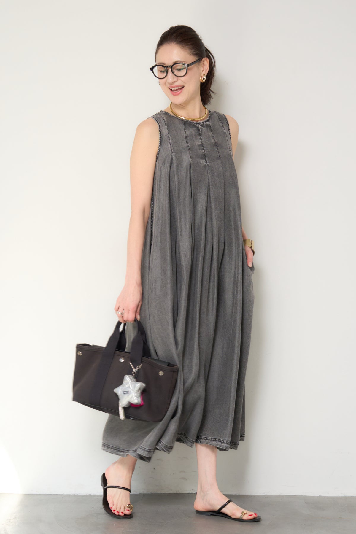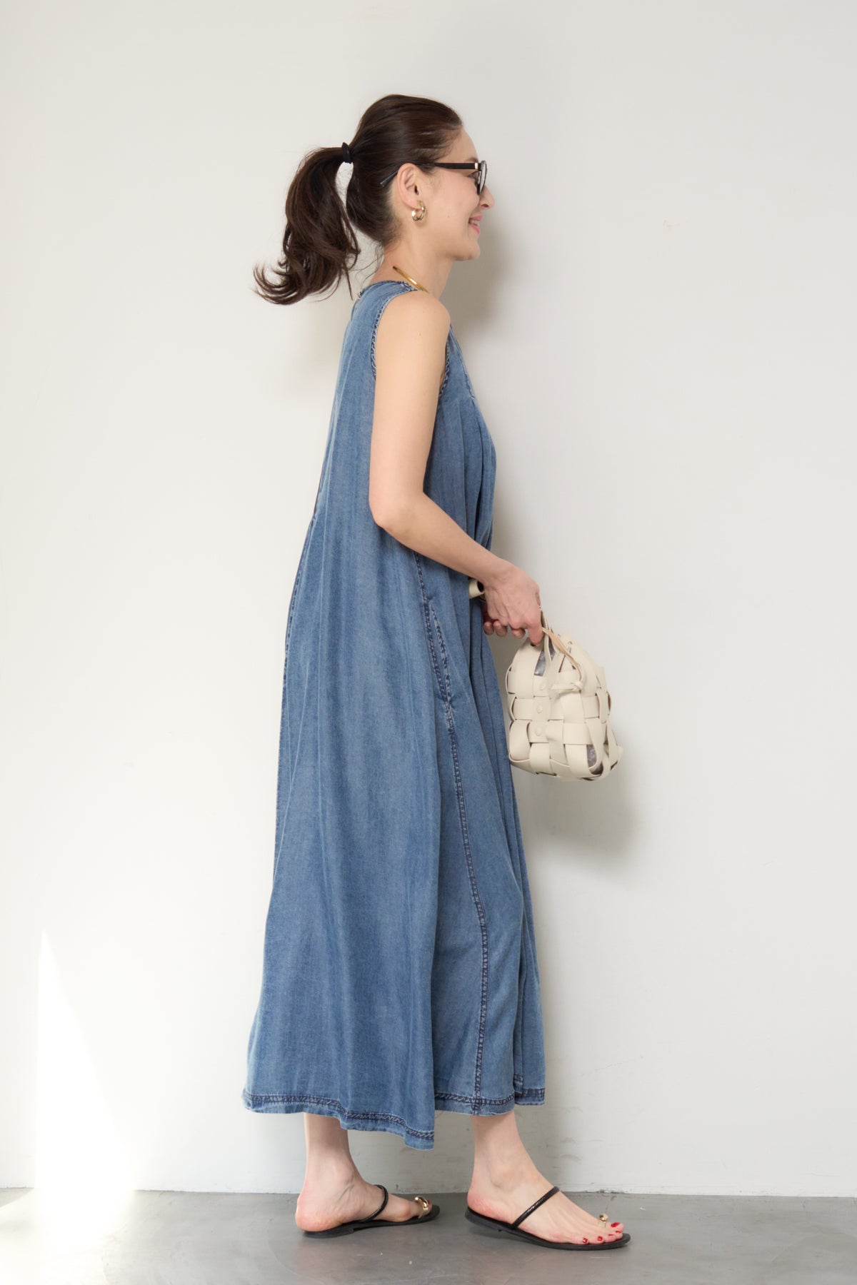 やわらかな風合いと軽やかな着心地が魅力の、パウダーシルクデニムジップワンピース。パウダーシルクのようになめらかなタッチのデニム素材を使用し、カジュアルながらも上品な印象に仕上げた一枚。フロントに入ったタックが自然なドレープを生み出し、身体のラインを拾いにくいゆったりとしたシルエットでリラックス感のある着心地です。バックスタイルにはジップデザインを採用し、長めのロゴテープがアクセントに。後ろ姿まで抜かりなく、シンプルな中にさりげないデザイン性をプラスしています。ノースリーブのすっきりとしたデザインで、サンダルやフラットシューズと合わせるだけで軽やかな大人のカジュアルスタイルが完成。1枚でコーディネートが決まる、デイリーに活躍するデニムワンピースです。