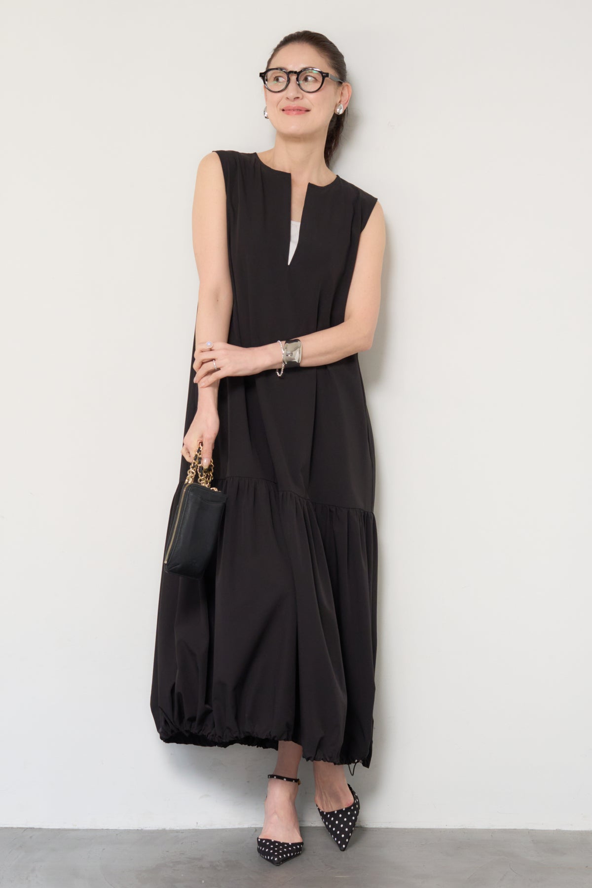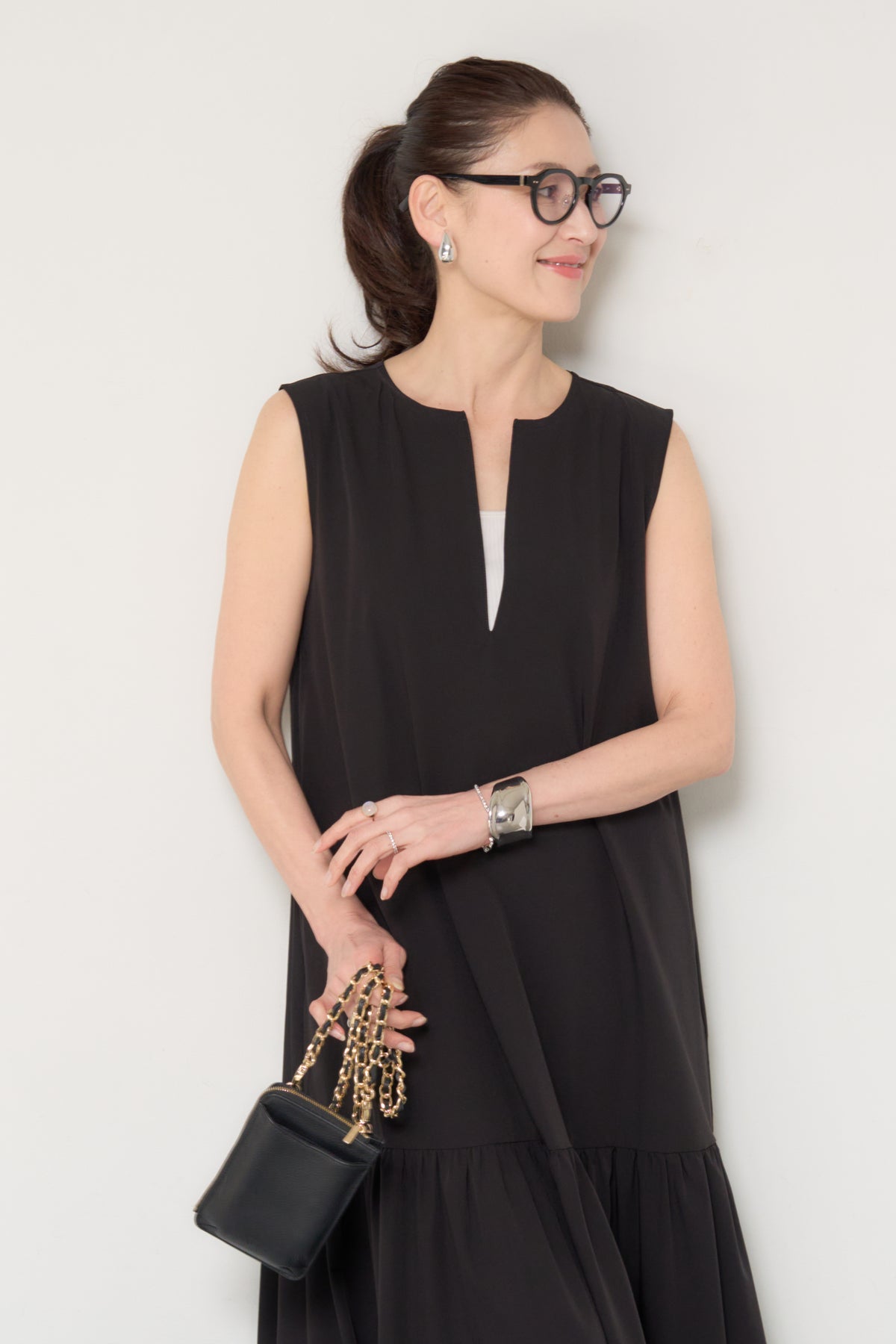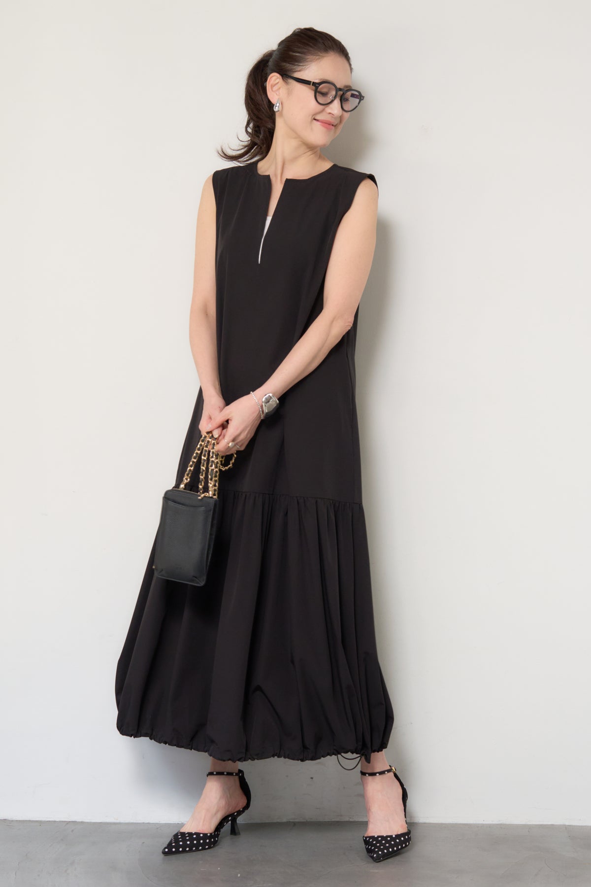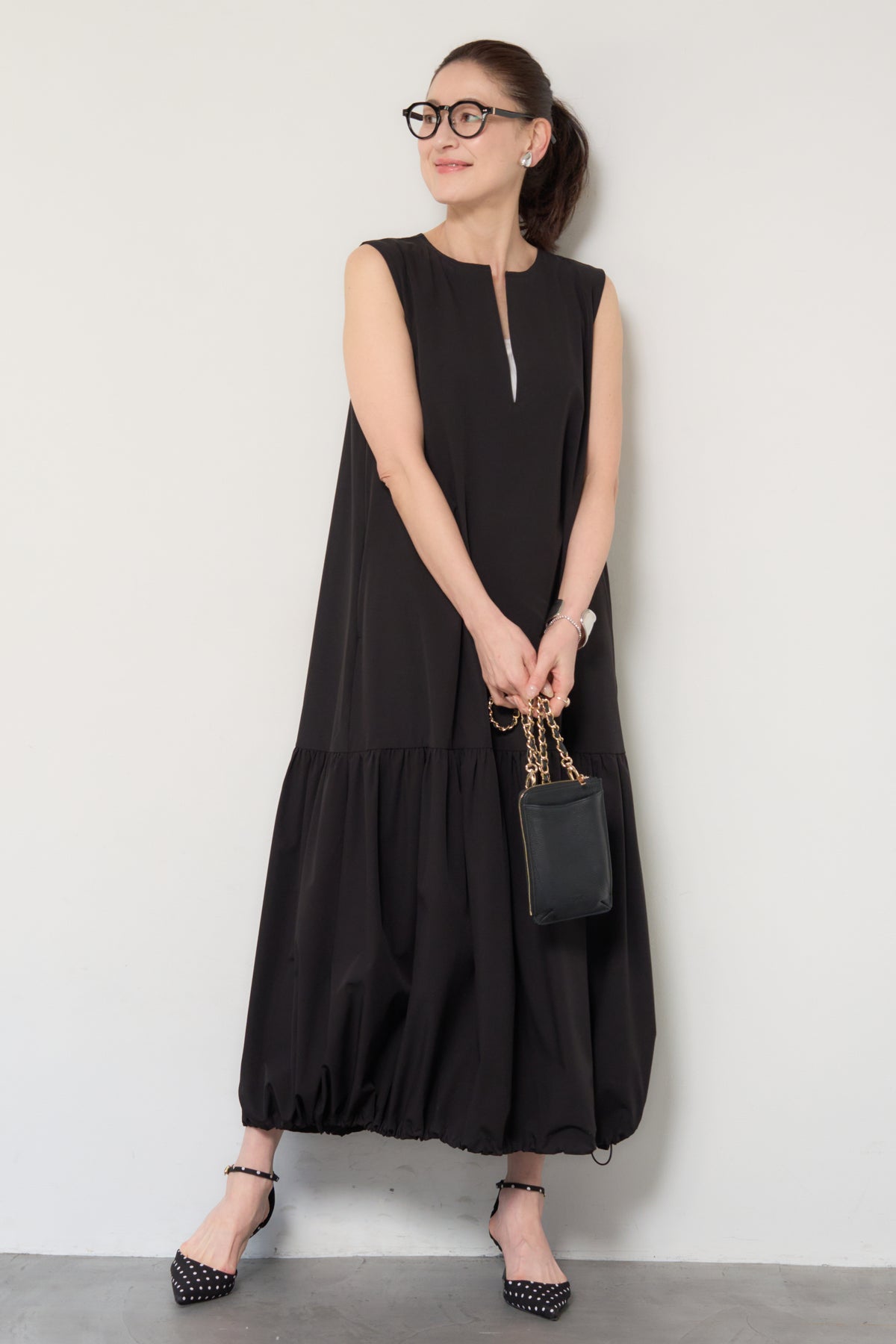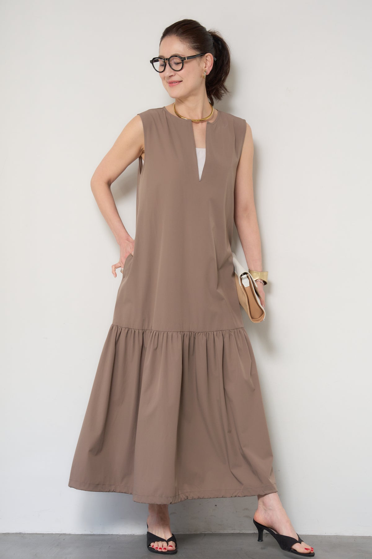 涼しく快適に着られる、【接触冷感】素材のノースリーブワンピース。すっきりとしたキーネックデザインが顔まわりをシャープに見せ、大人っぽく洗練された印象に仕上げてくれる一枚。身頃はゆとりのあるシルエットで身体のラインを拾いにくく、リラックス感のある着心地ながら上品な雰囲気を演出します。裾には切り替えを入れたヘムデザインを採用し、動くたびにふんわりと揺れる立体的なシルエットが魅力。裾部分にはドロストで変化をつけられる2WAY仕様で、気分やスタイリングに合わせて印象を変えて楽しめます。さらに、ひんやりとした肌触りの接触冷感素材を使用しているため、暑い季節でも快適な着心地。両サイドには便利なポケット付きで、デイリーにもお出かけにも活躍します。