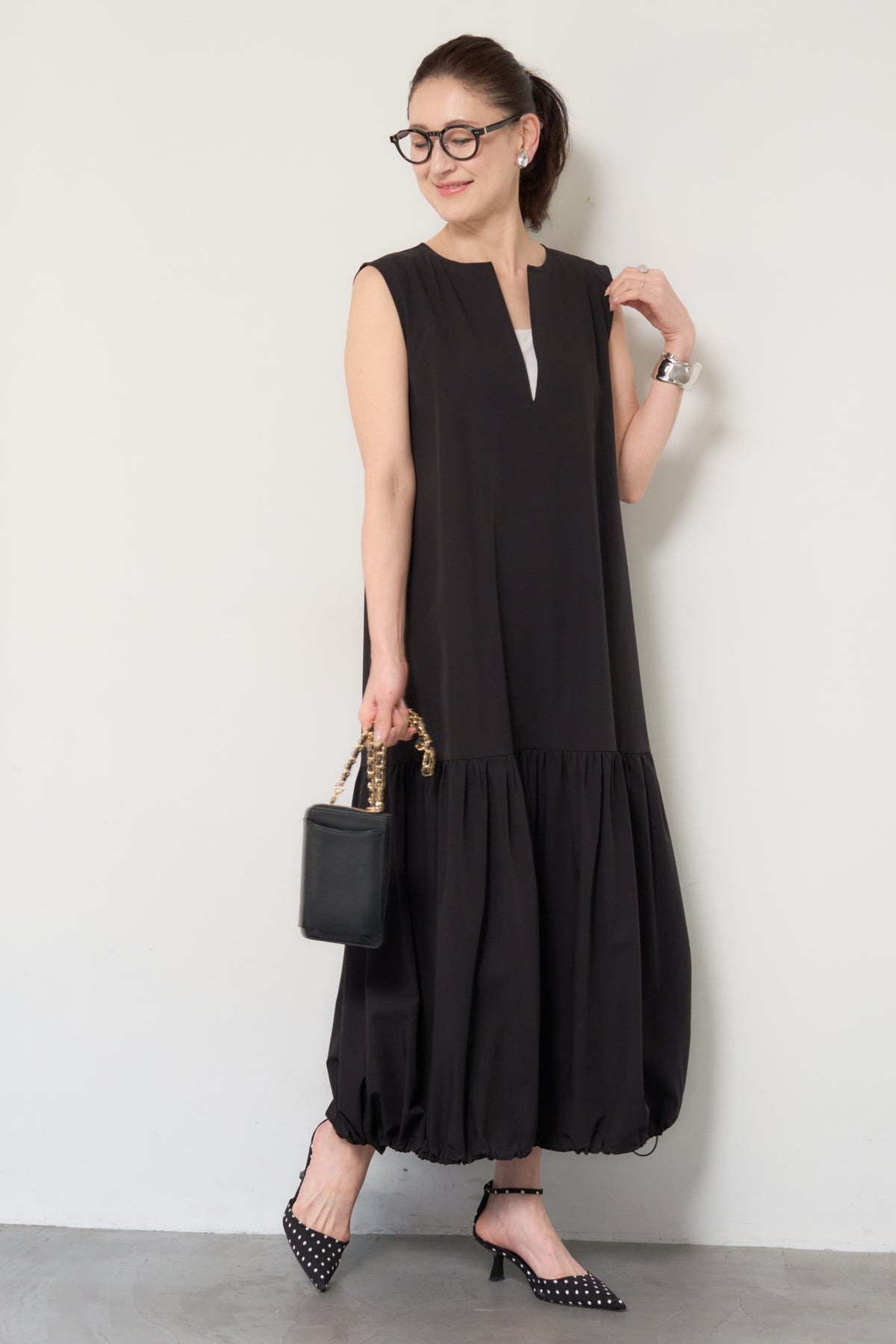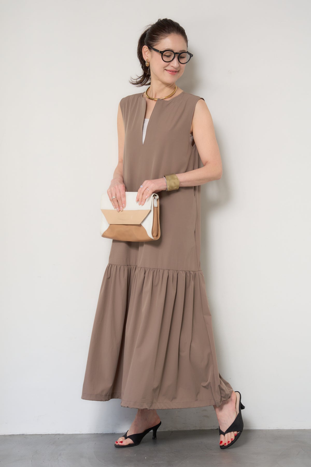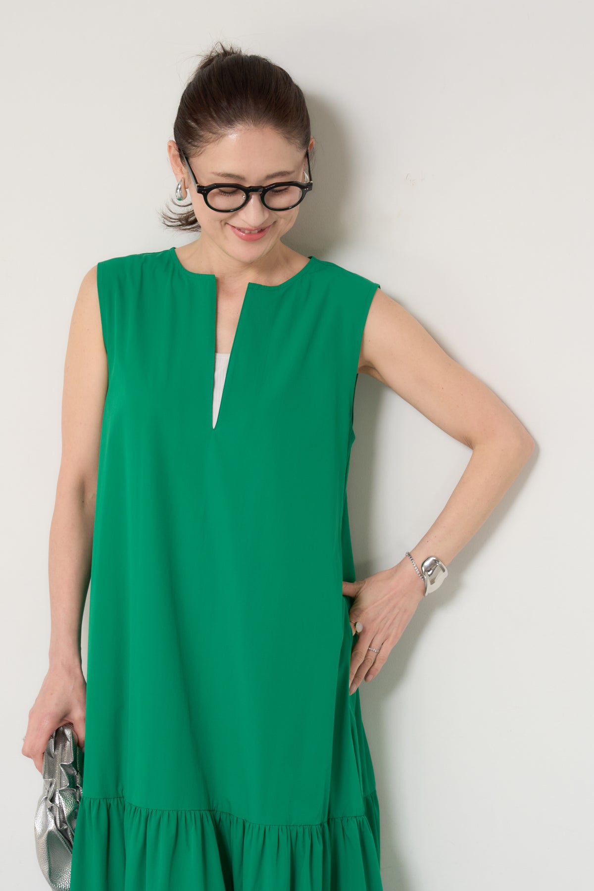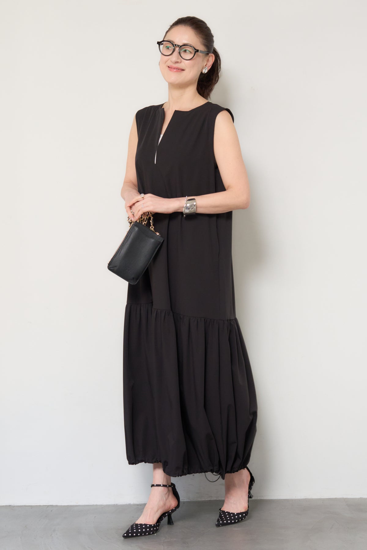 涼しく快適に着られる、【接触冷感】素材のノースリーブワンピース。すっきりとしたキーネックデザインが顔まわりをシャープに見せ、大人っぽく洗練された印象に仕上げてくれる一枚。身頃はゆとりのあるシルエットで身体のラインを拾いにくく、リラックス感のある着心地ながら上品な雰囲気を演出します。裾には切り替えを入れたヘムデザインを採用し、動くたびにふんわりと揺れる立体的なシルエットが魅力。裾部分にはドロストで変化をつけられる2WAY仕様で、気分やスタイリングに合わせて印象を変えて楽しめます。さらに、ひんやりとした肌触りの接触冷感素材を使用しているため、暑い季節でも快適な着心地。両サイドには便利なポケット付きで、デイリーにもお出かけにも活躍します。