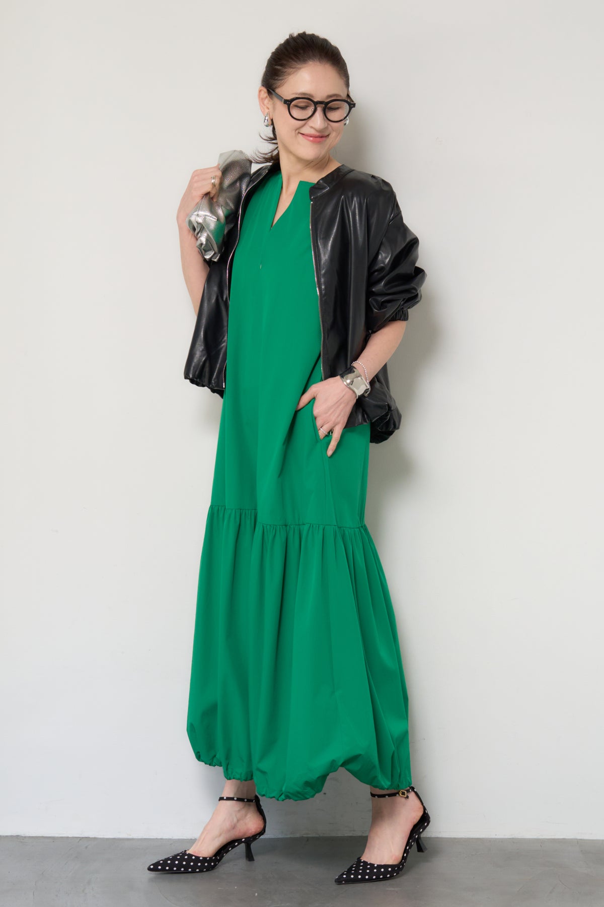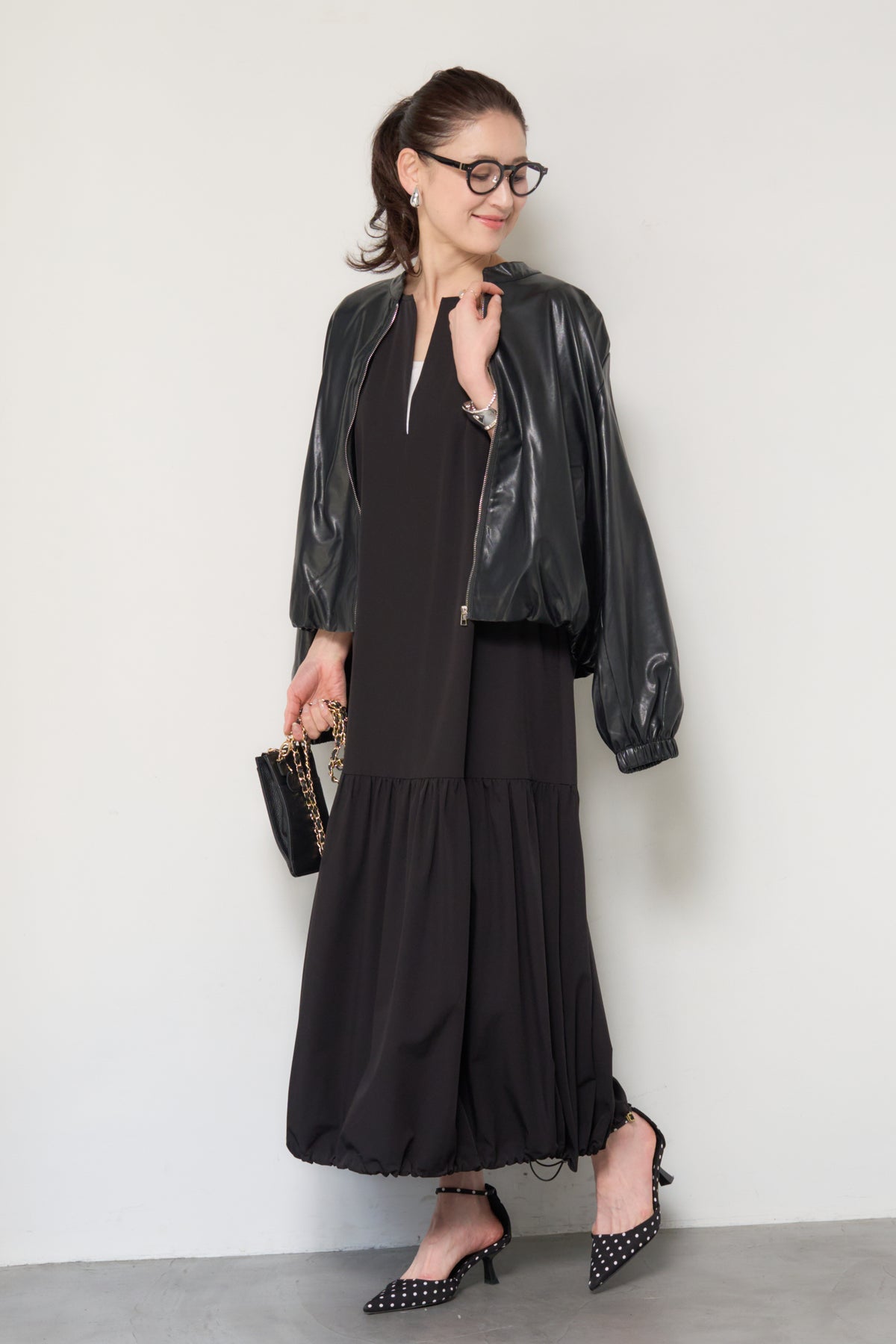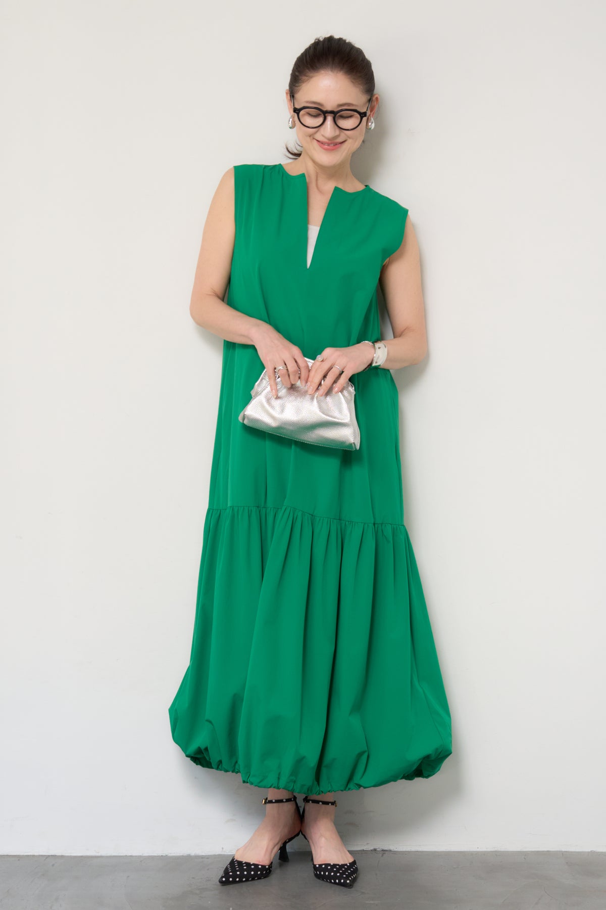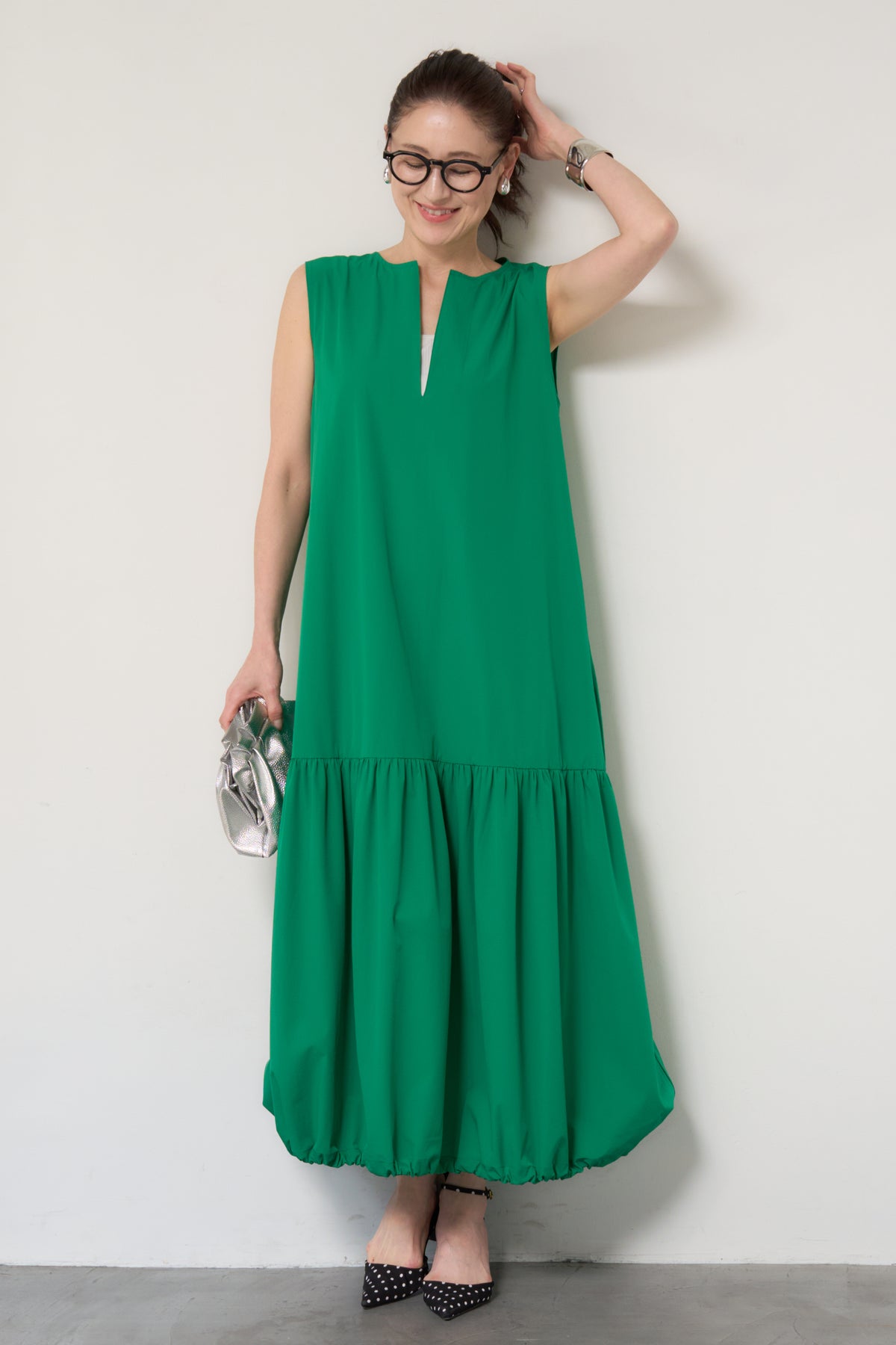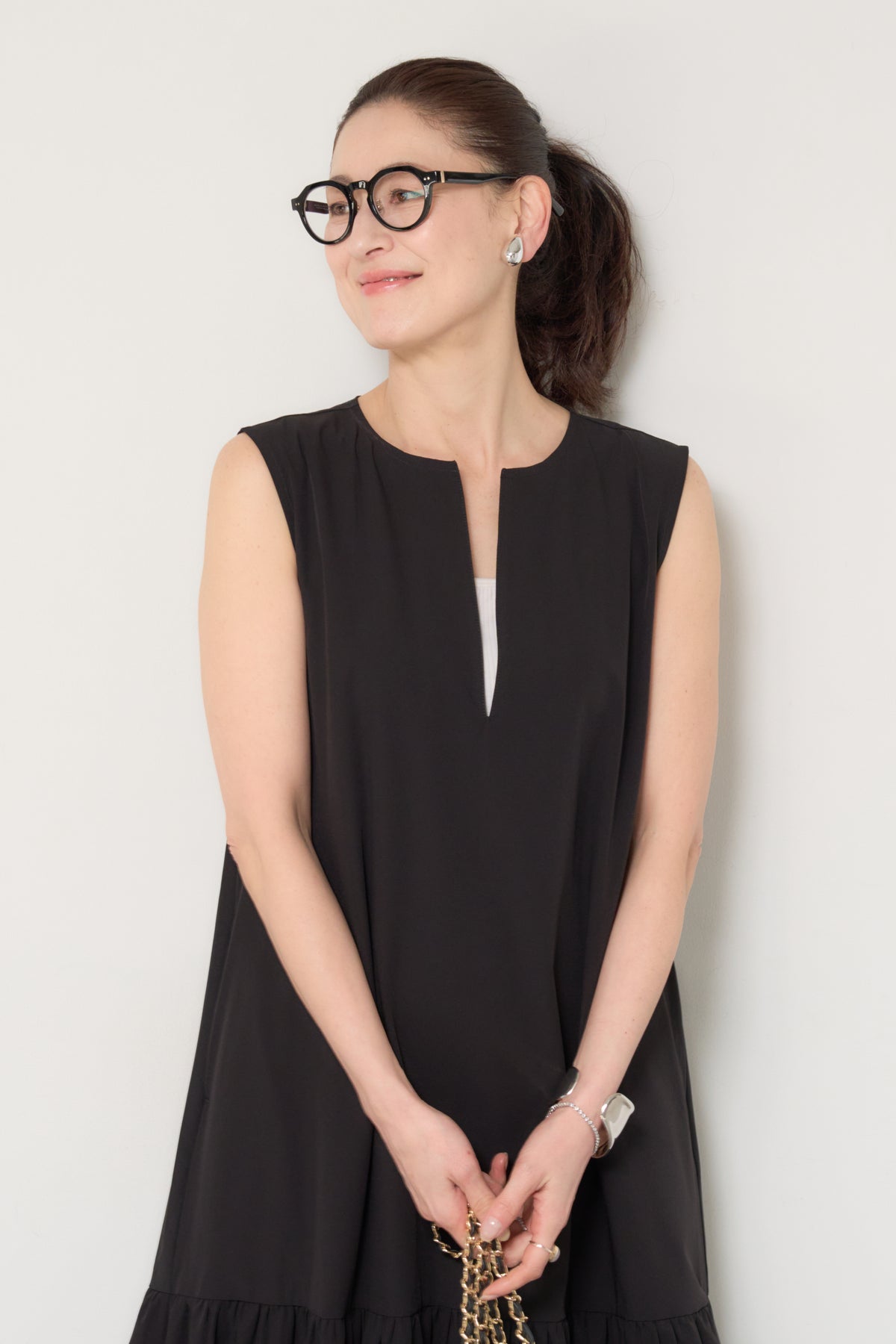 涼しく快適に着られる、【接触冷感】素材のノースリーブワンピース。すっきりとしたキーネックデザインが顔まわりをシャープに見せ、大人っぽく洗練された印象に仕上げてくれる一枚。身頃はゆとりのあるシルエットで身体のラインを拾いにくく、リラックス感のある着心地ながら上品な雰囲気を演出します。裾には切り替えを入れたヘムデザインを採用し、動くたびにふんわりと揺れる立体的なシルエットが魅力。裾部分にはドロストで変化をつけられる2WAY仕様で、気分やスタイリングに合わせて印象を変えて楽しめます。さらに、ひんやりとした肌触りの接触冷感素材を使用しているため、暑い季節でも快適な着心地。両サイドには便利なポケット付きで、デイリーにもお出かけにも活躍します。