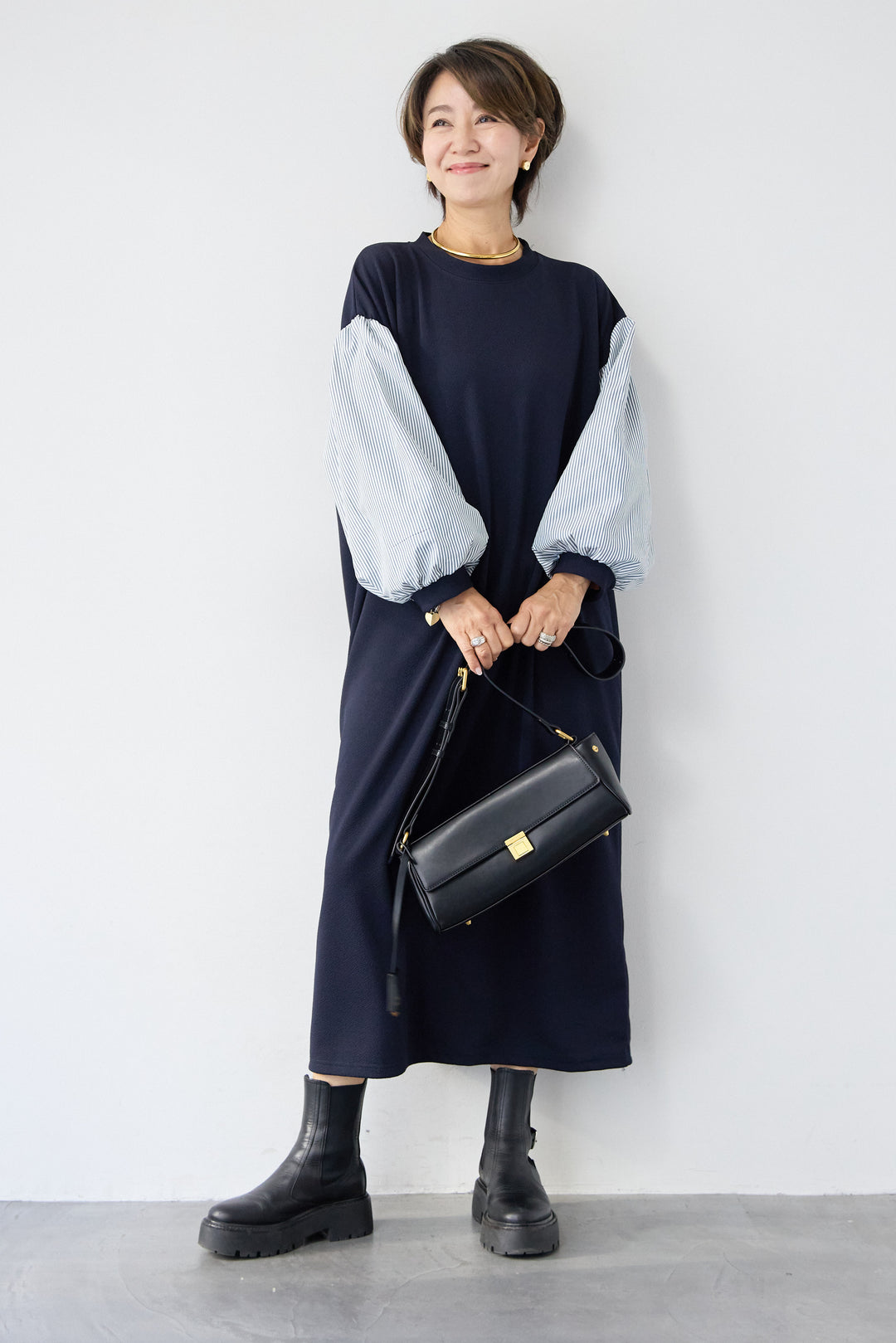 ストライプボリュームスリーブ カットワンピース