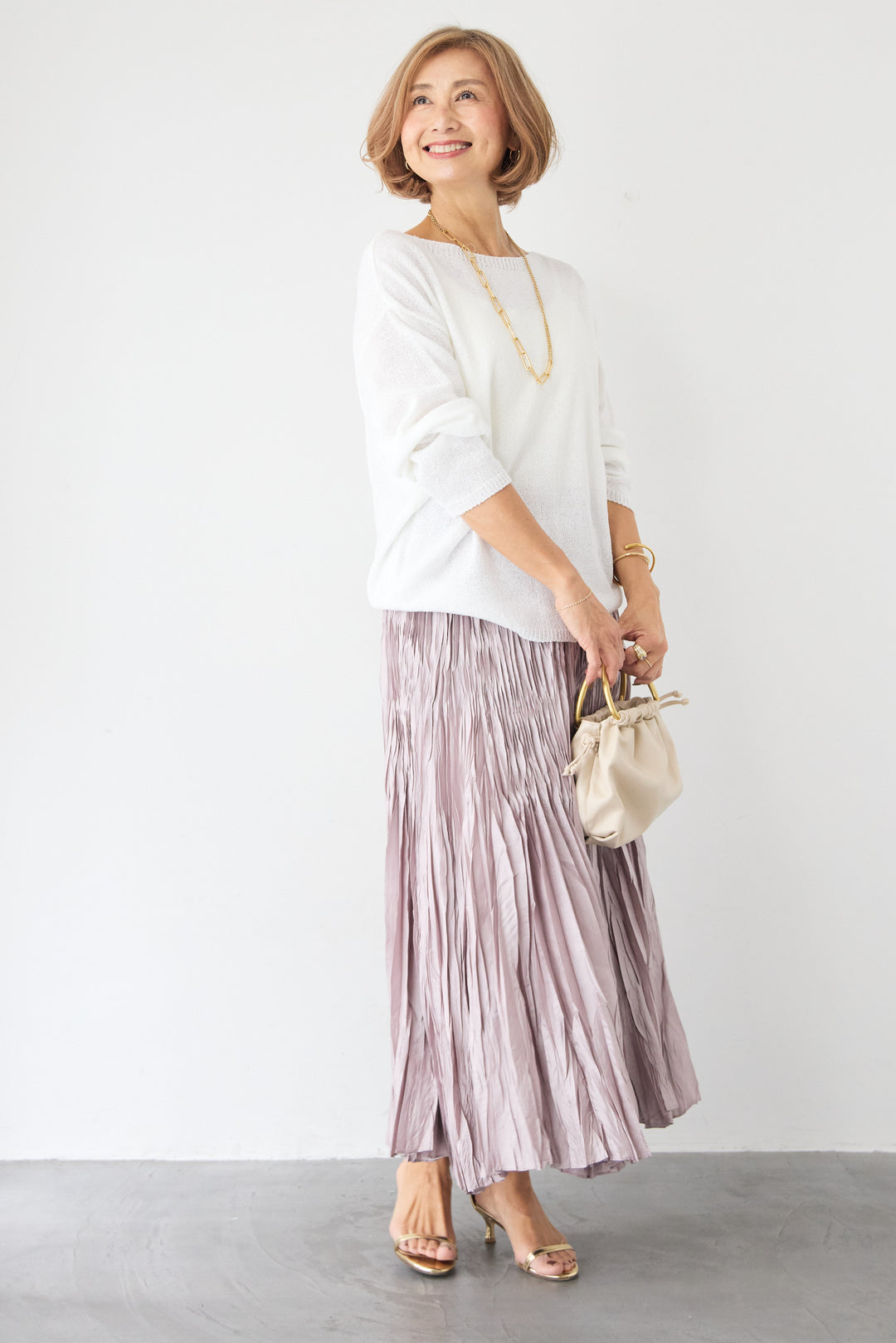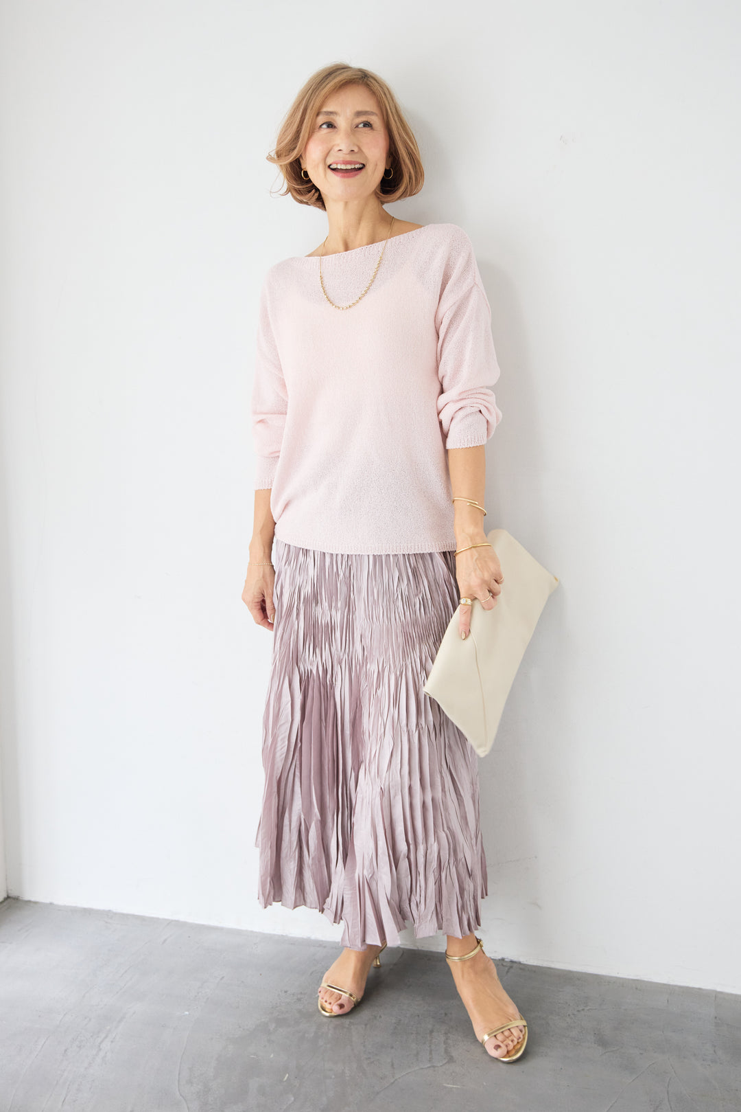 [SET]ボートネック シアーニット プルオーバー+シルキーワッシャー・エアリーマキシスカート(2set)